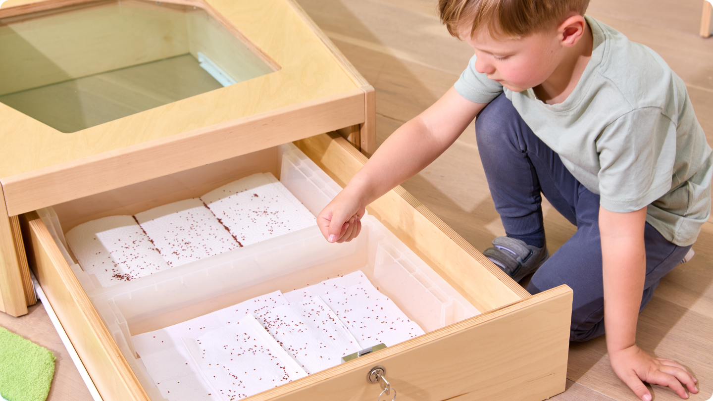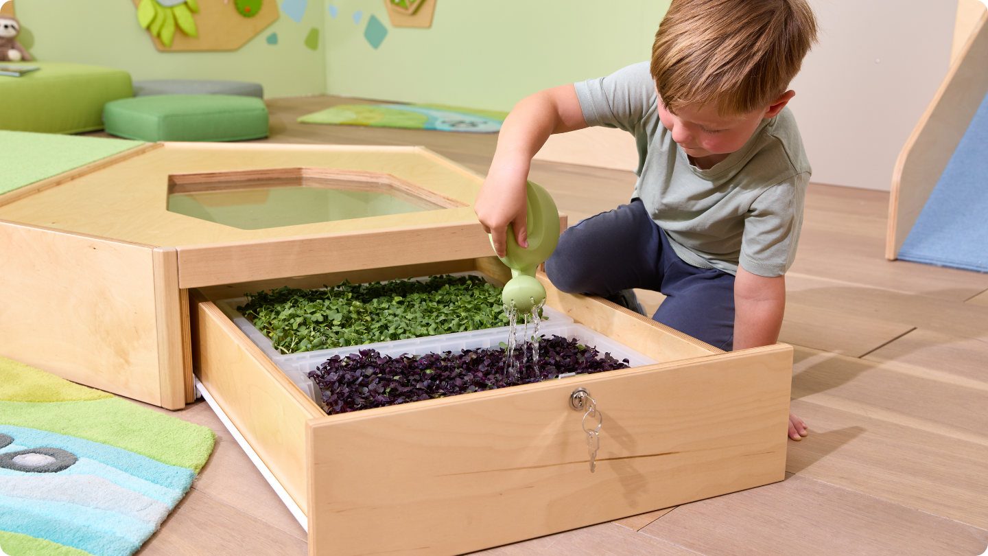 Met het vitrinepodium plaats je een spannende ervaring voor alle zintuigen centraal in het dagelijks leven van de kinderopvang! Tuinkers groeit ontzettend snel en kan heel eenvoudig in het vitrinepodium worden geplant – zo zien de kinderen de vooruitgang meteen!