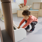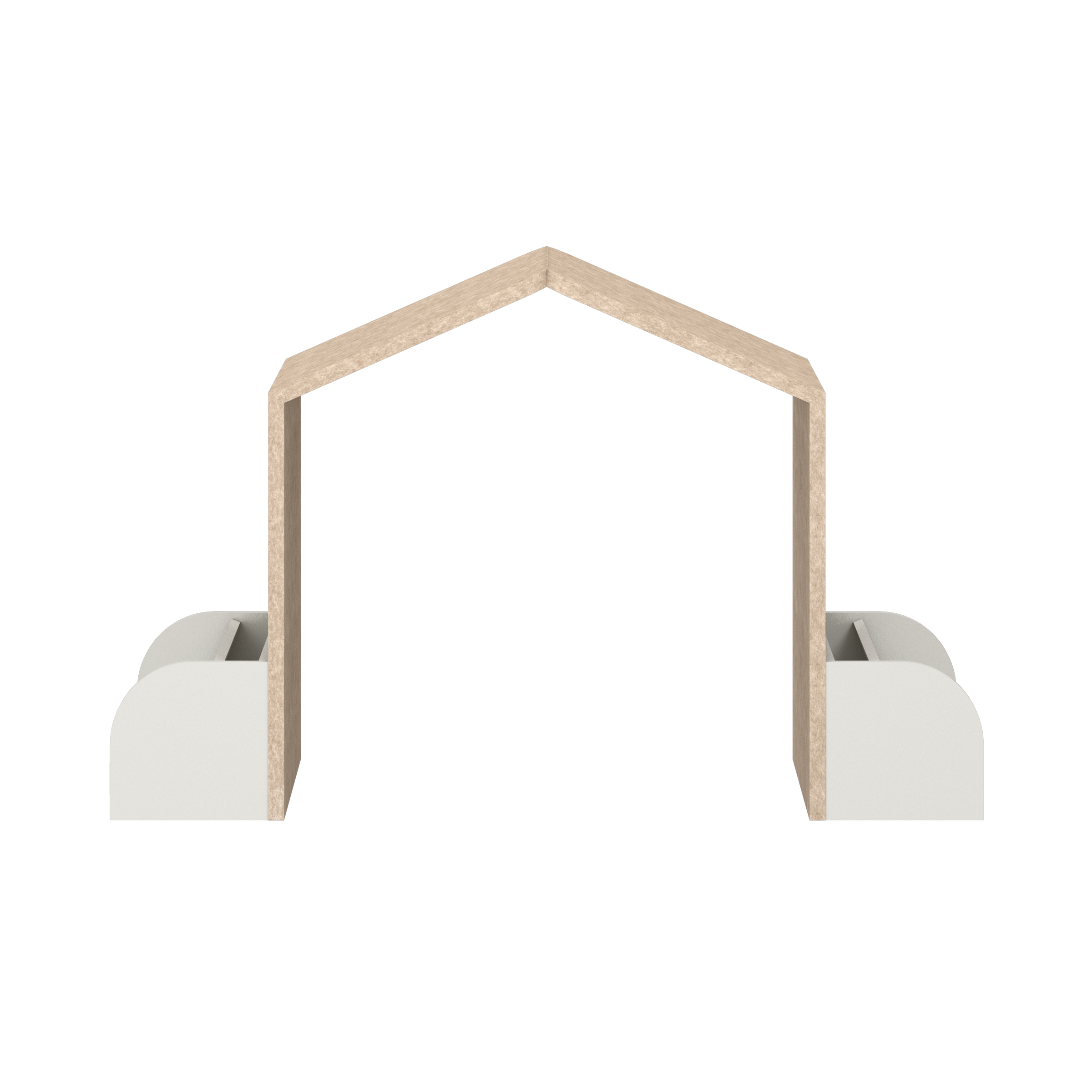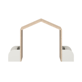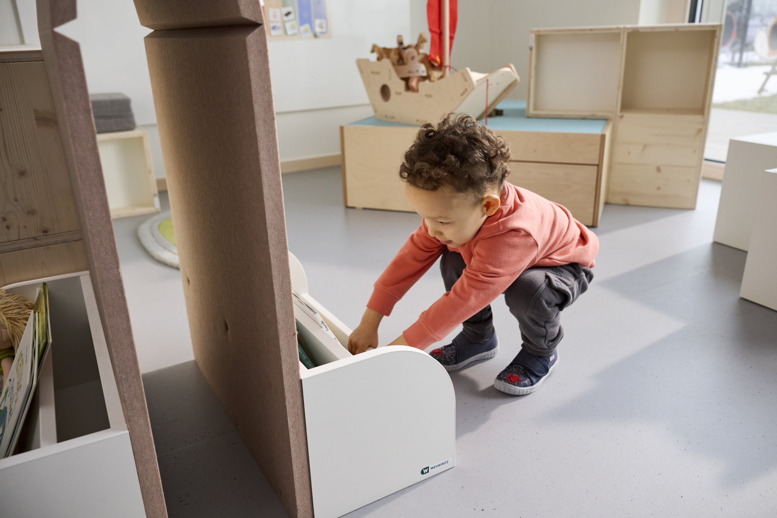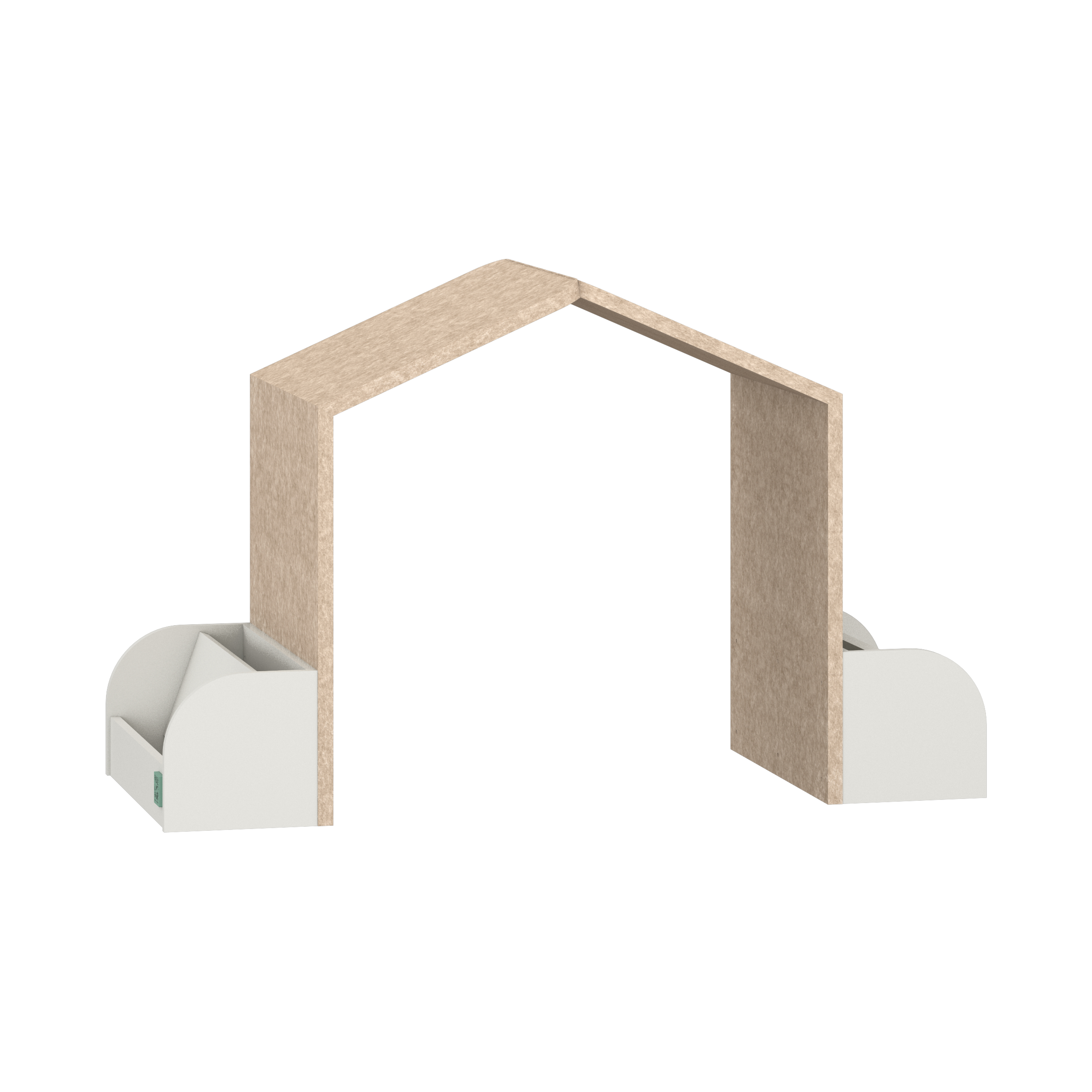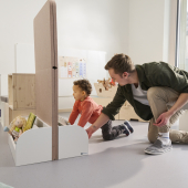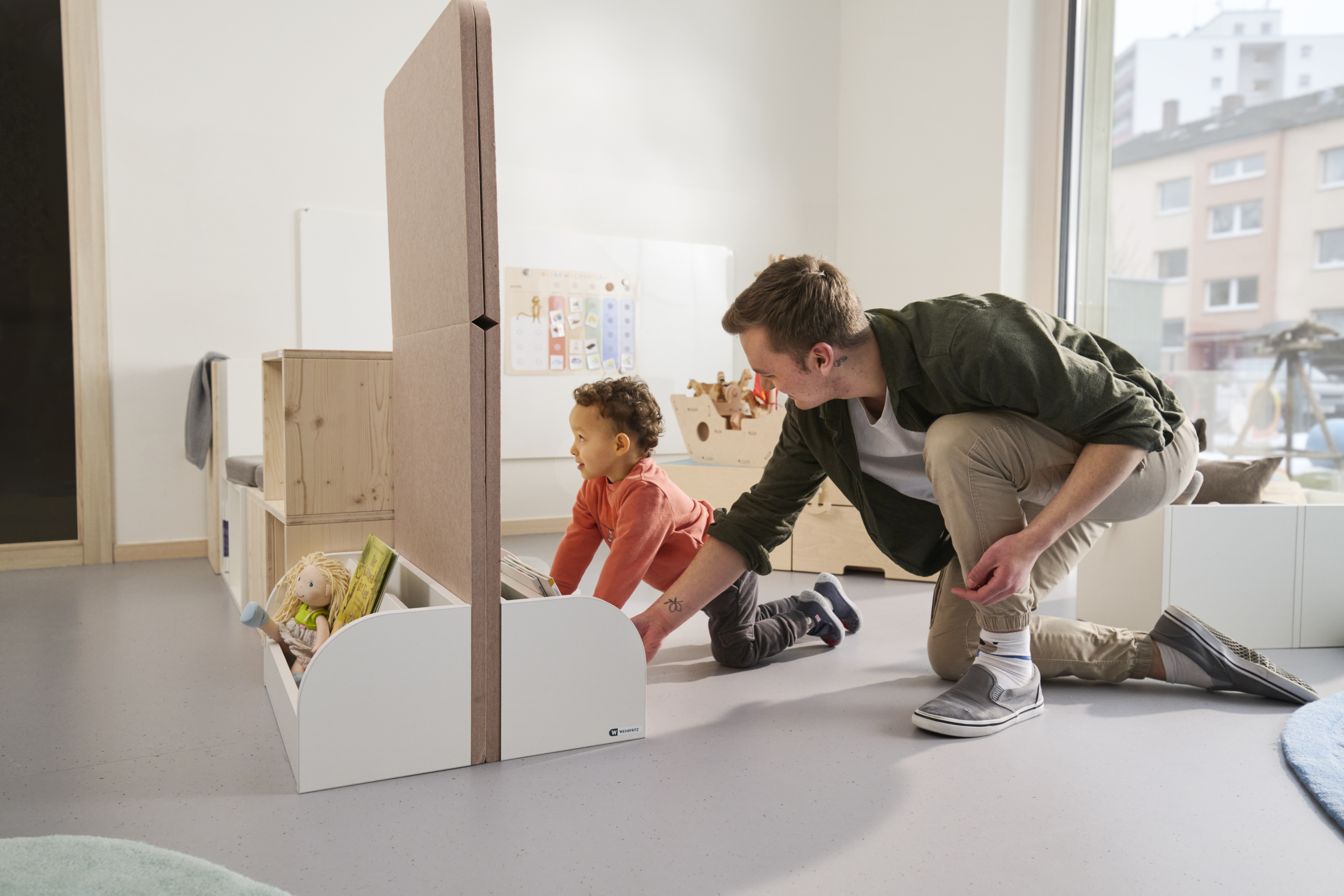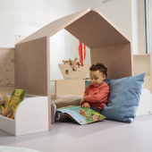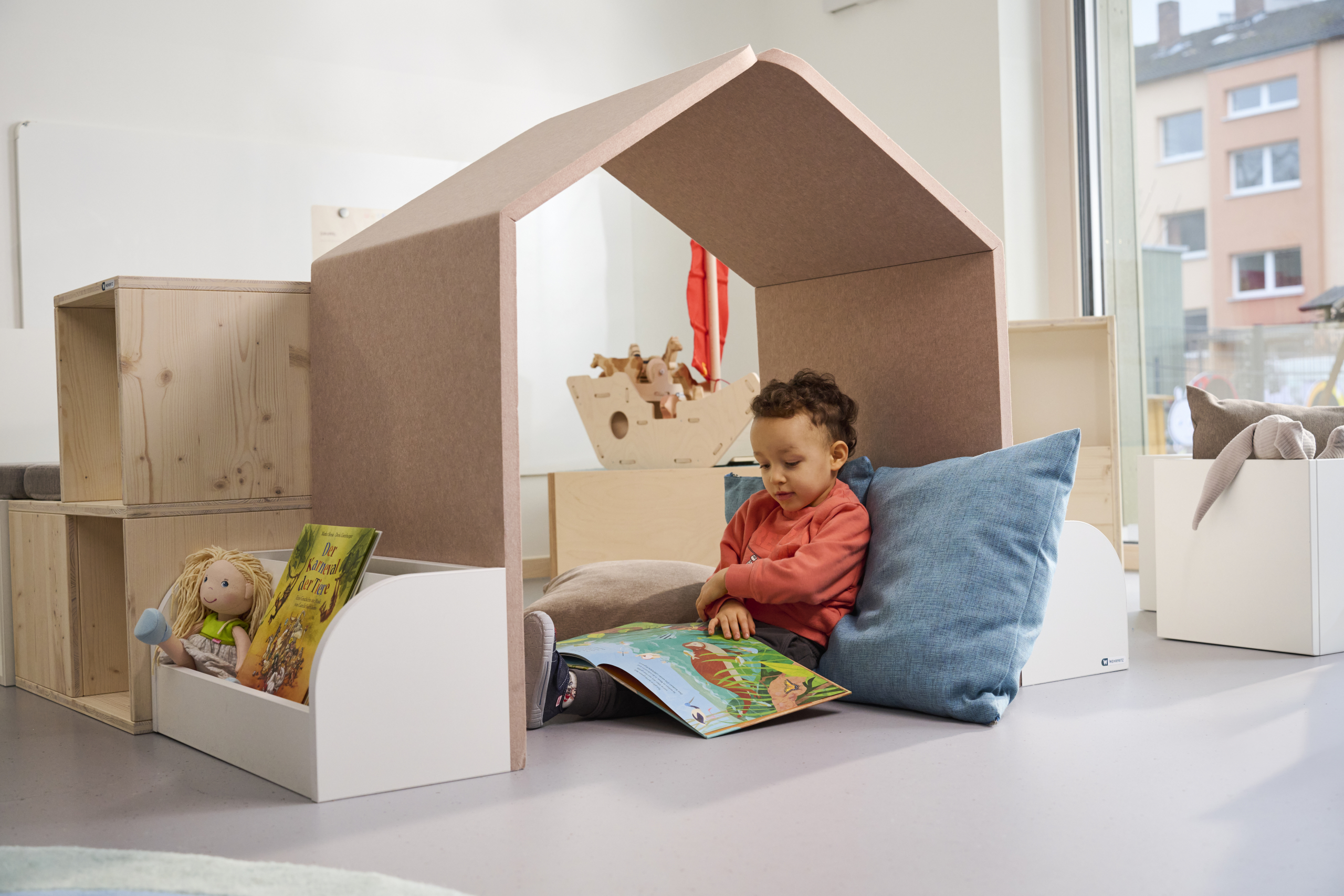 Het speelhuis met scheidingswandfunctie combineert verschillende toepassingen in één veelzijdig ruimte-element. Wanneer de kasten, die dienen als basis voor de tot het dak “uittrekbare” scheidingswand, uit elkaar worden geschoven, ontstaat in een handomdraai een gezellig lees-, speel- of terugtrekhuisje. Wanneer de ruimte anders nodig is, worden de kasten eenvoudig weer samengezet en vouwt het dak zich tot een akoestisch werkzame scheidingswand, die als ruimteverdeler fungeert en extra opbergruimte biedt – bijvoorbeeld voor boeken of spelletjes.