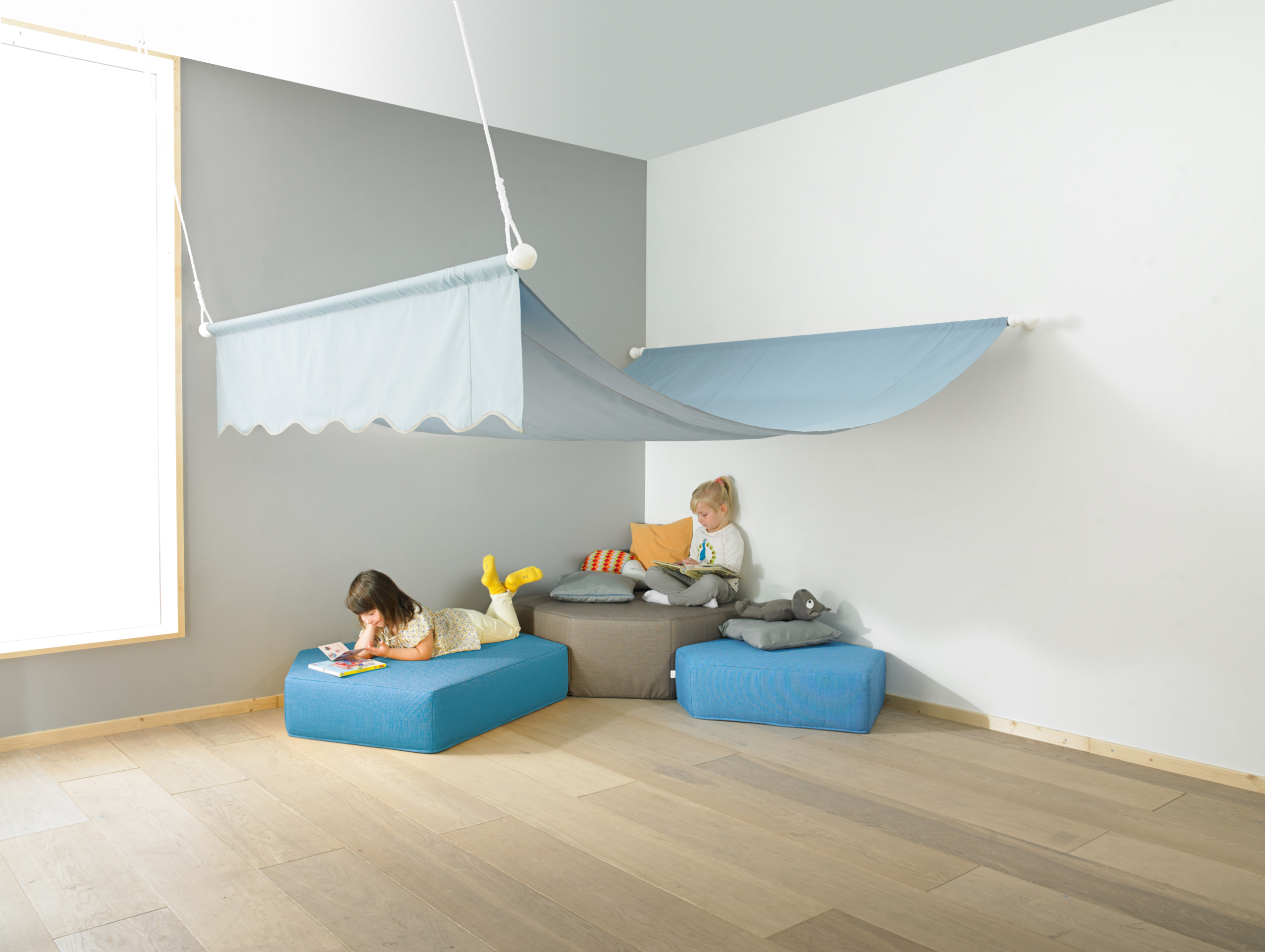 Overdekte speelhoeken van 200 x 200 cm, met een knik van 20 cm in de stof. Twee met kunststof beklede stalen buizen zijn op een afstand van 220 cm in de overkapping genaaid. Materiaal: Trevira CS, vlamvertragend, in 4 kleuren. Wasbaar op 30 °C als fijne was, maar niet geschikt voor de droogtrommel en niet centrifugeren! Met plastic koorden (L 100 cm, Ø 6 mm) voor bevestiging. Afmetingen: L 220 x B 200 cm, overhang ca. 37 cm