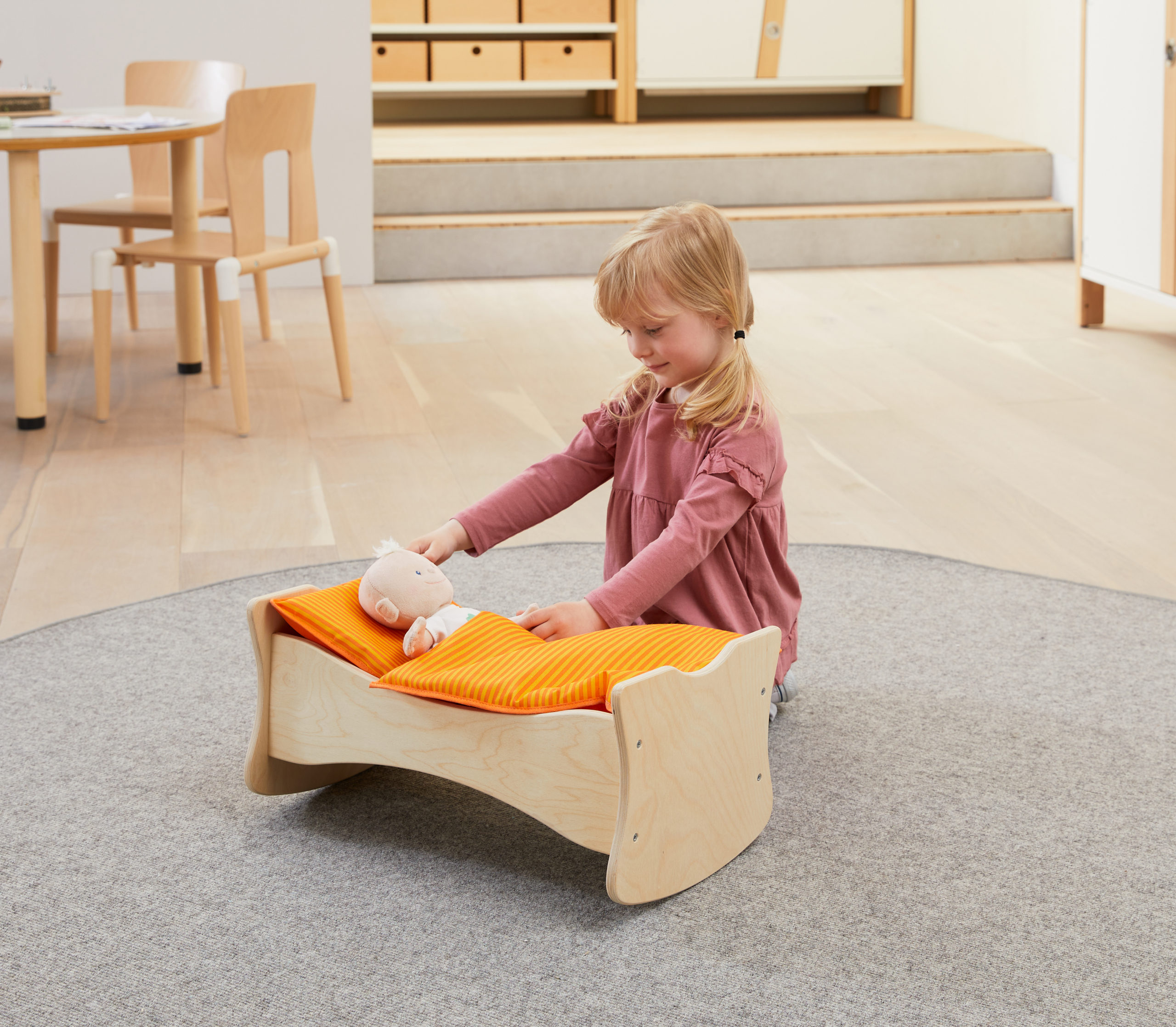Of de 2-in-1-combinatie als wieg of bed wordt gebruikt, kan tijdens het spel spontaan worden beslist. Even omdraaien en de functie verandert. Inclusief beddengoed. Het design kan afwijken van de afbeelding en is wasbaar op 30 °C. Materiaal: blank gelakt hout, katoen.