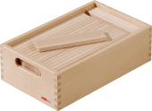 Complete bouwsetwagen met basisbouwstenen van natuurlijk beukenhout. Inclusief bouwsetdozen en rollend onderstel. Inhoud: Bouwsets I tot VII (437 onderdelen). Afmetingen: Kubus zijde 4 cm; te combineren met de 4 cm basismaat; wagen: L 58 x B 32 x H 43 cm. Materiaal: Beukenhout.