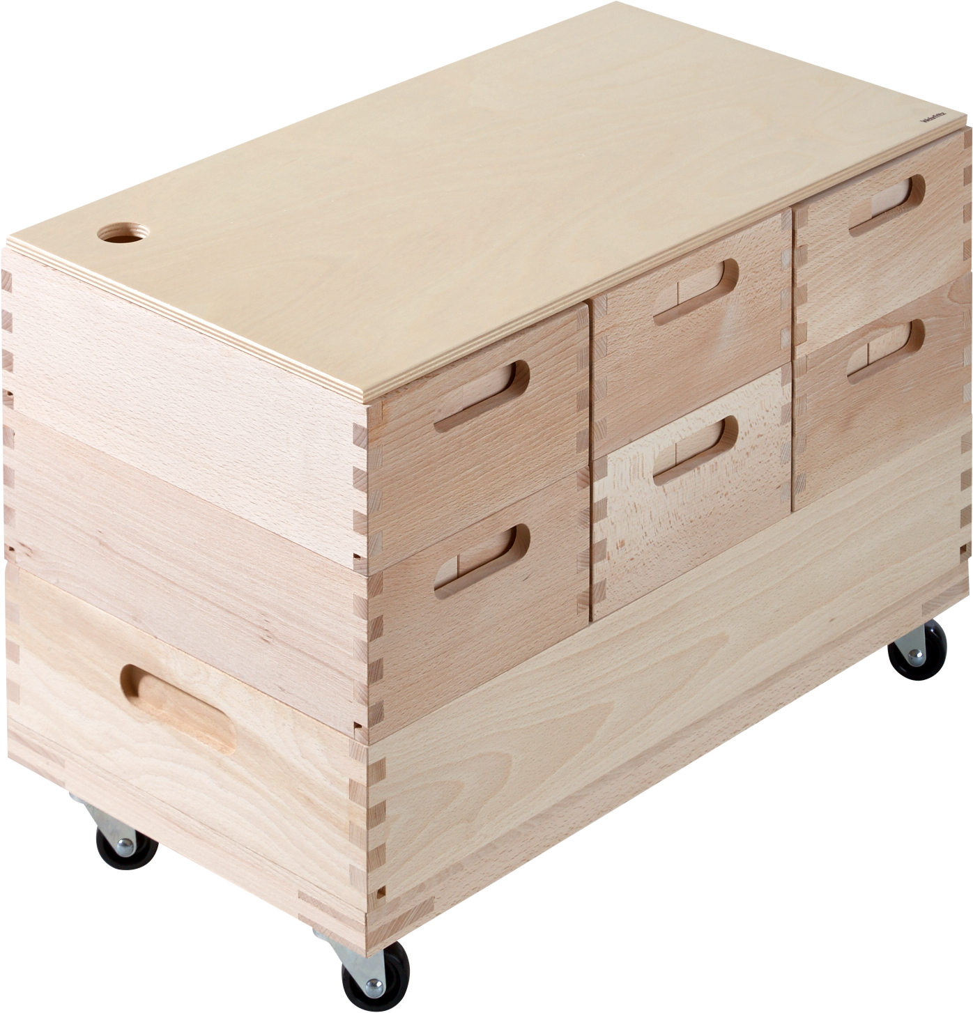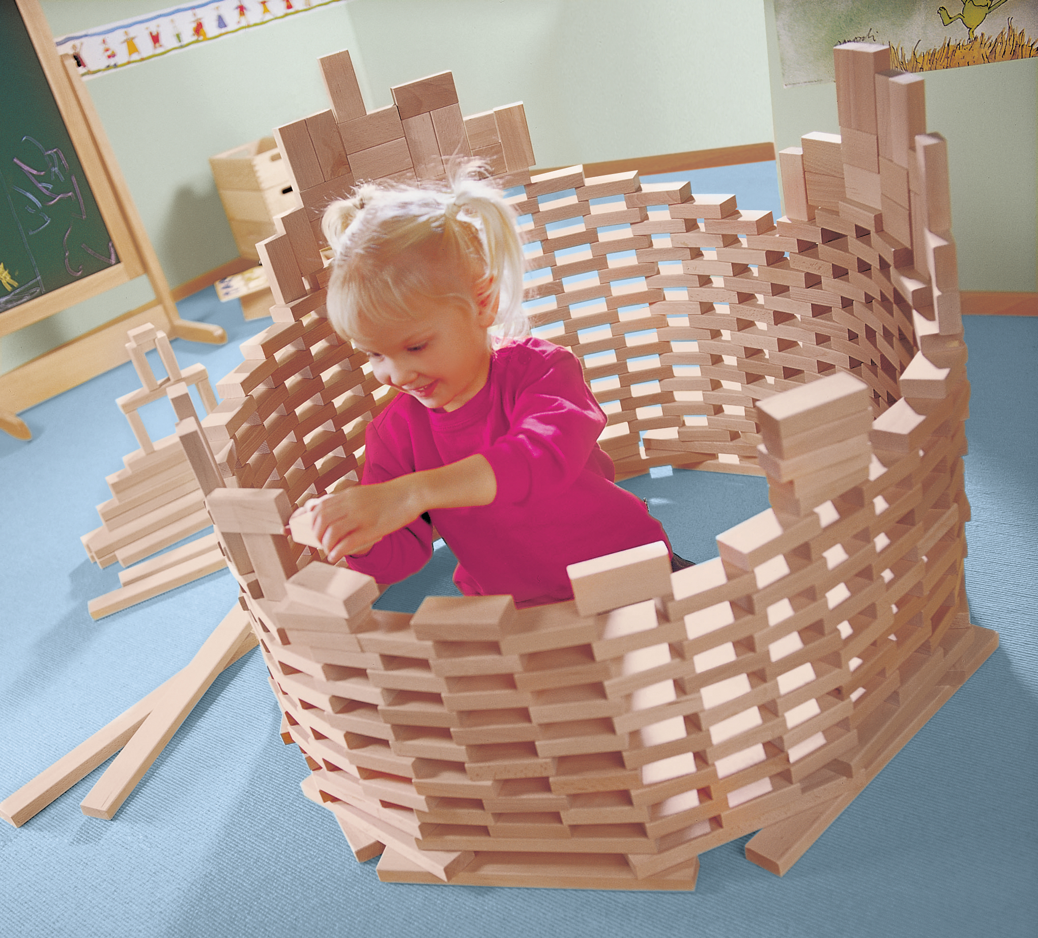 Met de bouwset wordt een enorme hoeveelheid bouwmateriaal van natuurlijk beukenhout geleverd: blokken in 4 maten, halve blokken, halve kubussen en bouwlatten. Alles is overzichtelijk gesorteerd in één grote en zes kleine stevige houten kisten. Deze kunnen ruimtebesparend op het rollende onderstel worden gestapeld. Inhoud: 400 bouwstenen, 7 bouwsetdozen, 1 rollend onderstel. Materiaal: Massief hout. Afmetingen: kleinste blok 16 x 4 x 2 cm; rollend onderstel L 55 x B 30 x H 16 cm; kleine houten doos 30 x 18 x 9 cm.