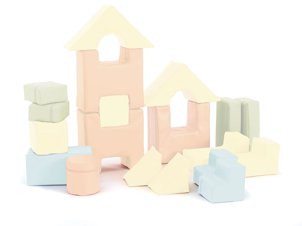 De 19 bouwstenen zijn perfect voor kleine bouwers. Voorbeeld van afmetingen: kubus B 40 x D 20 x H 10 cm, dakblok B 56 x D 28 x H 20 cm.
