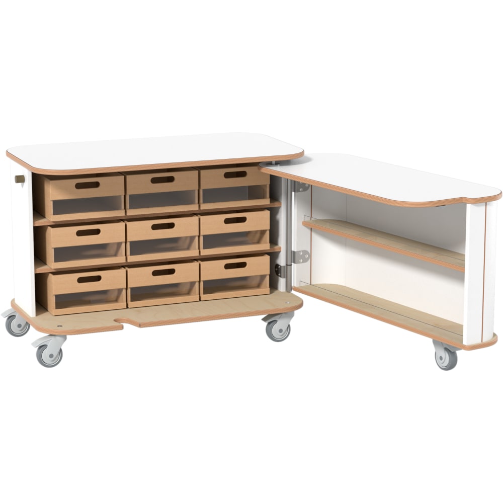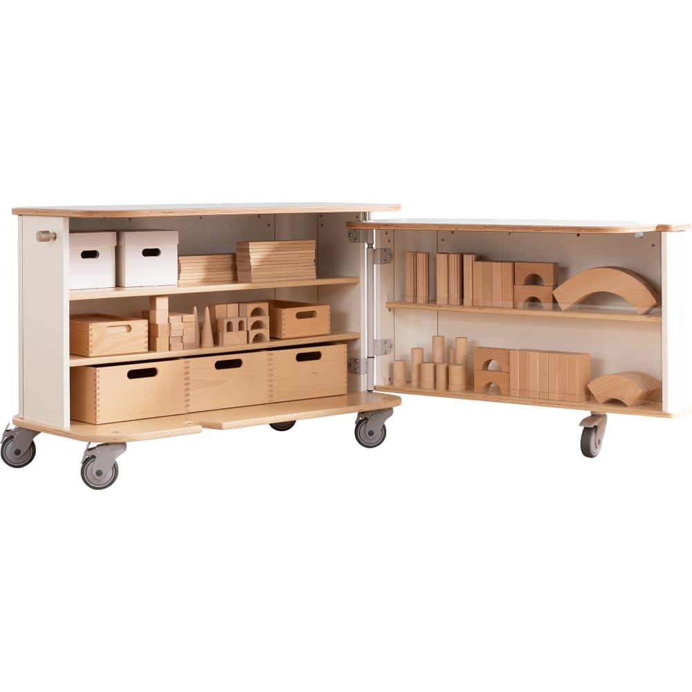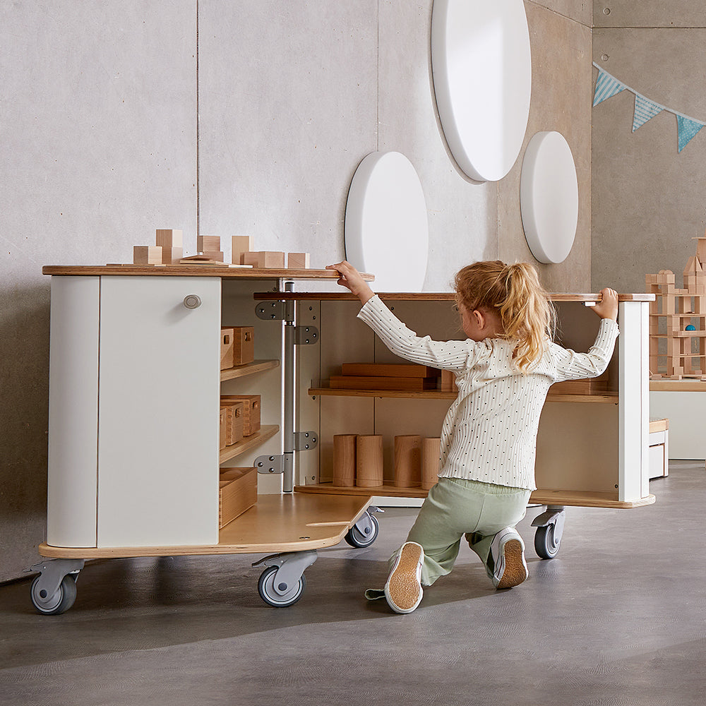 Met de Materiaalwagen bent u altijd flexibel. Dit kleine opslagwonder met een witte behuizing en een robuust oppervlak kan worden uitgeklapt en biedt ruimte aan maximaal 9 materiaalkbakken (Art.-Nr. 1509395 dient apart te worden besteld.). Speel- en creatief materiaal kan er netjes en binnen handbereik in worden bewaard, is snel bij de hand en even snel opgeruimd. Gesloten biedt de wagen ook een stevig speeloppervlak op kindhoogte en geopend zelfs twee. Handig is ook dat de materiaalwagen naar de speel- of werkplek kan worden gerold en in verschillende ruimtes kan worden gebruikt. Hij wordt afgesloten met een draaiknop. 5 wielen met vergrendelbare rem maken de wagen mobiel of zorgen indien nodig voor een stabiele stand. Als de materiaalwagen niet nodig is, kan hij ruimtebesparend in een van de garages worden geparkeerd.