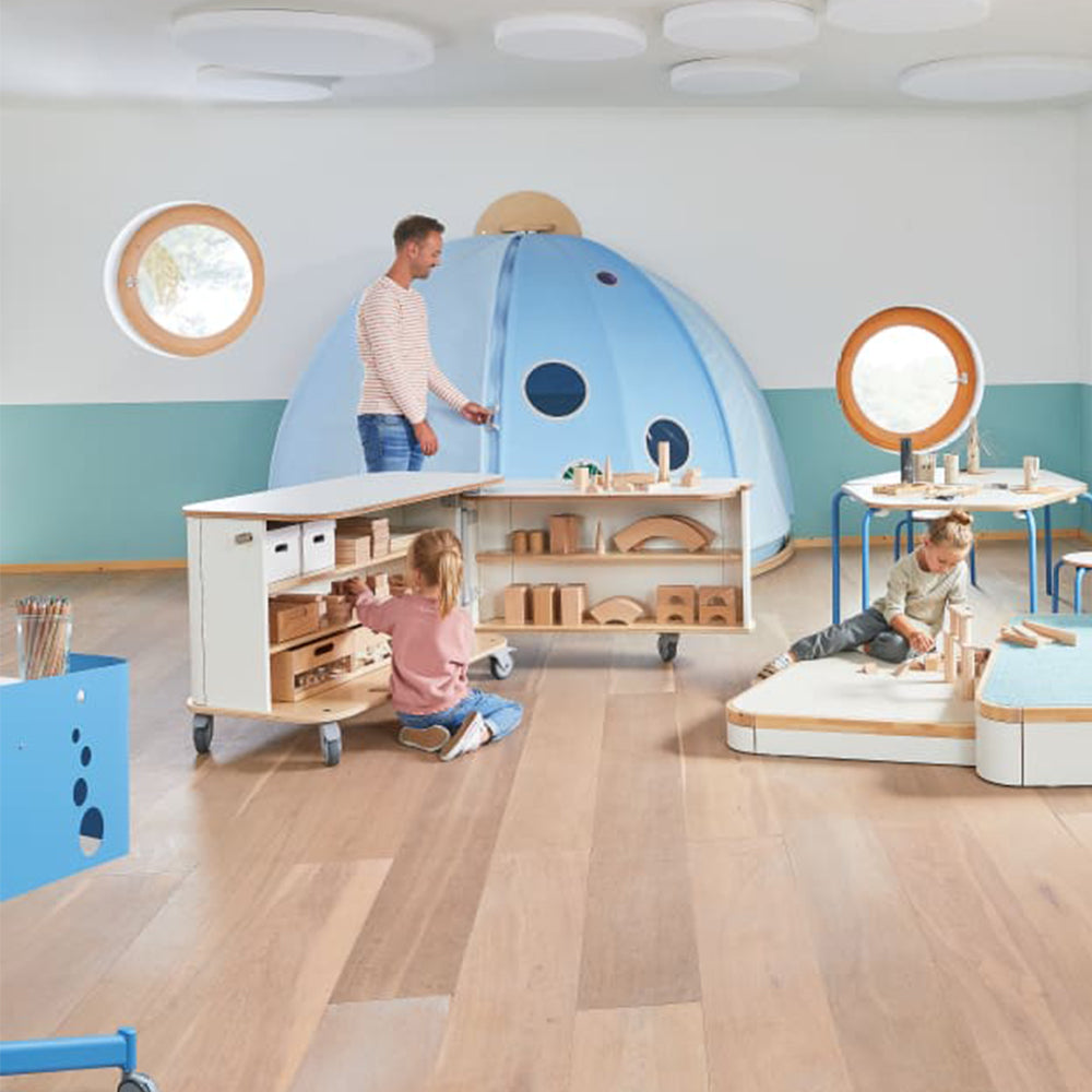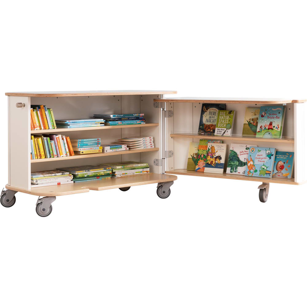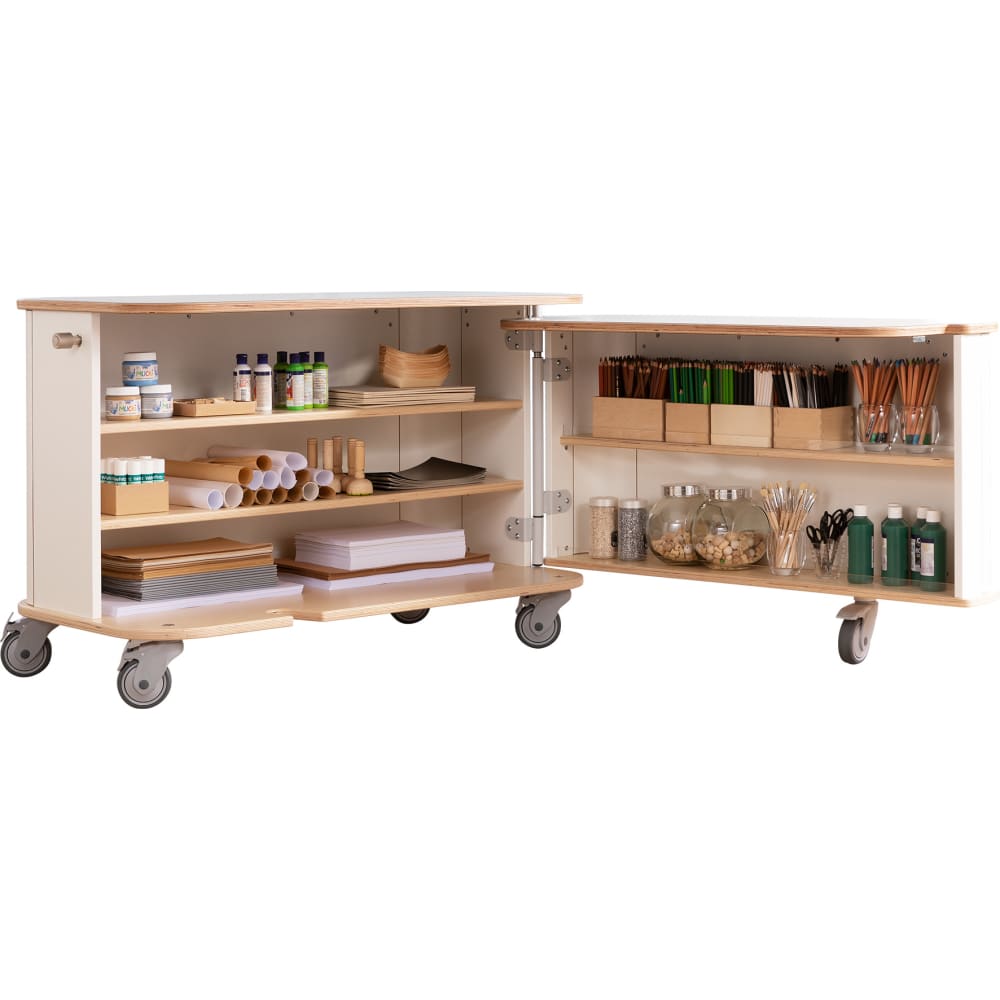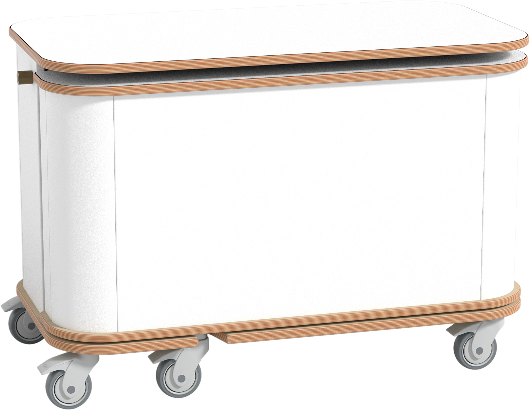 Met de Materiaalwagen bent u altijd flexibel. Dit kleine opslagwonder met een witte behuizing en een robuust oppervlak kan worden uitgeklapt en biedt ruimte aan maximaal 9 materiaalkbakken (Art.-Nr. 1509395 dient apart te worden besteld.). Speel- en creatief materiaal kan er netjes en binnen handbereik in worden bewaard, is snel bij de hand en even snel opgeruimd. Gesloten biedt de wagen ook een stevig speeloppervlak op kindhoogte en geopend zelfs twee. Handig is ook dat de materiaalwagen naar de speel- of werkplek kan worden gerold en in verschillende ruimtes kan worden gebruikt. Hij wordt afgesloten met een draaiknop. 5 wielen met vergrendelbare rem maken de wagen mobiel of zorgen indien nodig voor een stabiele stand. Als de materiaalwagen niet nodig is, kan hij ruimtebesparend in een van de garages worden geparkeerd.