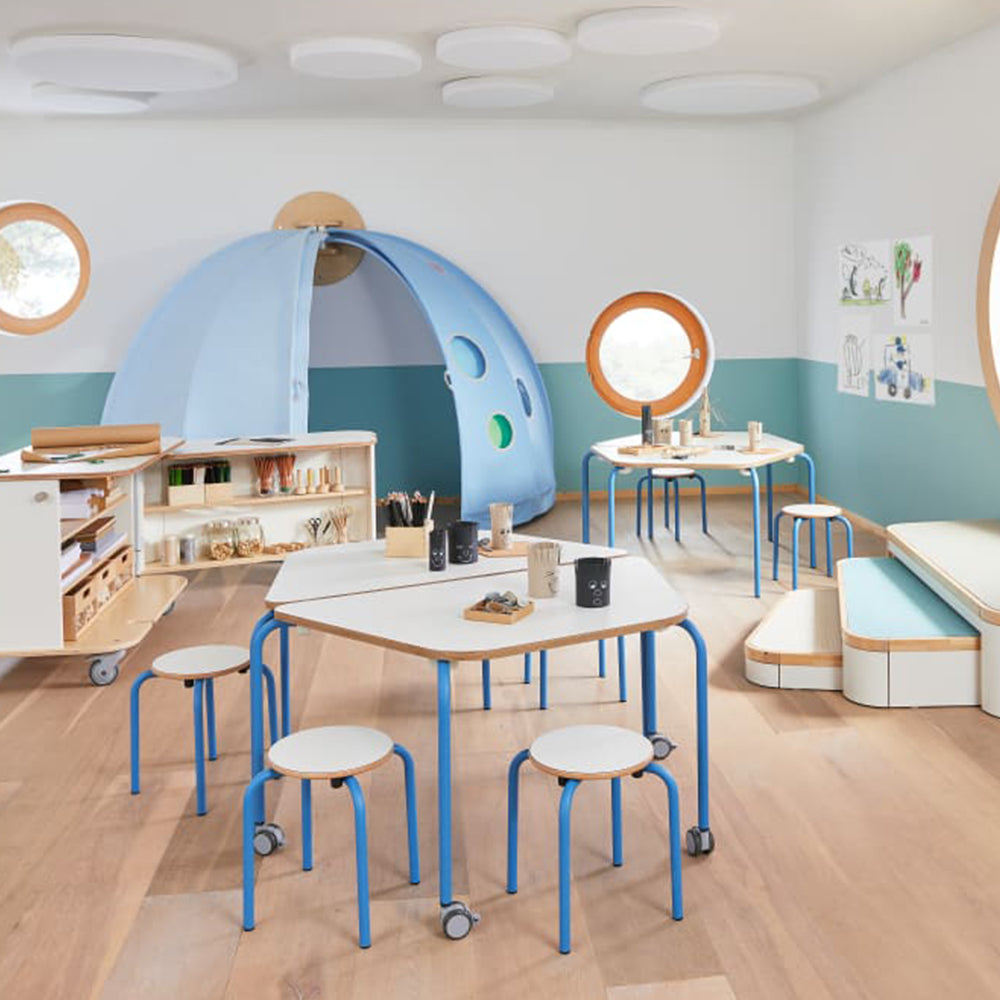 De handige en lichte tafel heeft een trapeziumvormig, bijzonder robuust blad met Duropal® bekleding en afgeronde hoeken. Bij gebruik van meerdere tafels kunnen snel verschillende tafelopstellingen worden gemaakt: voor werken in kleine of grote groepen, voor gezamenlijke maaltijden, voor ouderavonden of om te knutselen. Als de ruimte elders nodig is, kunnen de tafels ruimtebesparend gestapeld worden aan de zijkant of in het Breeze.Upp Speelhuis of Breeze.Upp Meubel Garage.