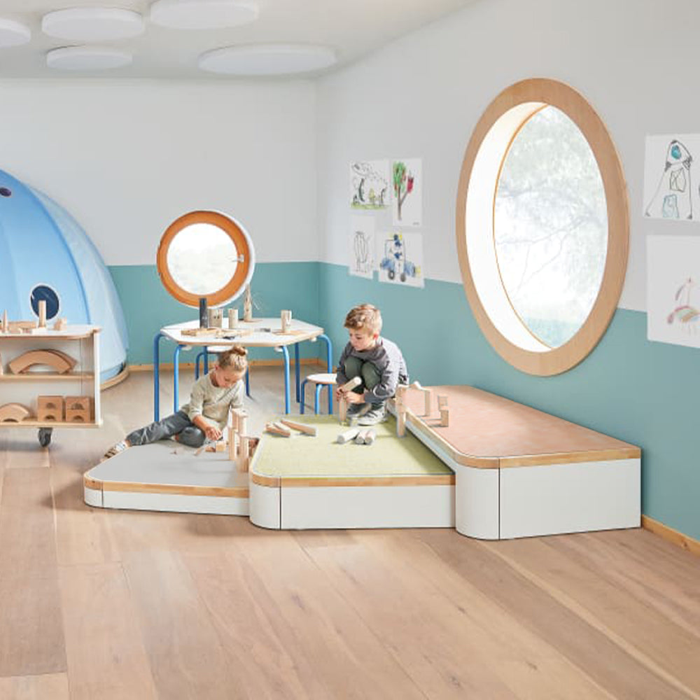 Breeze.Upp Podium schuin met kijkvenster en rolwagen