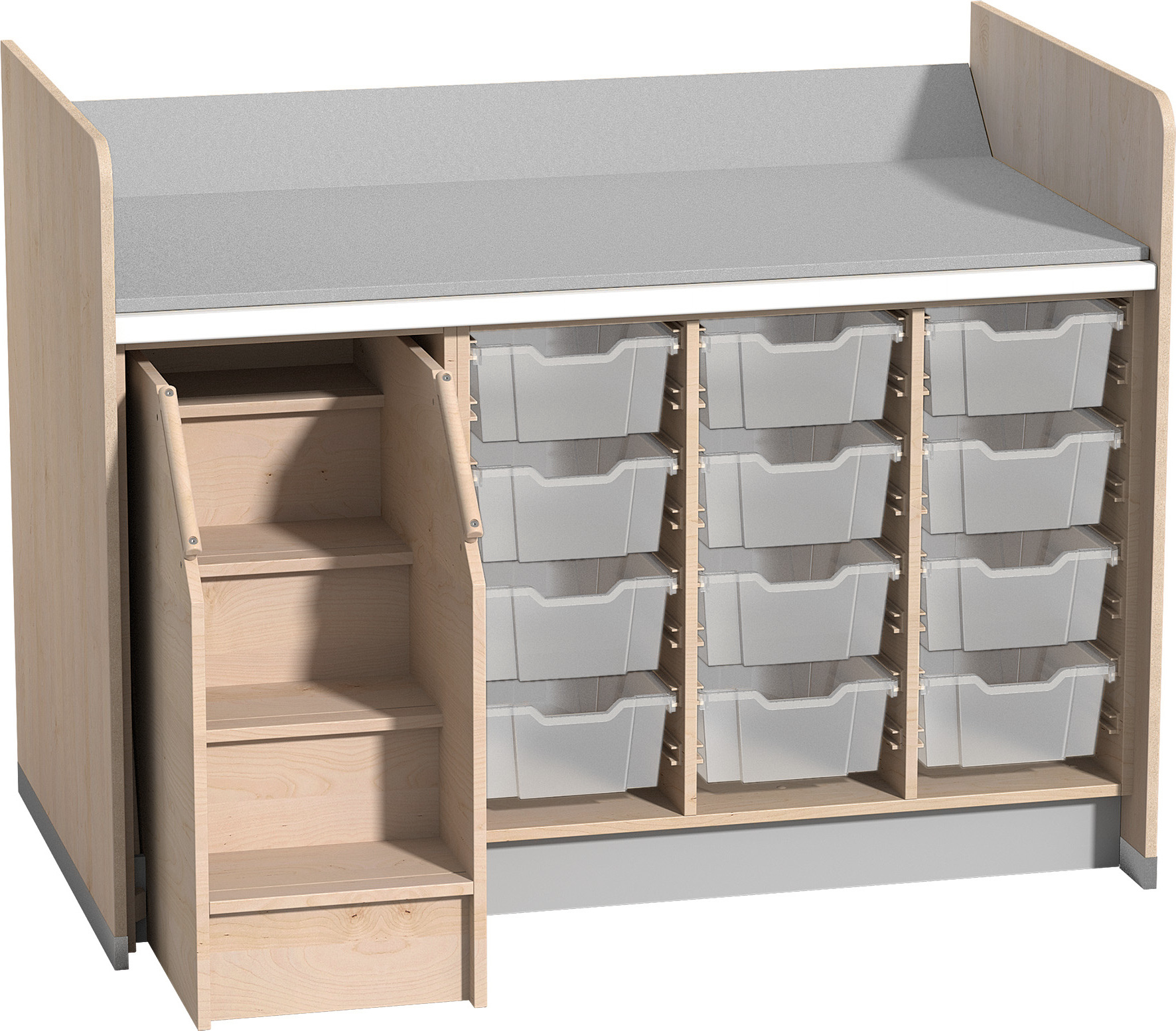 Met een kindveilige uittrekbare opstaphulp. Ruimte voor 12 materiaalboxen. Let op: de commode moet tegen de muur worden geplaats. Het aankleedkussen (breedte 100 cm) moet apart worden besteld. De commode wordt gedeeltelijk gedemonteerd geleverd.