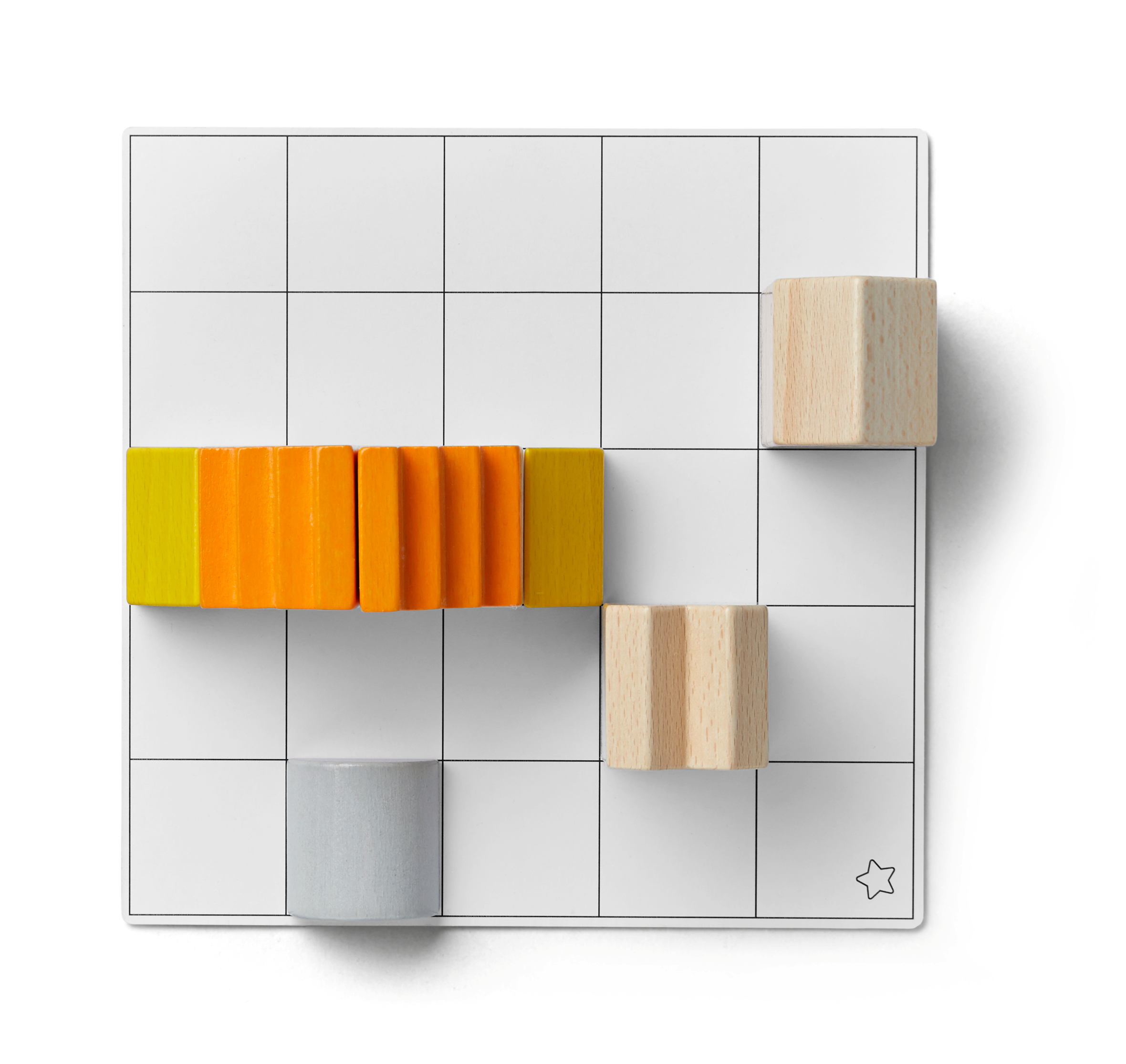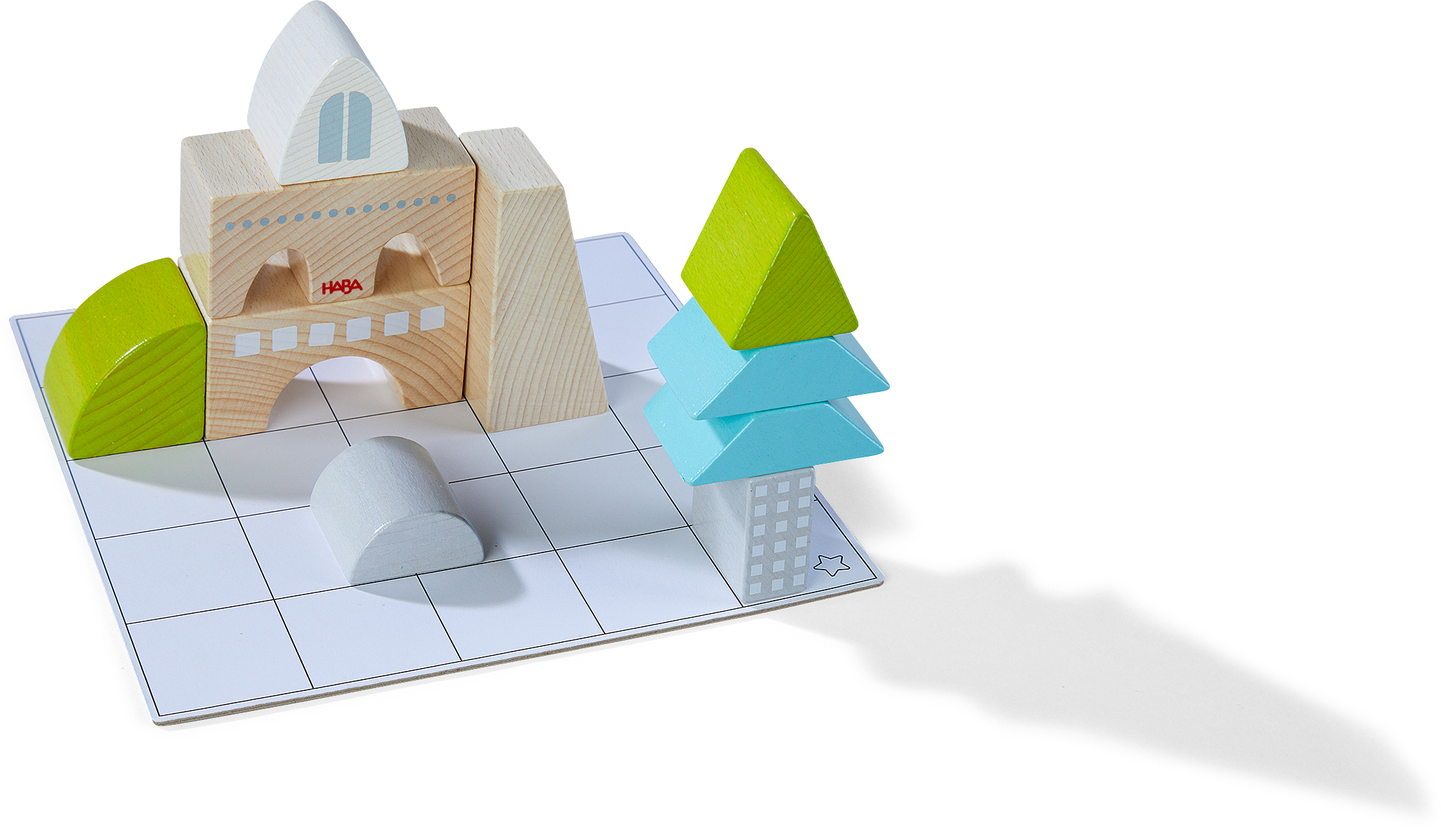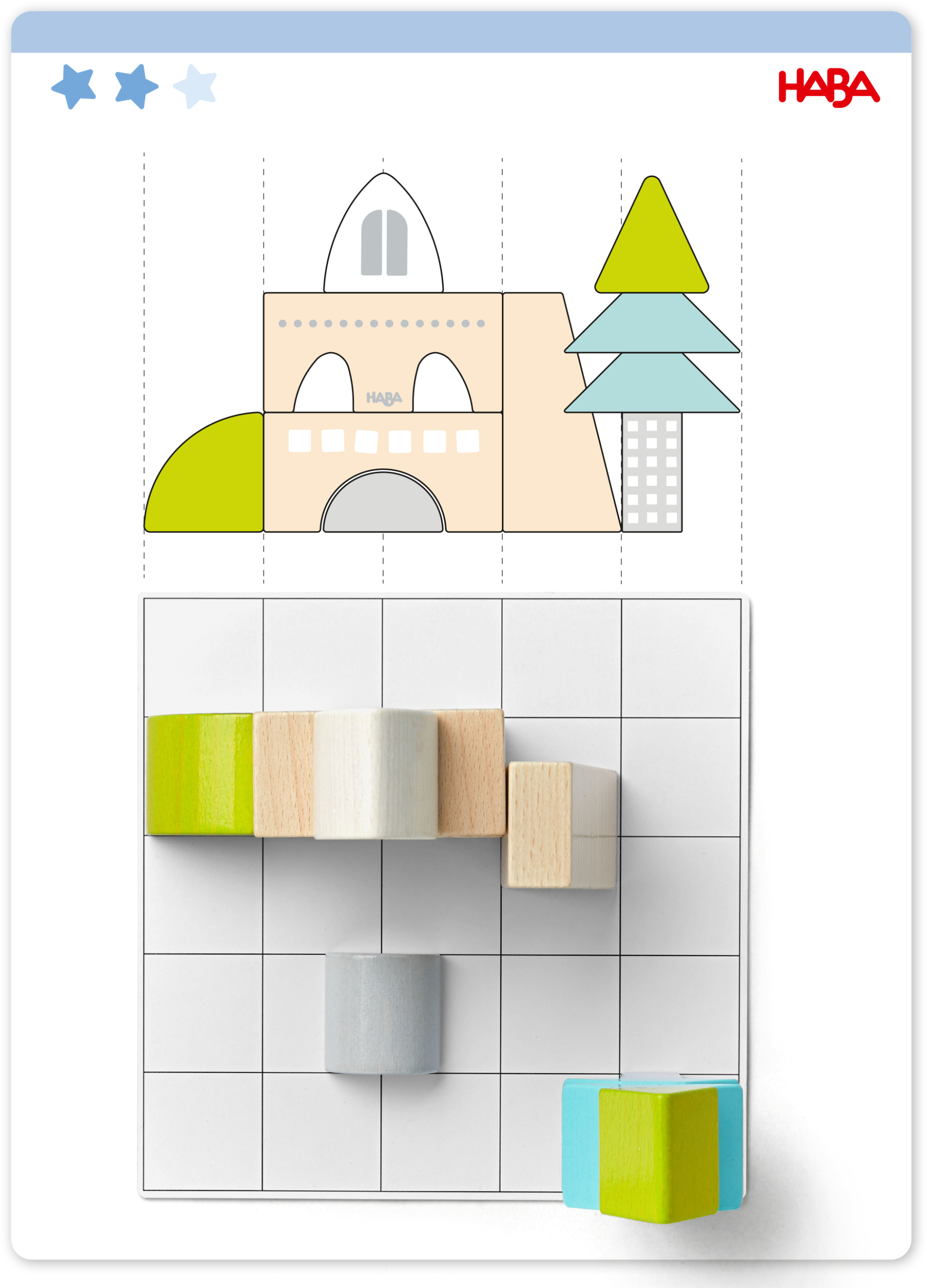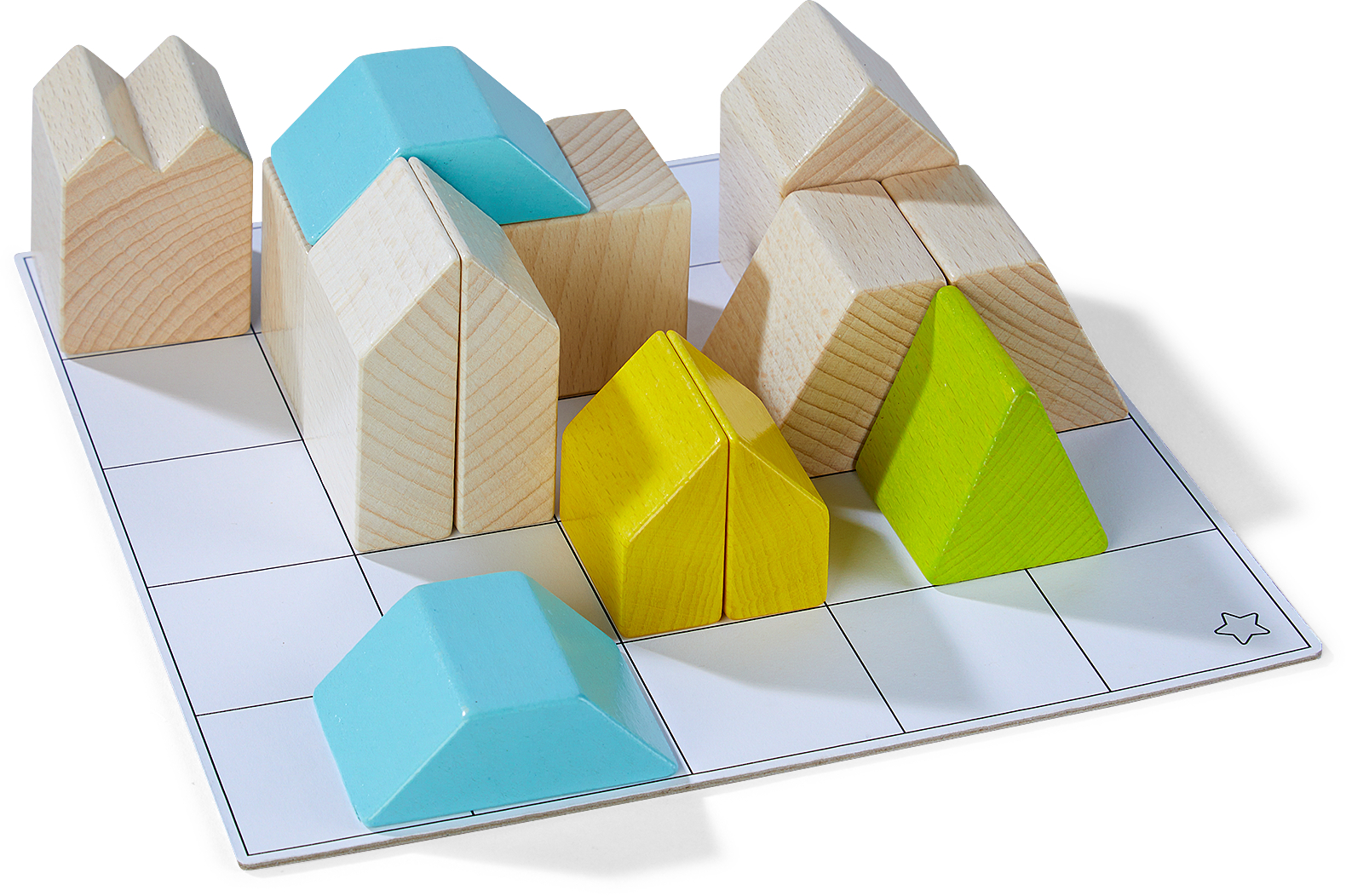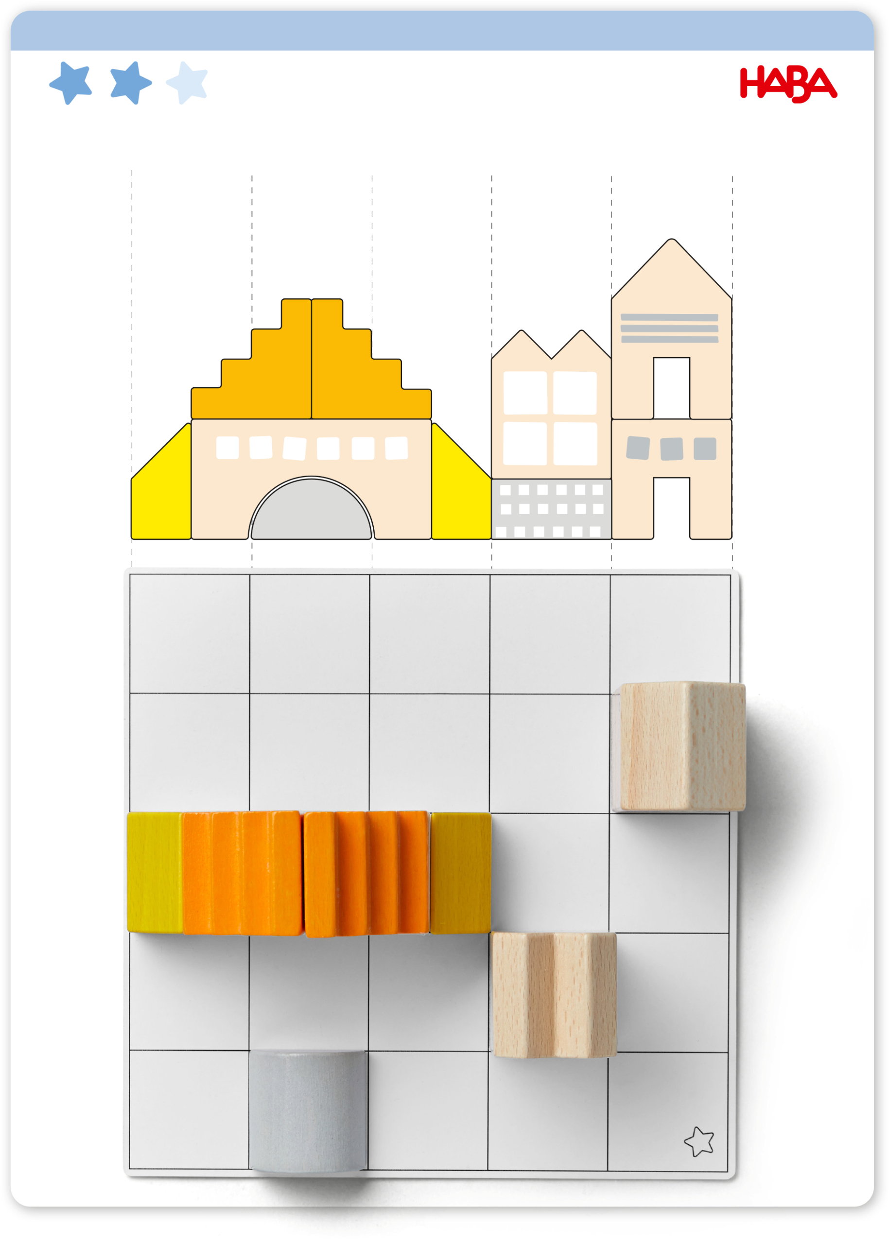 Hier is creatief denken gevraagd! Kleine bouwmeesters kiezen uit drie verschillende moeilijkheidsniveaus een van de 16 sjabloonkaarten. Hierop is telkens een bouwwerk in twee perspectieven afgebeeld. Dit moet nu met ruimtelijk inzicht op het sjabloon-bord nagebouwd worden! De achterkant van de sjabloonkaart toont of de nabouw geslaagd is. Altijd weer anders, elke keer fascinerend! Voor vrij spel of voor het leggen en bouwen naar sjabloon. Materiaal: beukenhout, karton. Afmetingen sjabloon-bord: 20,5 x 20,5 cm.