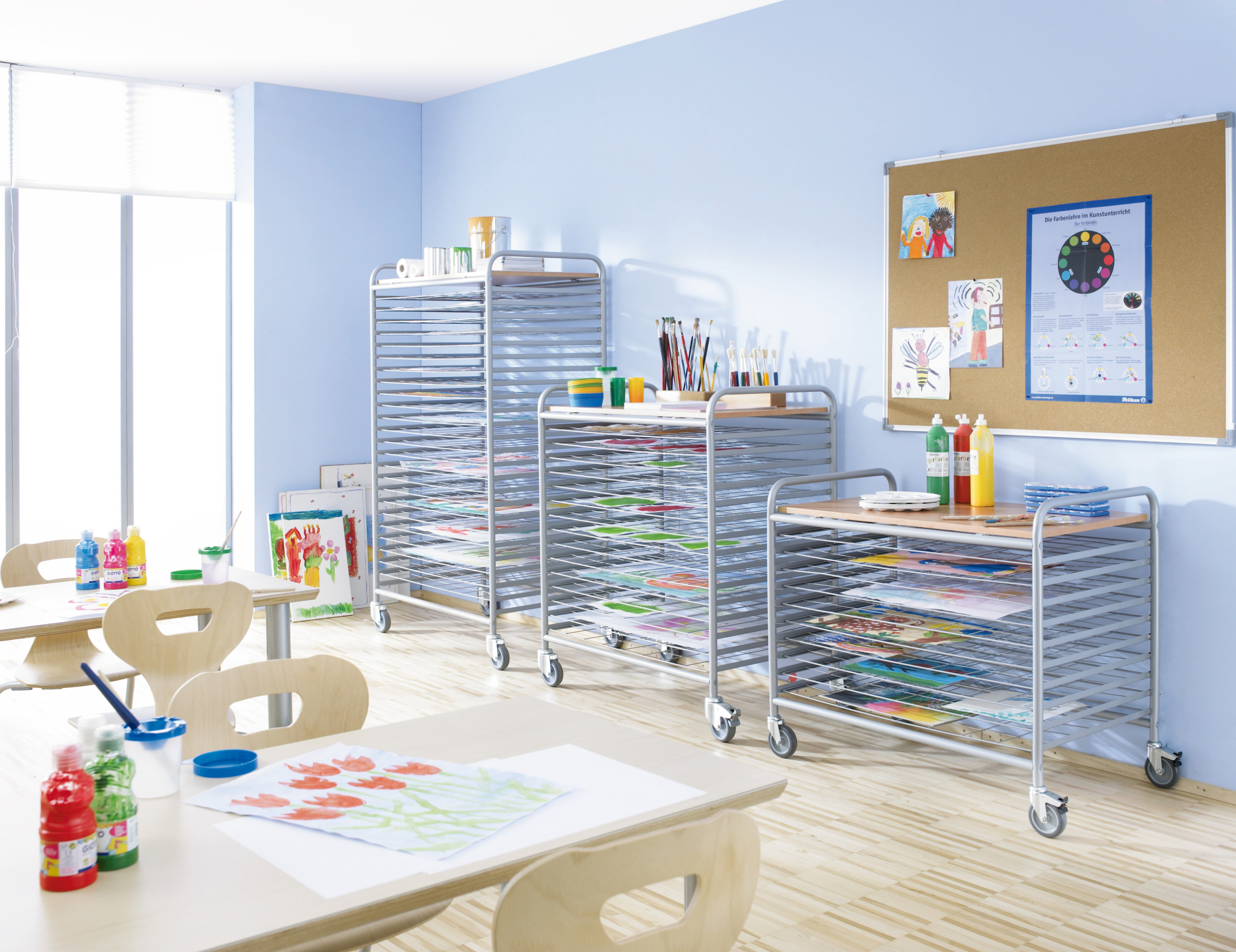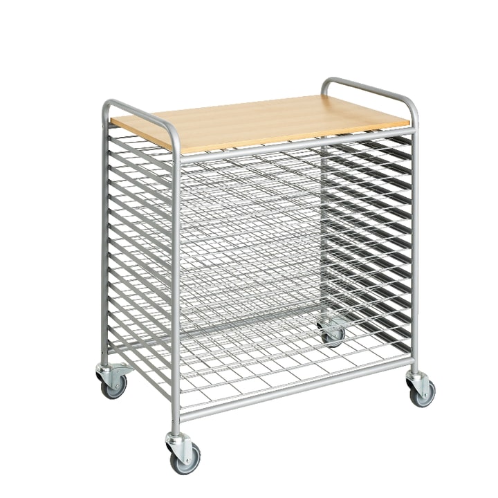 Altijd beschikbaar waar kunstenaars hun schilderijen willen drogen: de wagen heeft grote, stabiele loopwielen, waarvan 2 vergrendelbaar zijn. Alle roosters zijn uittrekbaar en gemakkelijk te reinigen. Materiaal: staalbuis of -draad, gegalvaniseerd, lade van MDF in beukenfineer. Afmetingen: L 95 x B 60 cm. Levering wordt gedemonteerd geleverd (met montage-instructies).
