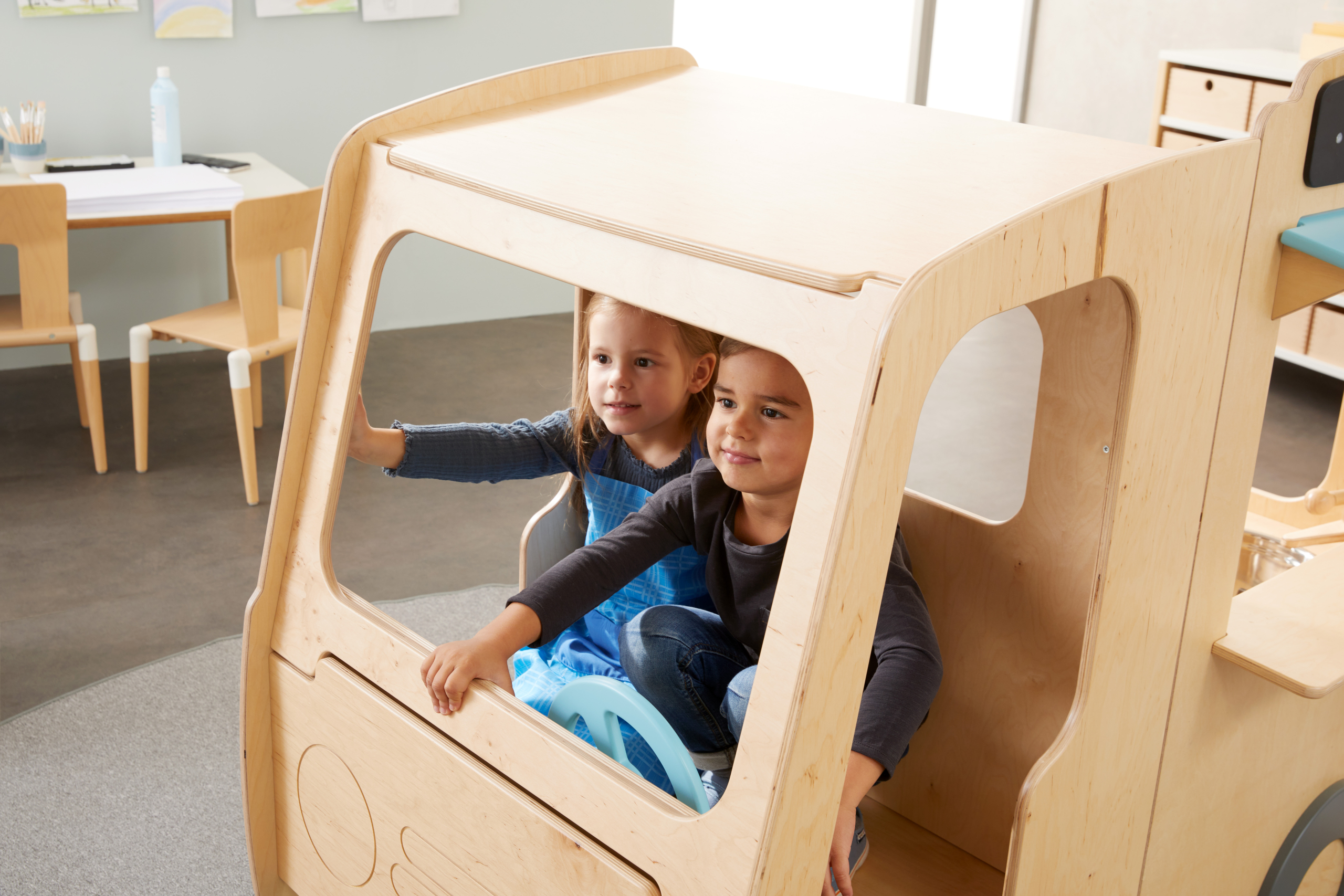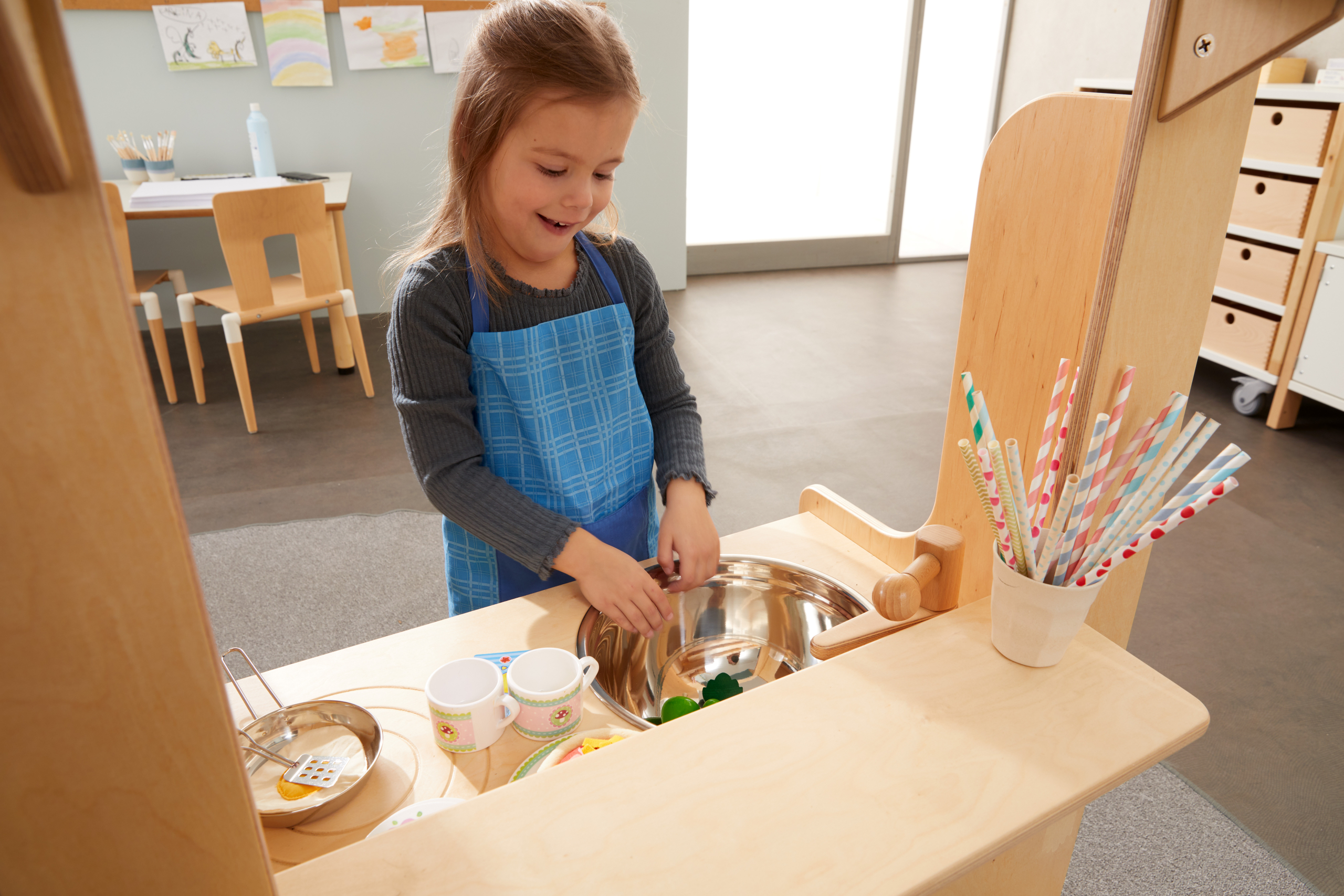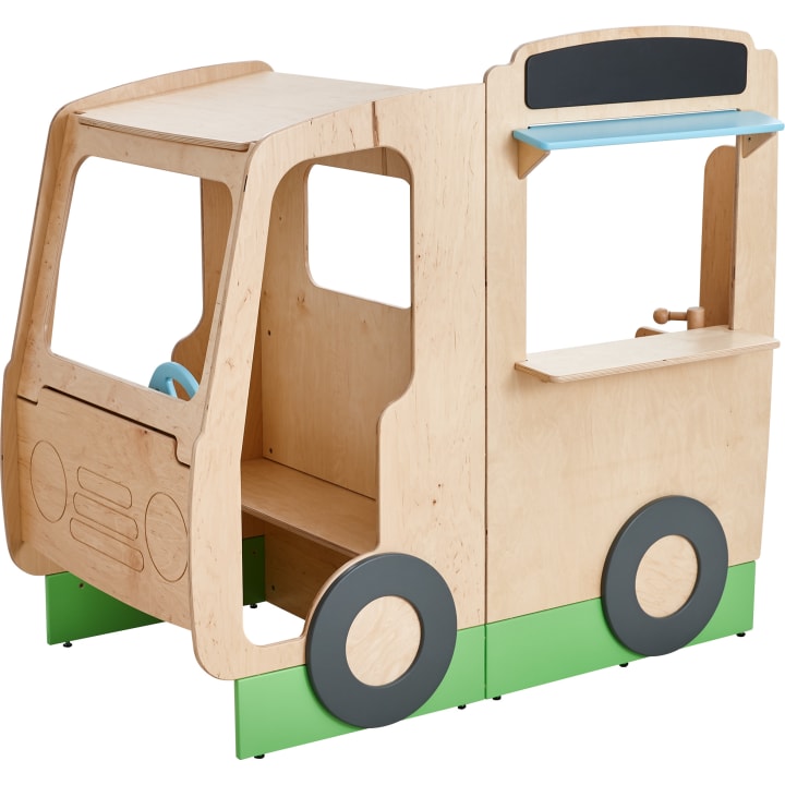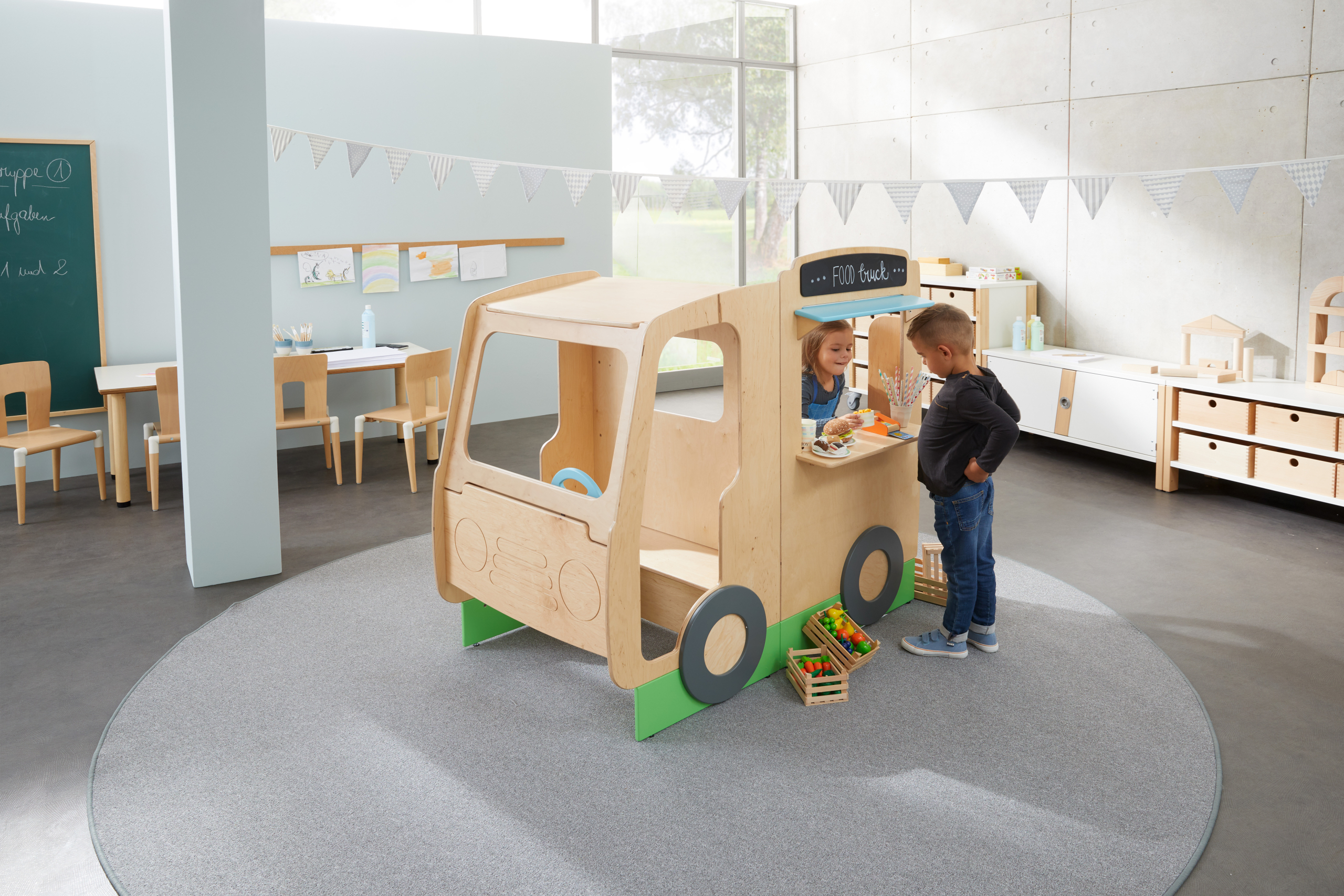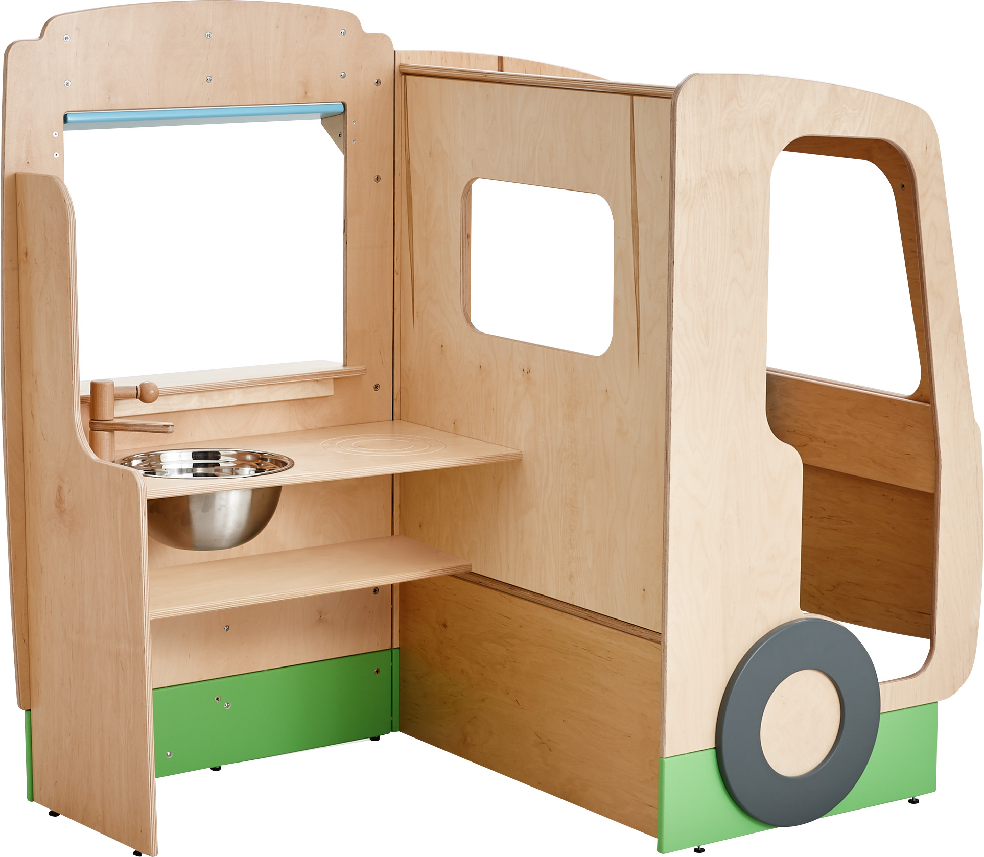 Of de kinderen nu instappen of nieuwsgierig om de foodtruck heen lopen, er is van alles te ontdekken: het draaibare stuurwiel, de uitsparingen voor de grille en de lichten, het grote raam met luifel en toonbank, het werkblad aan de binnenkant met ingefreesde kookplaat, verwijderbare roestvrijstalen kom en kraan. Daarnaast is er een plank onder het werkblad en haken aan de achterkant van de bestuurderscabine. Het wordt al snel duidelijk: de foodtruck is de perfecte snackwagen waar kleine koks heerlijke gerechten kunnen bereiden en serveren.
