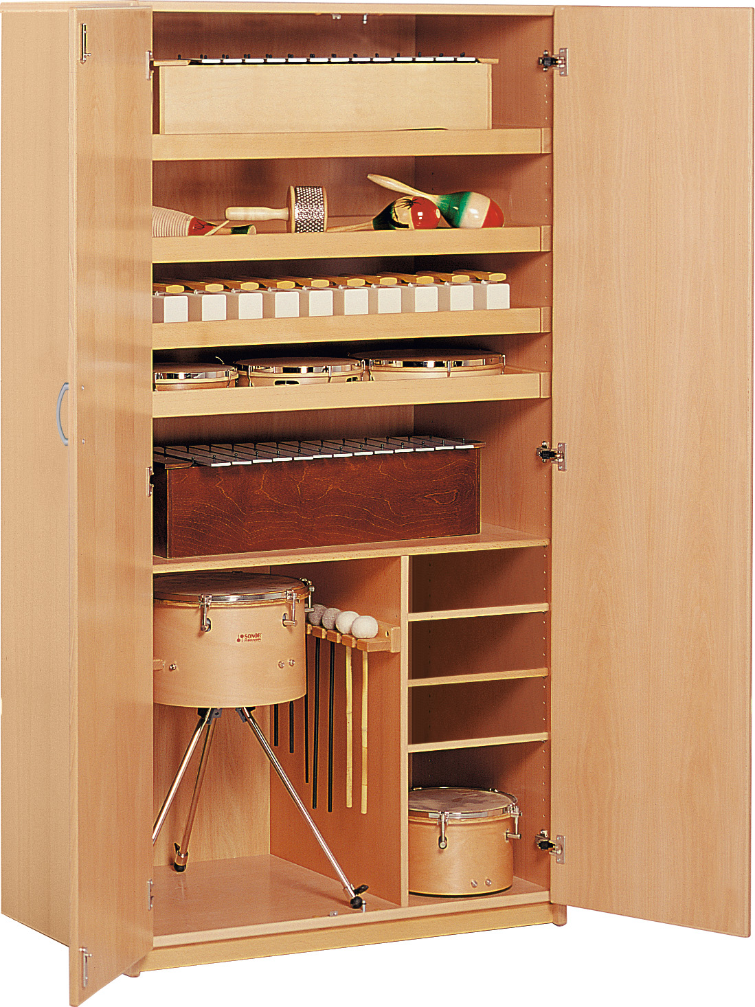 1 legplank, 4 uittrekbare rollades (met rollagers en veiligheidsstop). Onderaan een tussenplank met 3 legplanken. Daarnaast 2 sleuven om maximaal 14 stokken in te hangen.