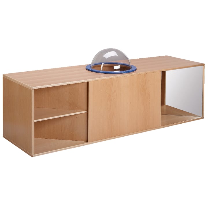 Wanneer een kind bijvoorbeeld zijn hand voor een spiegel houdt, verschijnt deze "plotseling" aan de andere kant. De schuine spiegels in de periscoopkast maken dit mogelijk en wekken de nieuwsgierigheid voor verdere experimenten. De kinderen kunnen zelfs door de kast kruipen en van bovenaf uit het kikkeroog met een gebogen acrylplaatje kijken. Aan elke zijde van de kast zijn er ook planken. Met veiligheidsspiegel en magnetische plaat. Uitrusting: massief beuken sokkel, kikkeroog met gebogen acrylplaatje en blauw gebeitste houten ring in de bovenkant, magnetische plaat/whiteboard op de achterwand. Afmetingen: B 200 x H 61 (zonder kikkeroog) x D 60 cm, B 200 x H 81 (met kikkeroog) x D 60 cm.