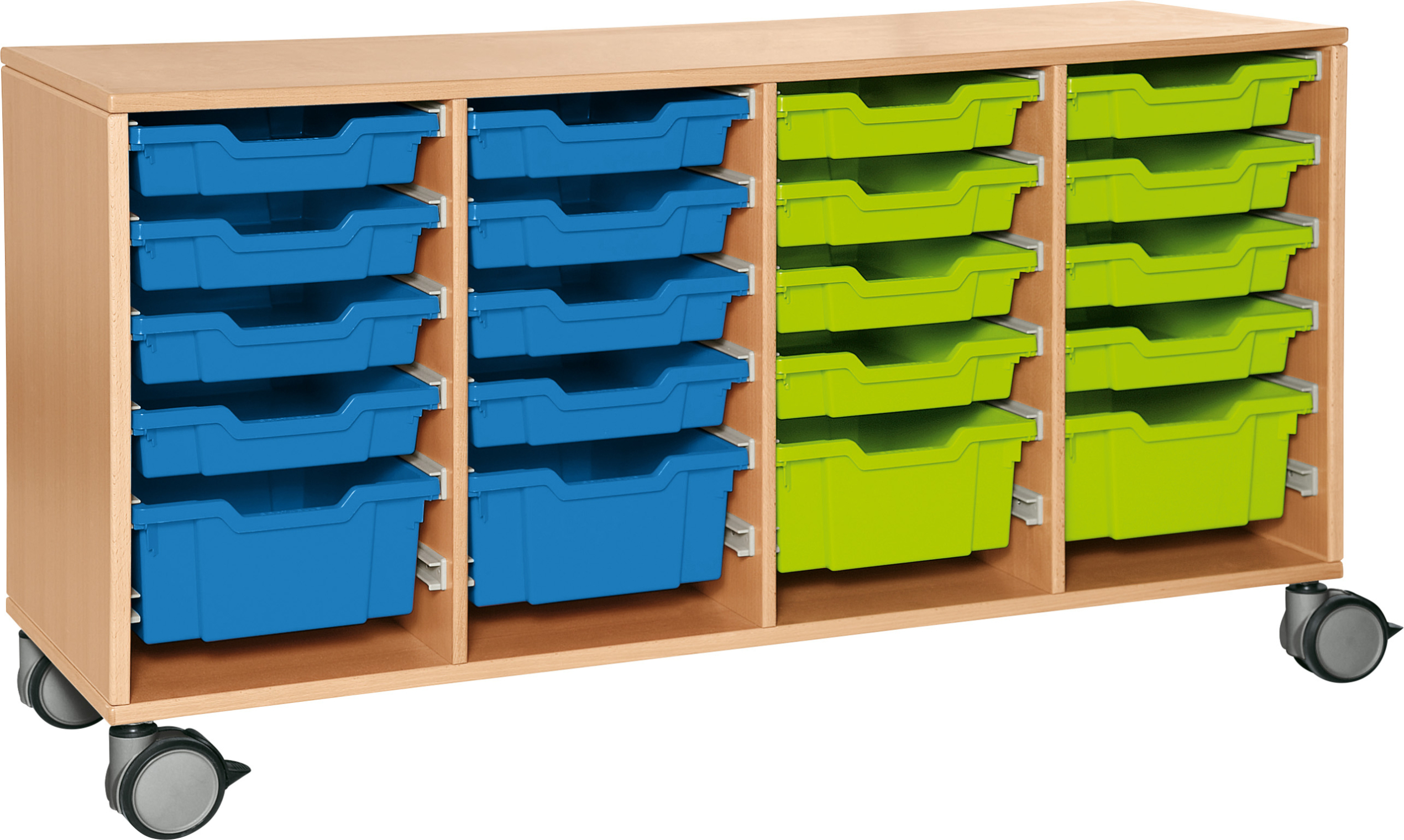 Met 4 wielen, waarvan 2 vergrendelbaar, en 8 x 6 rails.