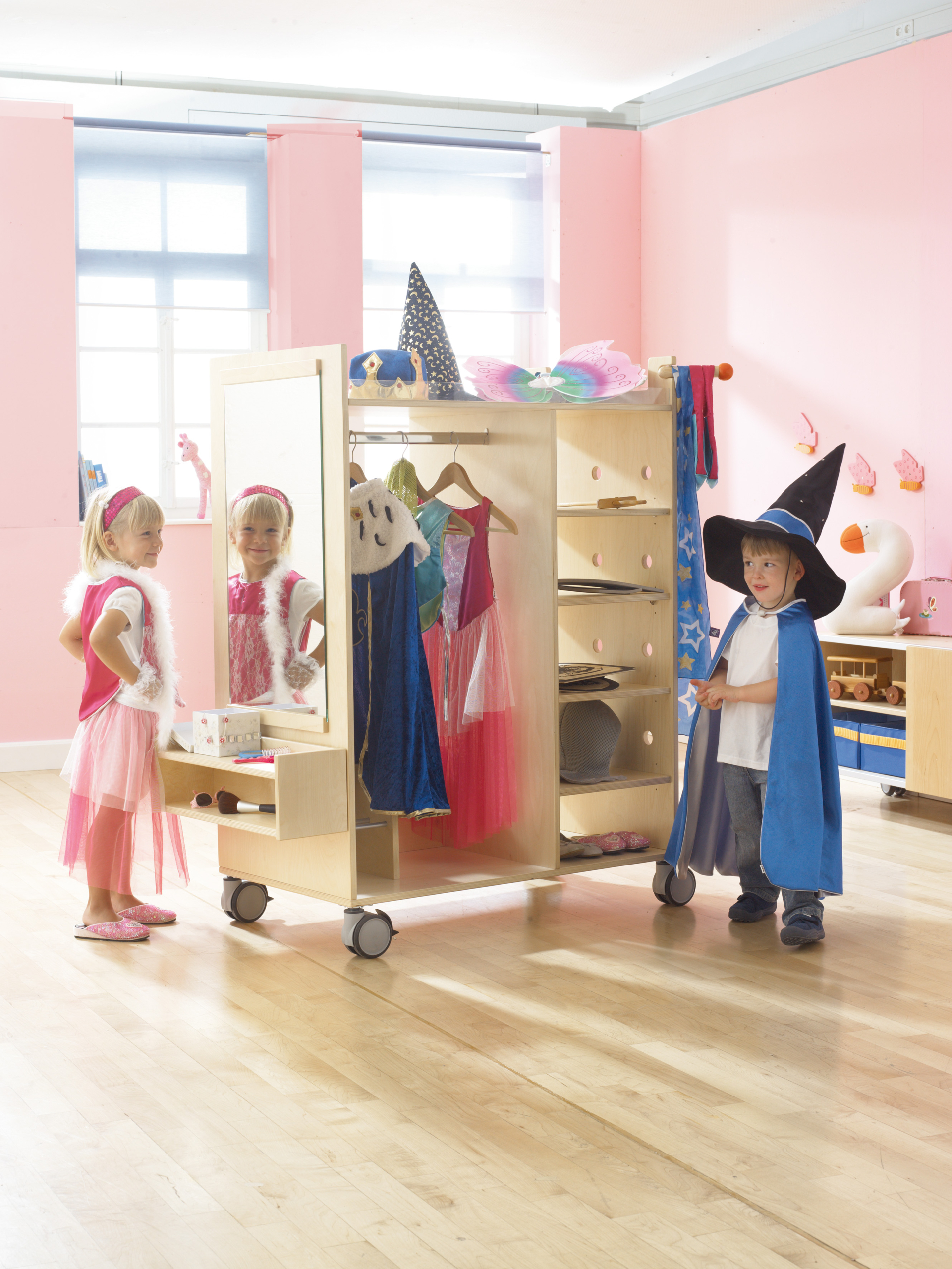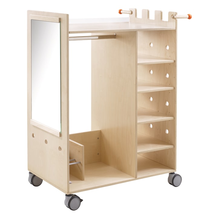 Een kledingstang, een schoenenrek en vijf vakken bieden ruimte voor alles wat je nodig hebt om je te verkleden. Voor nog meer opbergruimte kunnen aan de smalle zijden verschillende Move.Upp ophangelementen worden gehangen in de 12 uitsparingen. Met veiligheidsspiegel, 1 vaste plank en 3 inlegplanken, acryl randafwerking aan de bovenkant en een roosterplank, samen met 4 wielen waarvan er 2 vergrendelbaar zijn. Afmetingen van de vakken aan de binnenkant: B 37 x H 20 x D 58 cm.