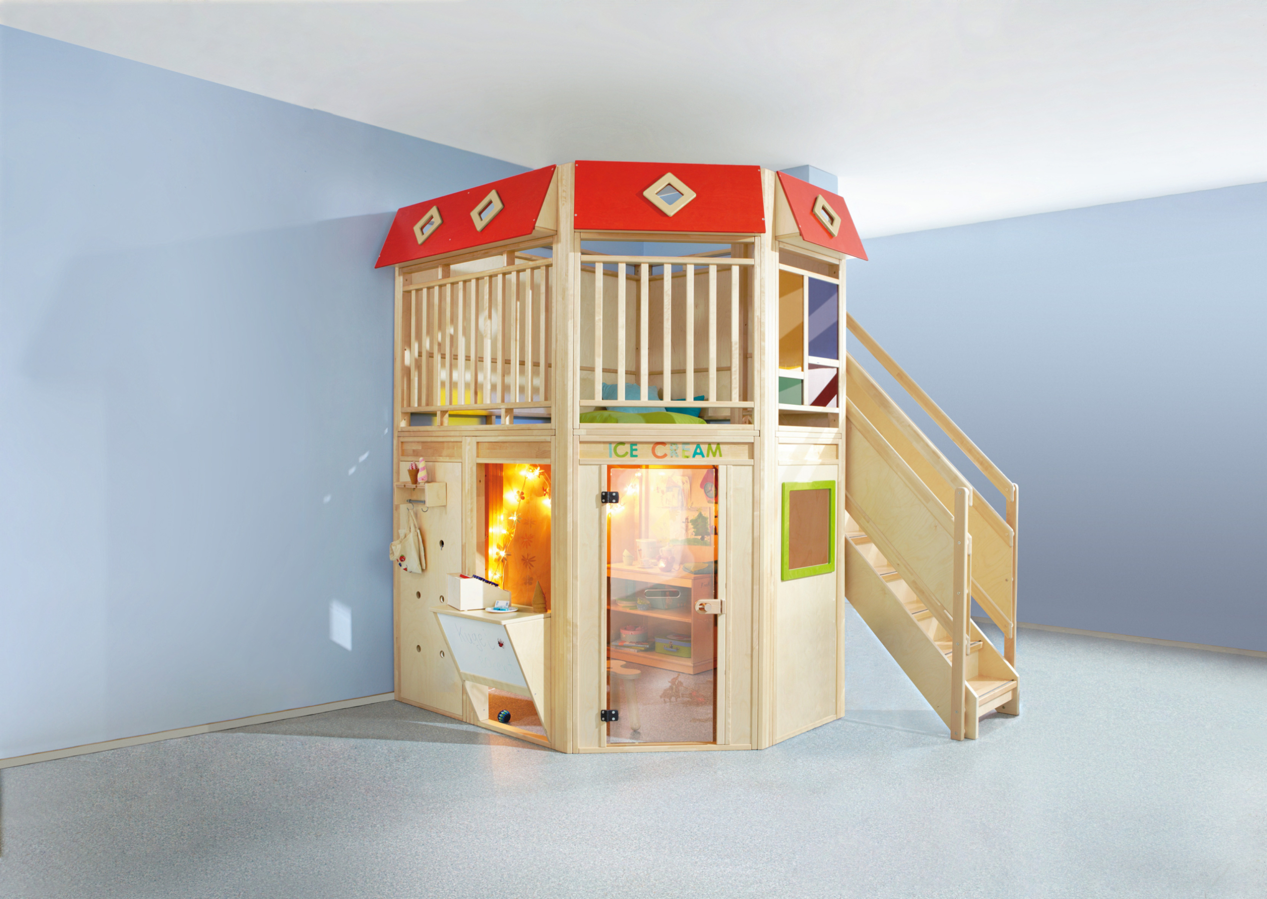 Boven kunnen kinderen van het uitzicht genieten door de spijlen of het kleurrijke acrylglas, beneden schittert de eenheid met een doorzichtige, onbreekbare acryldeur, een bijzonder toonbank en een aan beide zijden individueel aanpasbaar geperforeerd paneel. Ophangelementen hiervoor dienen apart te worden besteld.