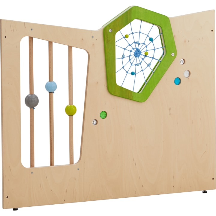 Met gekleurde prisma's en verschuifbare gekleurde ballen: in het spinnenweb en aan de stangen.