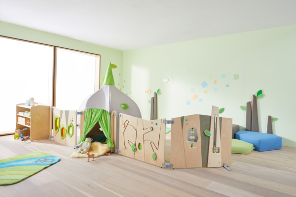 Het fascineert aan beide kanten met echte, draaibare stenen, gekleurde prisma's, ingekeepte voelbanen en een grappige specht die zich op de boomstamapplicatie ijverig van boven naar beneden beweegt.