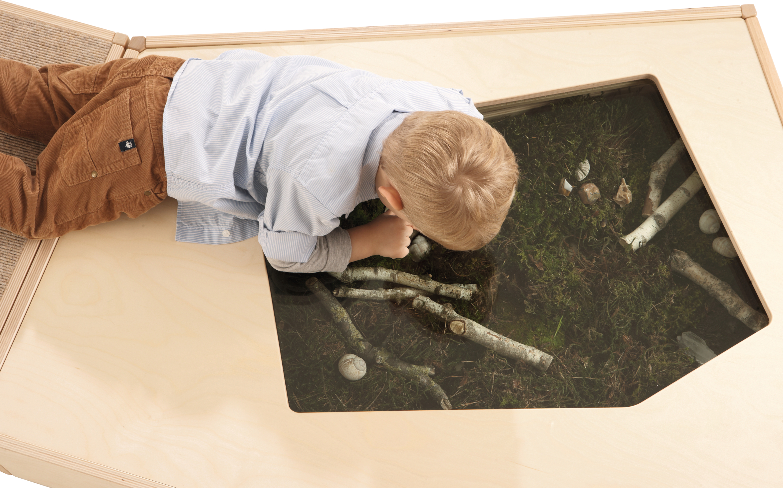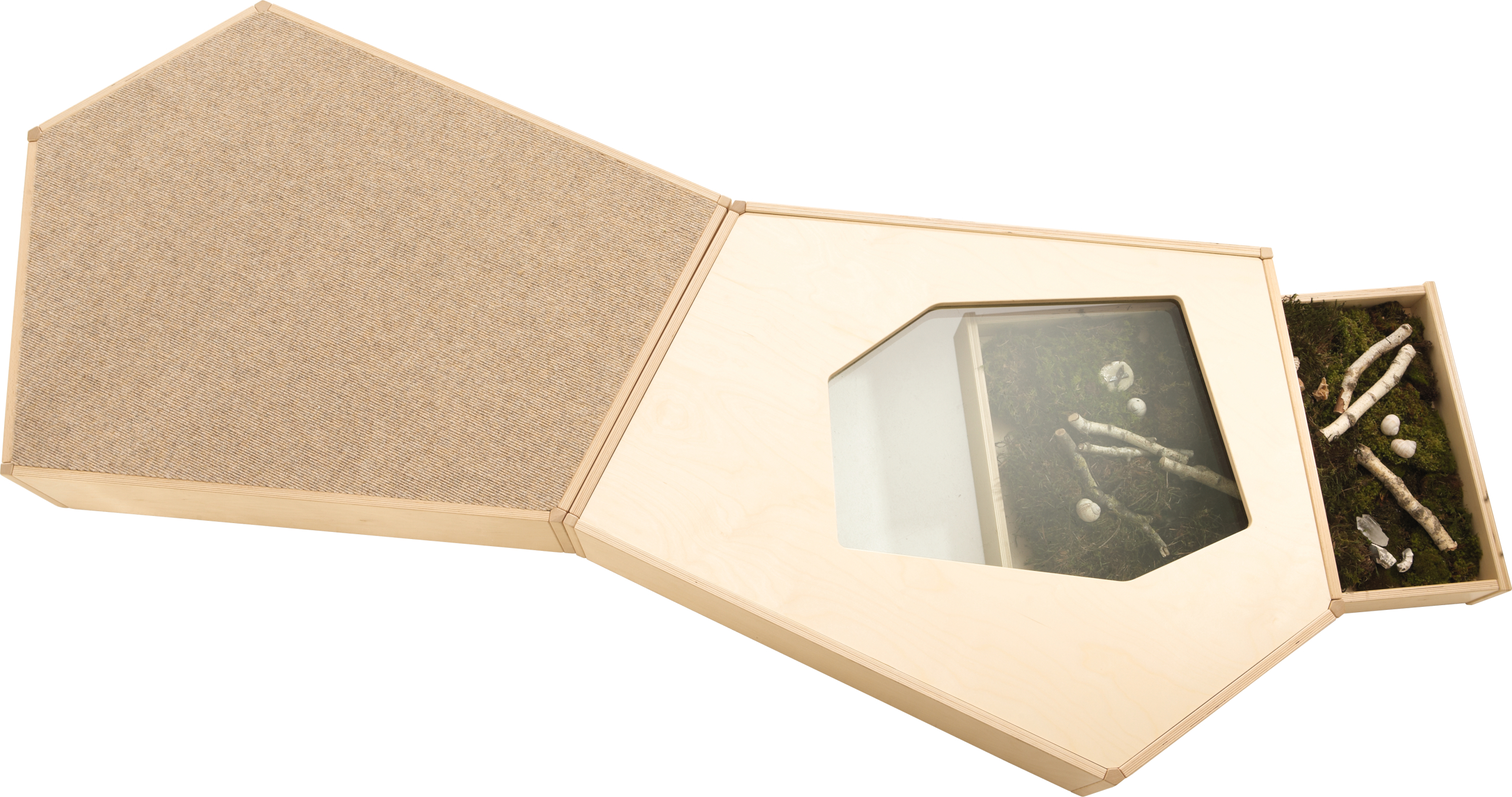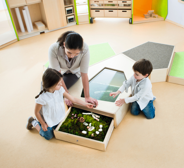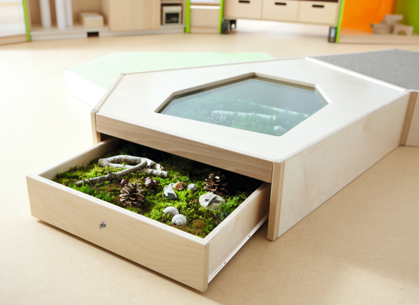 Breng de natuur naar binnen en ontdek deze spelenderwijs - dit podium met een displayruimte in de bodem van pantserglas maakt het mogelijk: de uitschuifbare lade kan worden gevuld met verschillende natuurlijke materialen. En dan is het tijd om te observeren. Lade met geleiderails en slot.