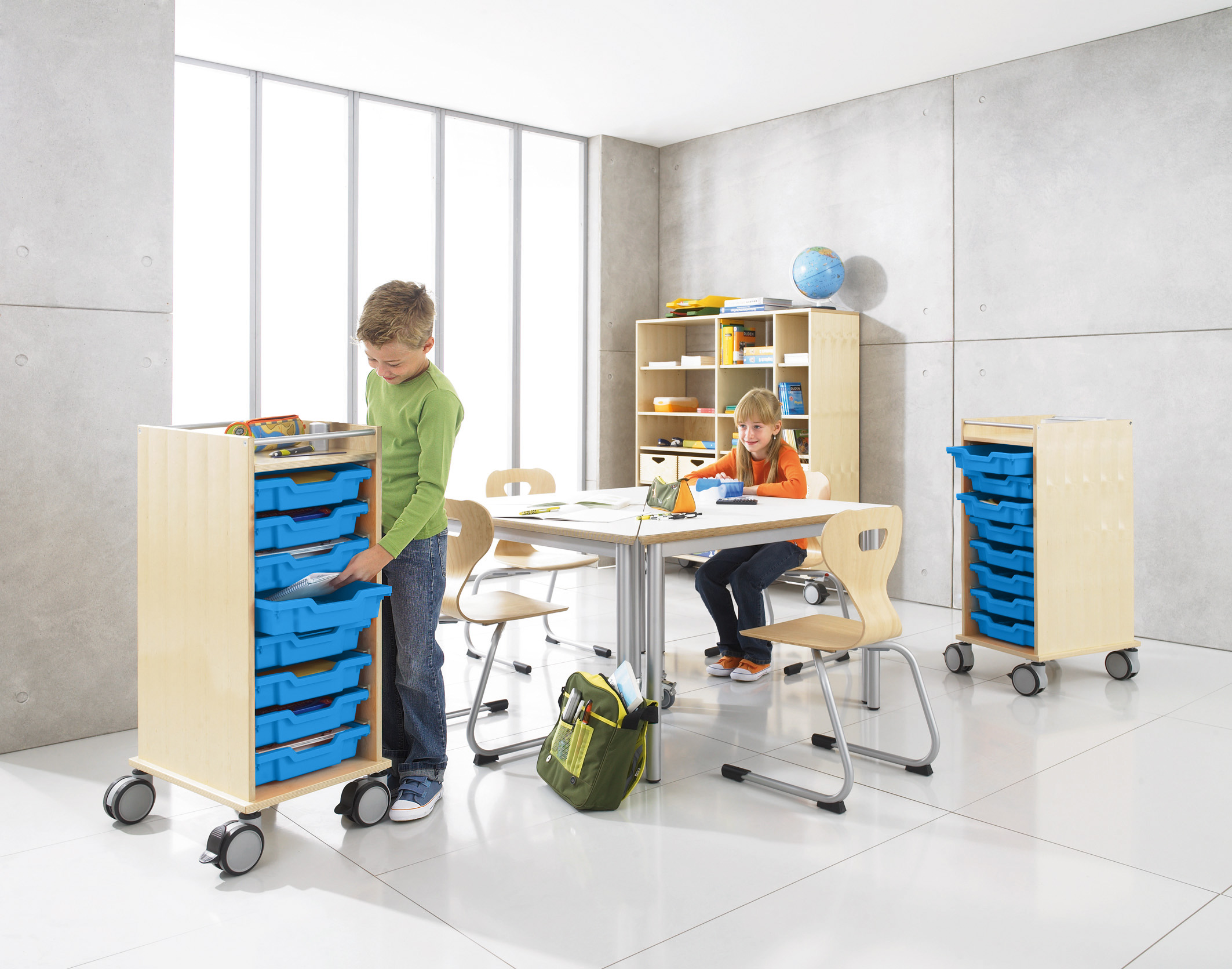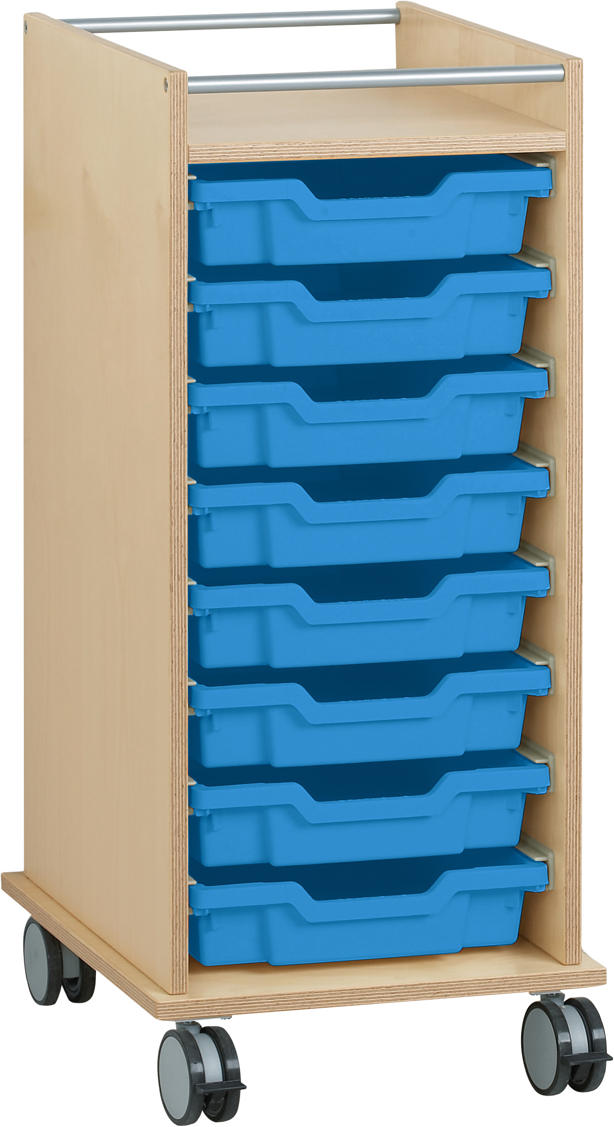 De rolwagen heeft 8 x 2 rails voor het inschuiven van kunststof materiaalboxen. Bijvoorbeeld, er passen 8 boxen met een hoogte van 7,5 cm of 4 boxen met een hoogte van 15 cm in de wagen. Het is ook mogelijk om boxen van verschillende hoogtes te gebruiken. Bovenop heeft de wagen twee dwarsstangen, zodat er niets kan vallen tijdens het rijden. Van de 4 wielen van de wagen kunnen er 2 worden vastgezet om onbedoeld wegrollen te voorkomen.