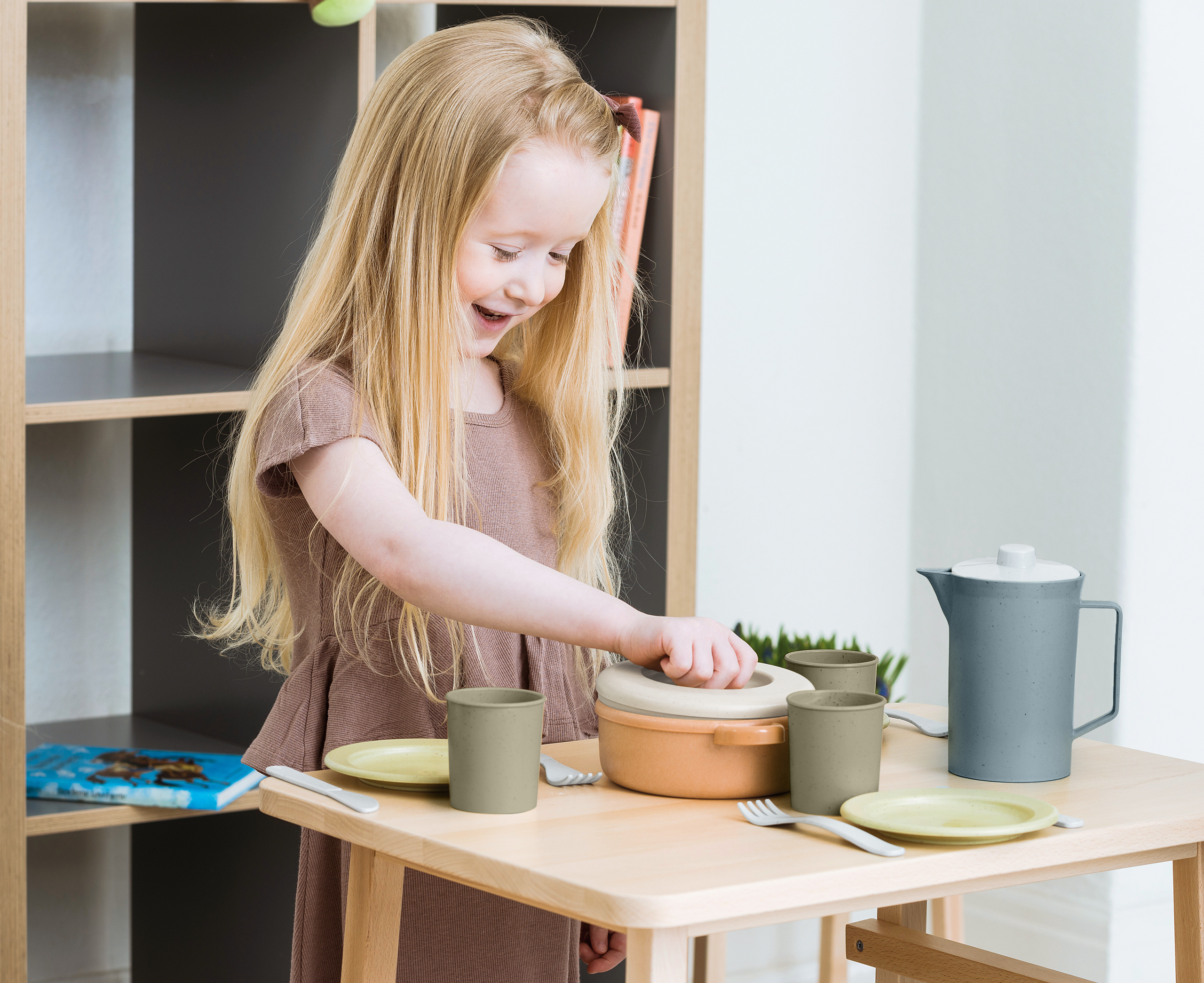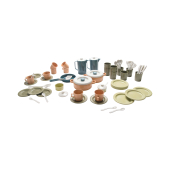Het robuuste, uitgebreide servies is perfect voor de kinderkeuken. Inhoud: 8 borden, schotels, bekers, glazen, vorken, lepels, messen en kleine lepels, 2 blikken, potten en kannen met deksel, 1 pan, 1 spatula, 1 soeplepel. Materiaal: Suikerriet, gerecycled PE-HD. Afmetingen ter vergelijking: Bord-Ø 12,8 cm, kan hoogte 12,5 cm. Leeftijd: vanaf 2 jaar