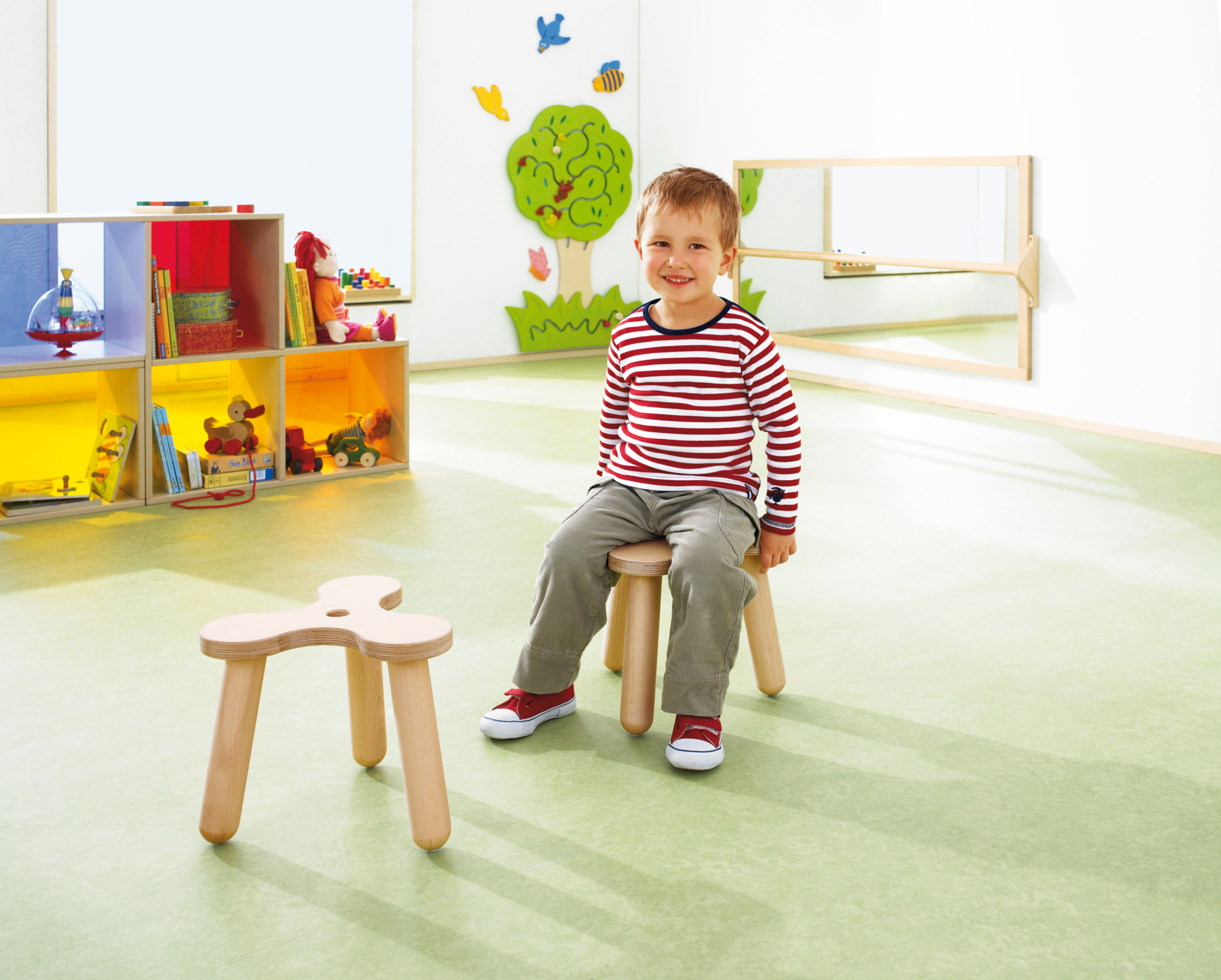 De Klaverblad kruk biedt kinderen optimale bewegingsvrijheid, zelfs tijdens het zitten. Dit is natuurlijk bijzonder belangrijk tijdens ontspannen zitten, bouwen, spelen, tekenen of knutselen. Als je de krukken naast elkaar plaatst, ontstaan er cirkels en allerlei buitengewone vormen. Als de Klaverblad kruk niet meer nodig is, kan hij vanwege zijn speciale vorm en constructie eenvoudig gestapeld worden en is daardoor in een handomdraai ruimtebesparend opgeborgen. Onder de zitting is een stalen plaat gemonteerd, waardoor de poten van massief beukenhout superstevig aan de kruk zijn bevestigd. Dit maakt de kruk bijzonder robuust. De flexibele kunststof glijders aan de voeten van de Klaverblad kruk zijn vriendelijk voor de vloer en passen zich aan aan alle gewichtsverplaatsingen van de kinderen.