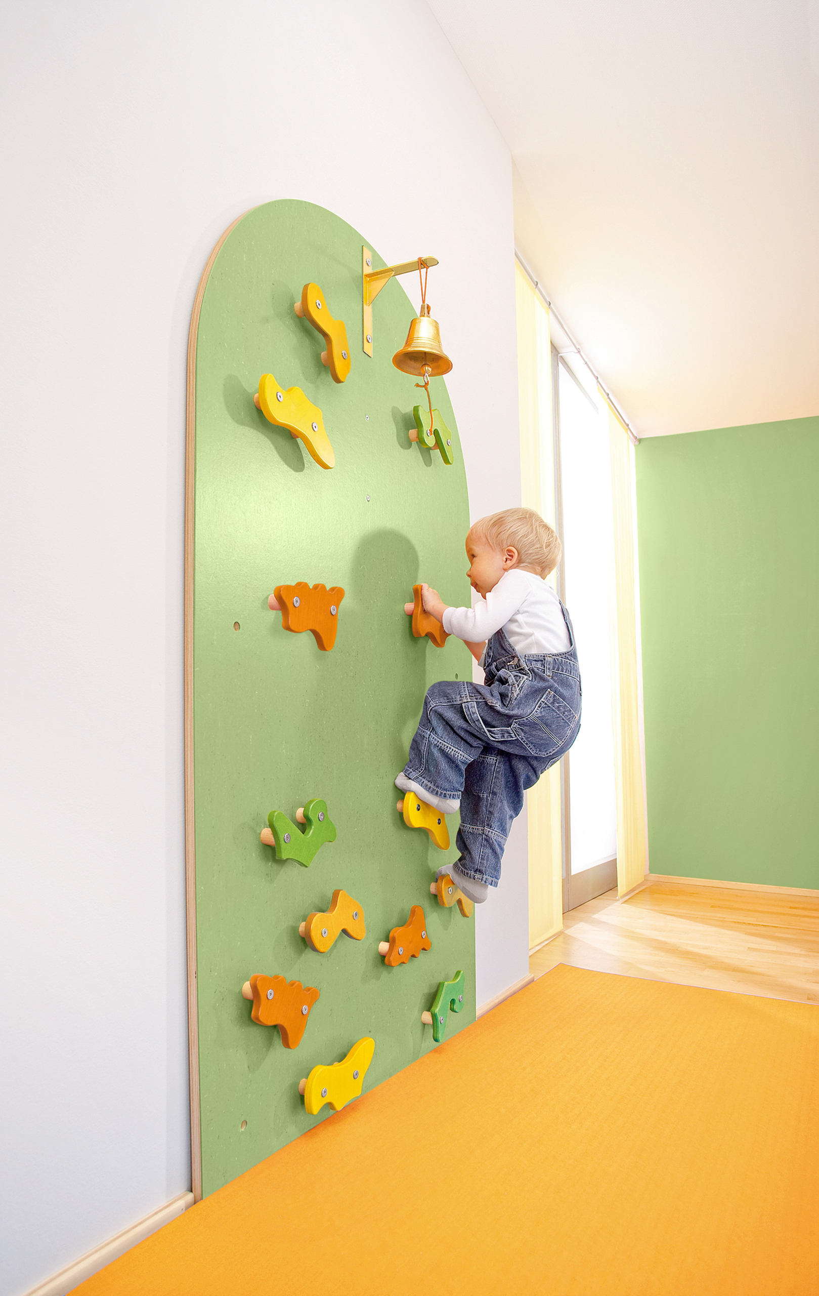 Klimervaringen voor de allerkleinsten. De 13 klimgrepen zijn al voorgemonteerd. De afstand tussen de grepen is zo gekozen dat zelfs kinderen van 1 jaar de bovenste 5 grepen kunnen bereiken door met hun handen te klimmen, maar dat hun voeten niet verder kunnen reiken dan de onderste 8 grepen. Aan de bovenkant kan een belletje of een kleine “beloning” worden bevestigd als stimulans om te klimmen. Materiaal: MDF plaat met HPL coating aan beide zijden. Afmetingen: B 94 x H 167 x D 20 cm. Max. Valhoogte: 40 cm. Een valbeveiligingsmat is daarom niet absoluut noodzakelijk.