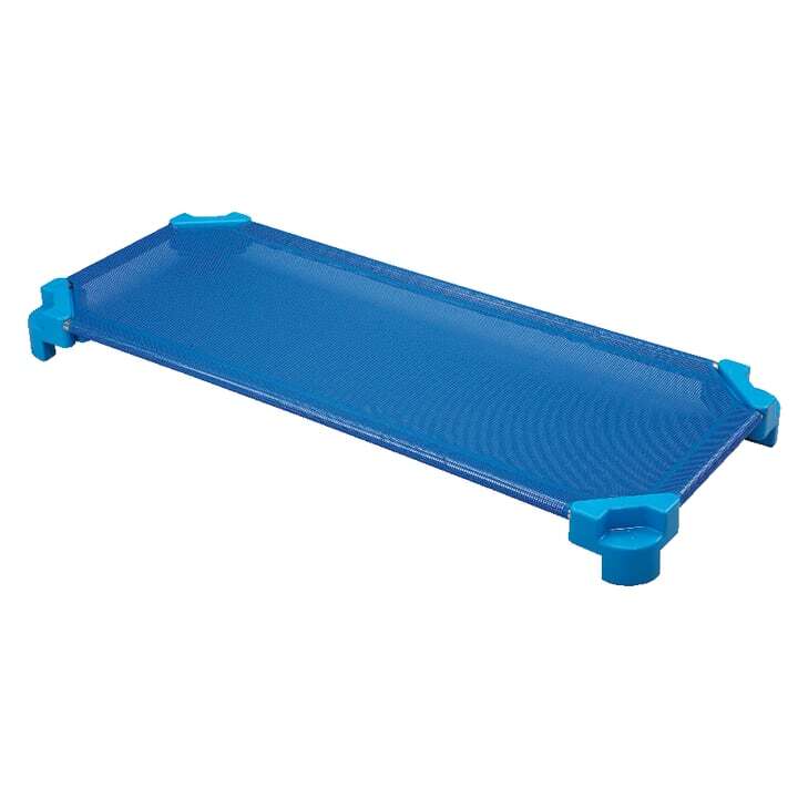Stapelbaar, met gepoedercoat aluminium frame en 4 kunststof voeten. Stabiel dankzij gelaste naden. Bekleding van lichtblauw kunststof gaas. Gedeeltelijk gedemonteerd geleverd.