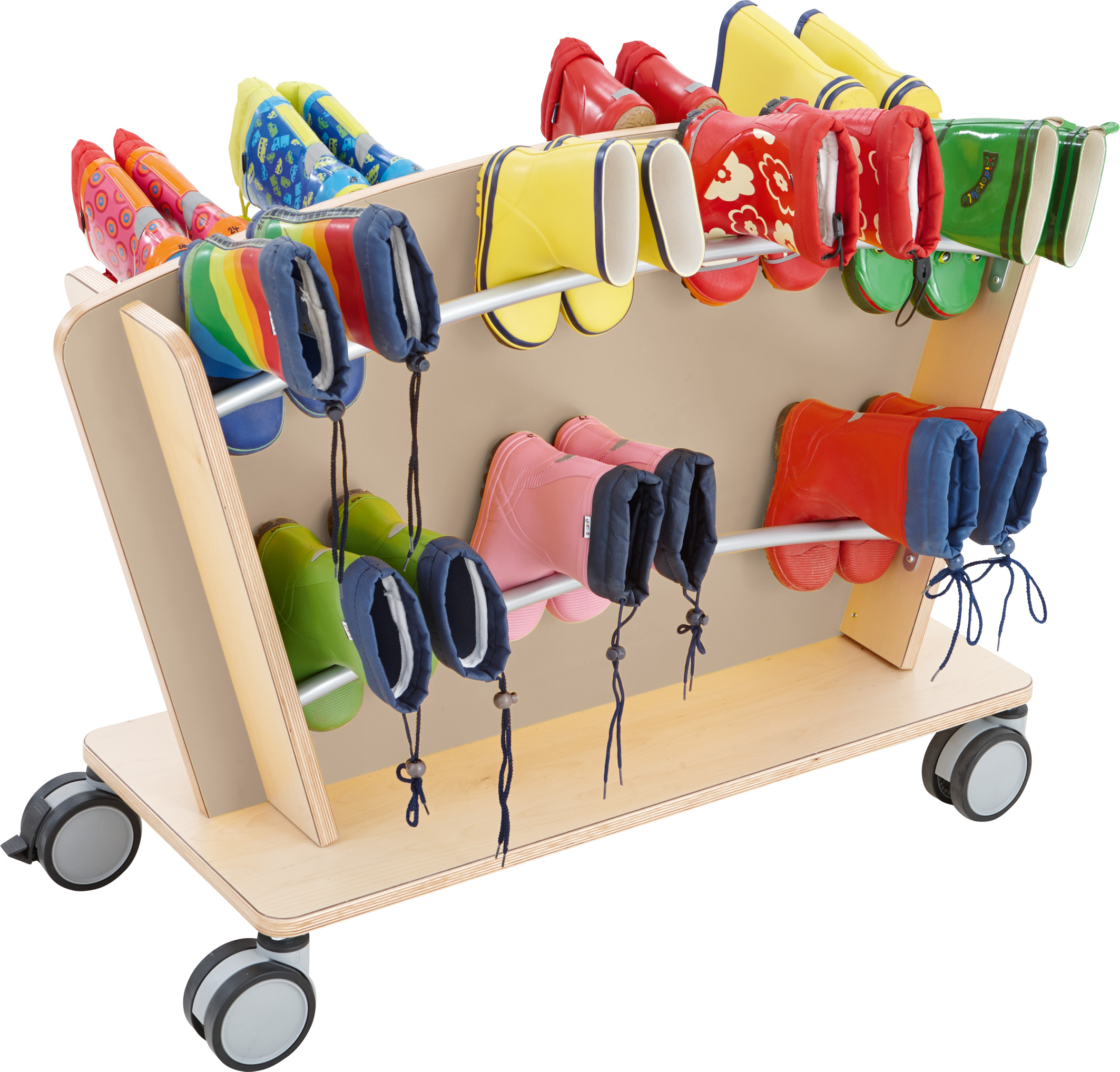 Er is ruimte voor 18 of 26 paar laarzen. De trolley heeft een gemakkelijk schoon te maken oppervlak, zodat vuil en vocht er geen vat op hebben. Met 4 wielen, waarvan 2 vergrendelbaar. Materiaal: Echt hout, lichtgekleurd fineer met Duropal oppervlak, strandbeige, stalen buis, poedercoating (RAL 9006). Afmetingen: D 40 cm