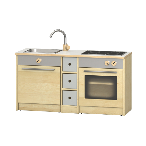 Onze lage speelkeukencombinatie Lara nodigt kinderen vanaf 2 jaar uit tot rollenspellen rond koken en huishoudelijke thema’s. De kinderkeuken van echt berkenhoutfineer heeft een oven met draaiknoppen en een deur van acrylglas, een kookplaat met kleurveranderend kookveld, een roestvrijstalen spoelbak, een draaibare kraan en een uitschuifbare vaatwasser. In drie materiaalbakken is plaats voor accessoires zoals kinderservies of bestek. Het berkenhout en de vele liefdevolle details zorgen voor een huiselijke sfeer en maken een realistische rollenspelbeleving mogelijk die de fantasie van kinderen stimuleert.