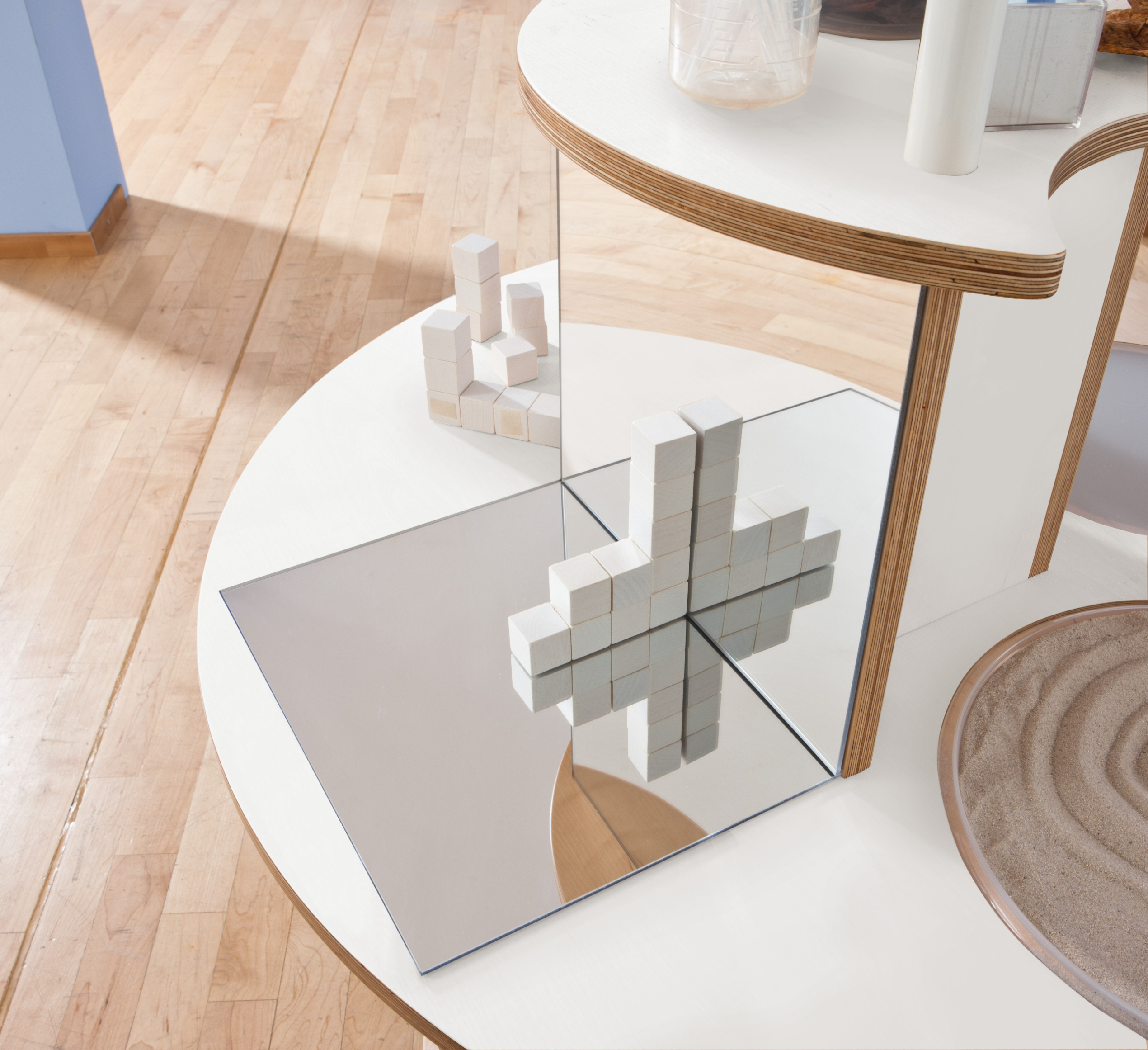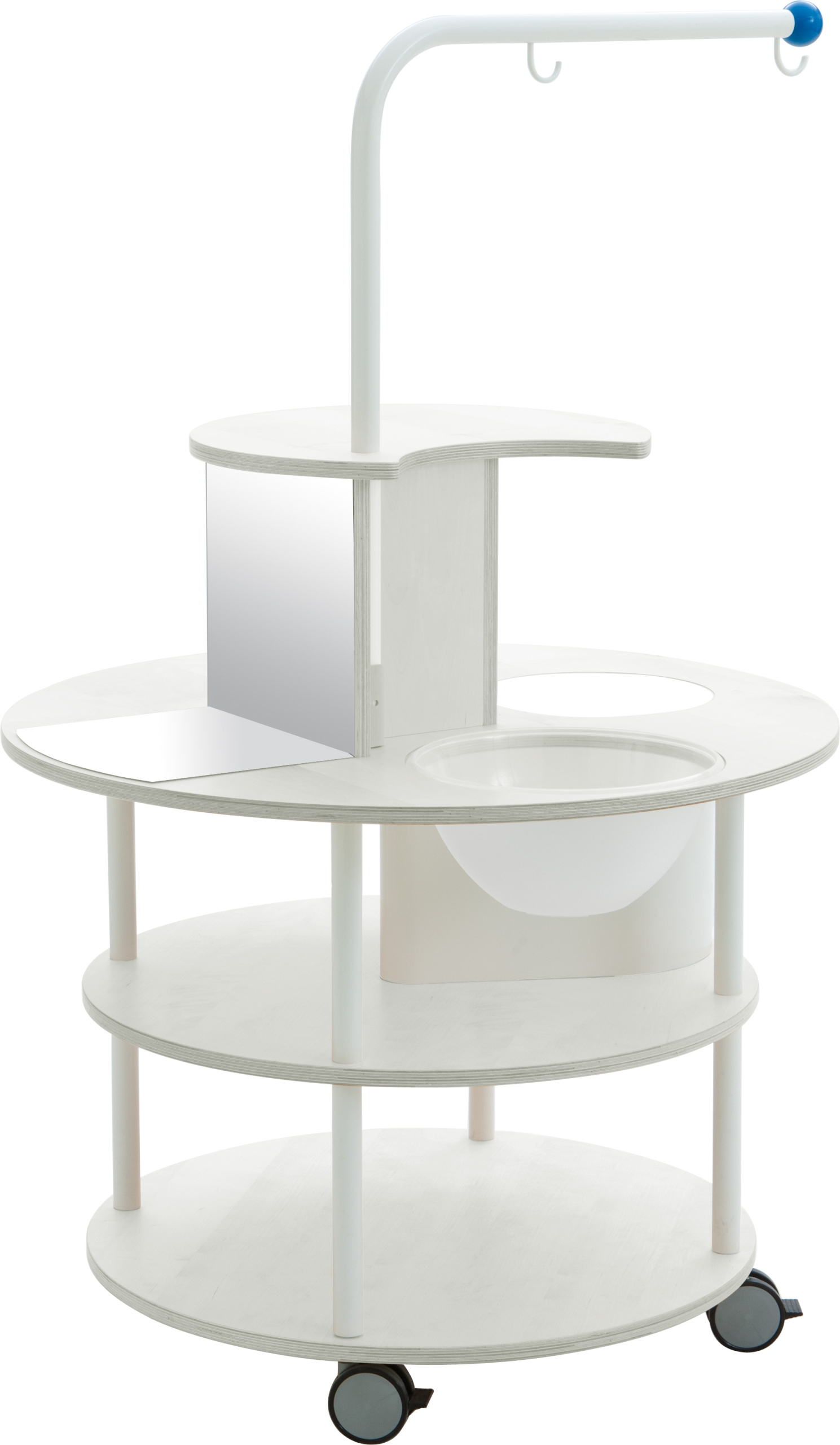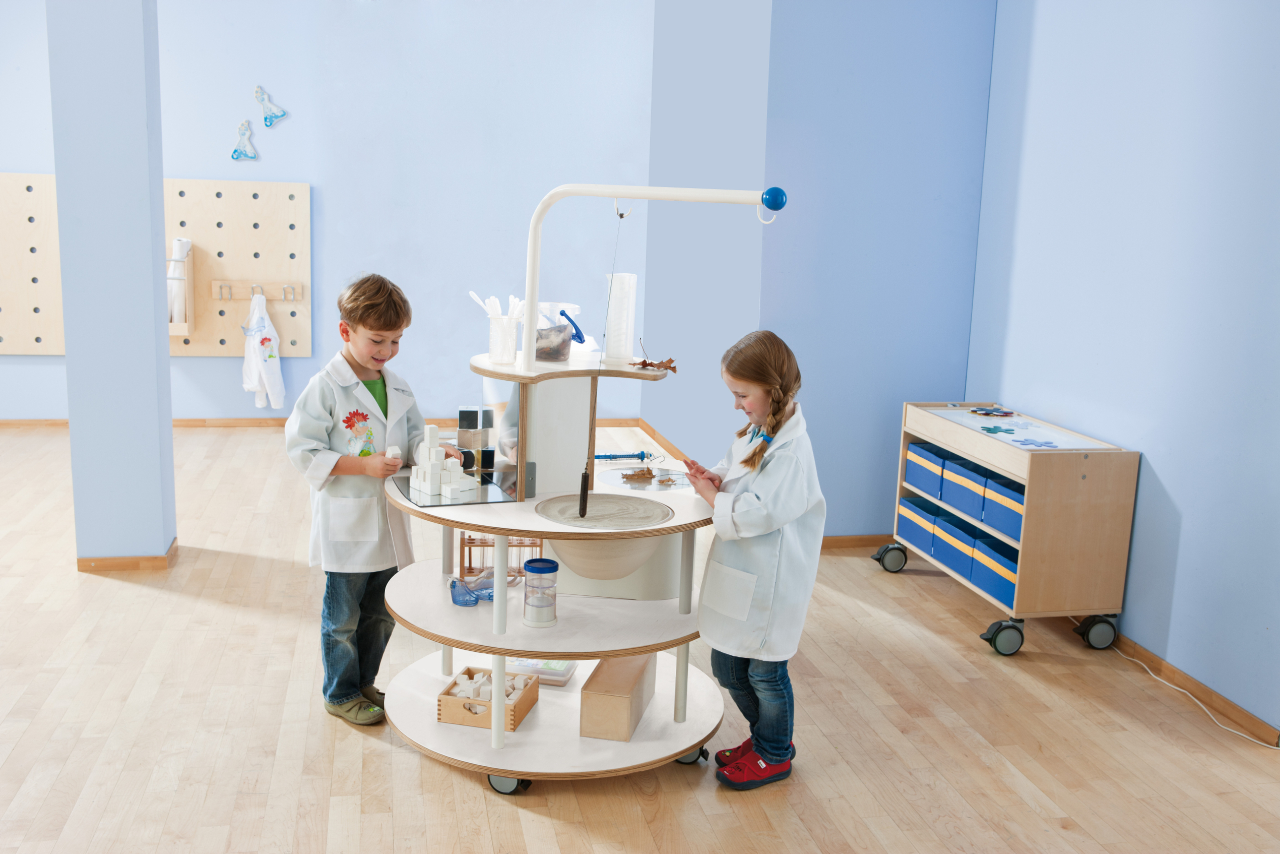 Het mobiele onderzoekslaboratorium is voor kinderen de perfecte plek om dingen te onderzoeken. In de transparante bak kunnen kleine onderzoekers experimenteren met zand en water. Omdat de bak verwijderbaar is, kan deze gemakkelijk worden gevuld en weer leeggemaakt. Op het verlichte paneel, bestaande uit een acrylplaat en LED-licht, kunnen kinderen experimenteren met licht en schaduw of bijvoorbeeld een dun blad nauwkeurig doorlichten. In de spiegelhoek verwonderen de kinderen zich over hoe verschillende objecten veranderen of vermenigvuldigen afhankelijk van het kijkpunt in de spiegel. De draaibare lastarm met 2 haken is ideaal voor experimenten boven de vloer, boven de zand-water-bak, voor katrolexperimenten of om slangen aan te hangen. Het verrijdbare onderzoekslaboratorium past door elke deur en kan daardoor elke ruimte tot een onderzoeksruimte maken. Naast de vele praktische uitrustingsdetails is er op vier niveaus voldoende opbergruimte voor onderzoeksmaterialen. Alle oppervlakken zijn gemakkelijk afwasbaar, zodat het kleine laboratorium na succesvolle en leerzame experimenten snel weer schoongemaakt kan worden.,