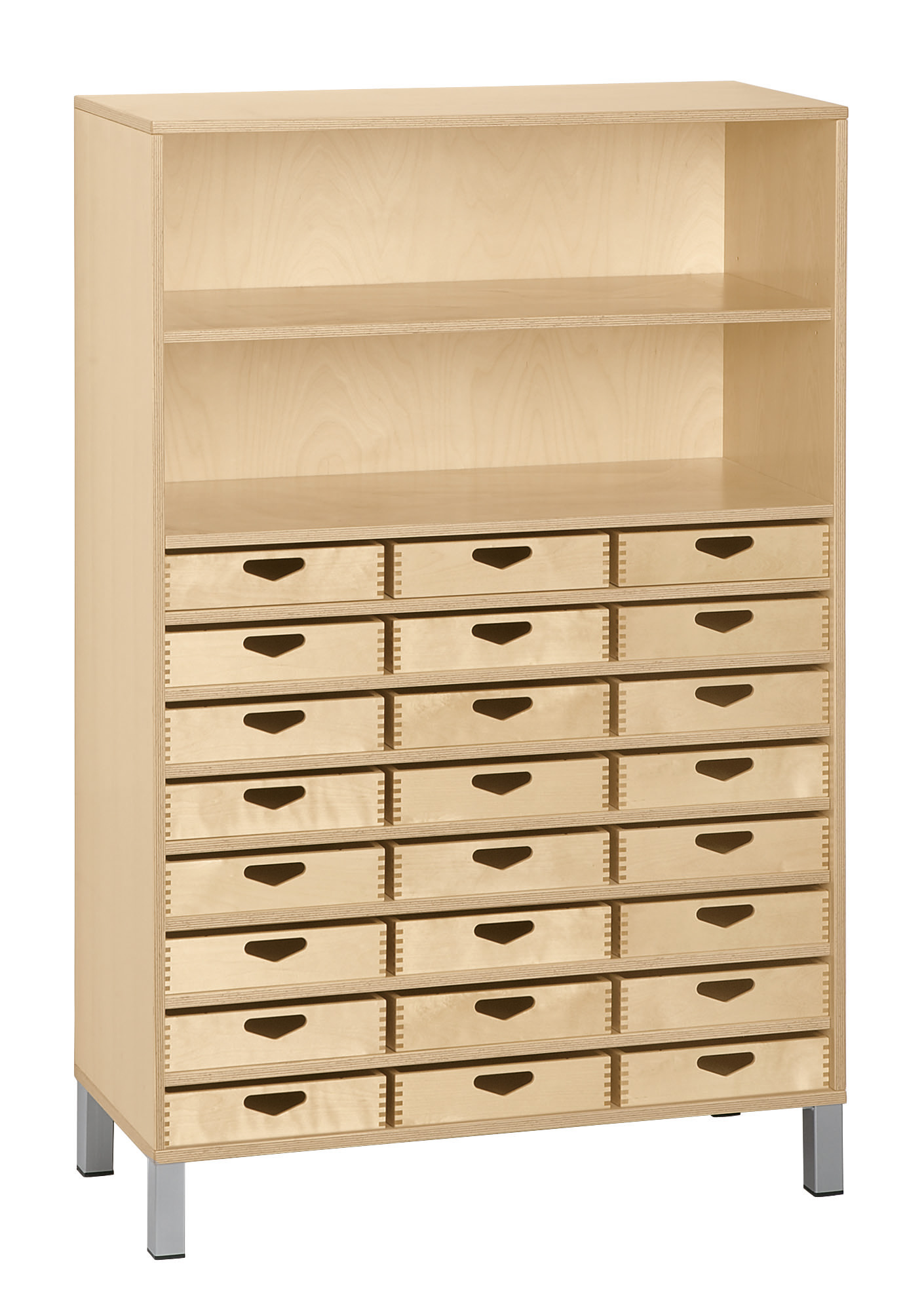 Voor elk kind in de kleuterschool of het kinderdagverblijf een eigen vak: opruimen wordt kinderspel. De kast heeft persoonlijke opbergvakken waarin kinderen tekeningen, knutselwerkjes en nog veel meer kunnen opbergen in een lade die speciaal voor hen is bestemd. Het lange zoeken naar spullen behoort tot het verleden. U kunt de vakken in verschillende kleuren bestellen om de kast aan te passen aan het kleurconcept van uw instelling. Twee plankvakken boven de persoonlijke opbergvakken bieden extra opbergruimte. Of het nu met of zonder wielen is, met een houten sokkel of metalen poten... u kunt de kastonderbouw kiezen op basis van uw behoeften. Voor een flexibele en multifunctionele inrichting van de ruimte kunt u de persoonlijke opbergkast combineren met andere meubels uit de Move.Upp serie. Zo ontstaat een ruimte die is afgestemd op uw wensen en de behoeften van de kinderen. Binnenmaten van de vakken: B 27 x H 6 x D 33 cm.