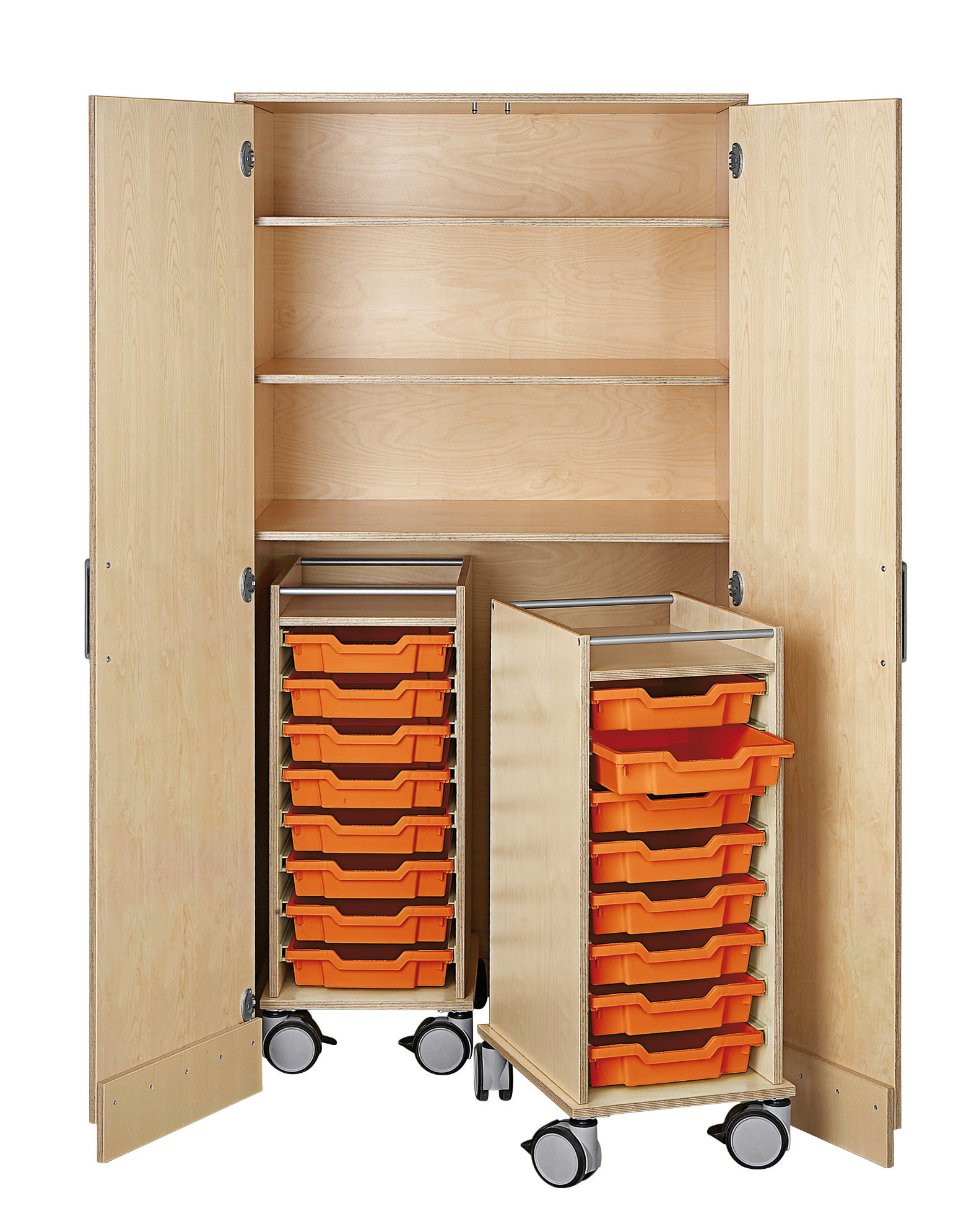 Achter de twee deuren van de materiaalkast is er veel ruimte voor papier, verf, penselen en allerlei andere belangrijke teken- en knutselbenodigdheden die niet mogen ontbreken in het klaslokaal. De twee legplanken kunnen vrij worden geplaatst in de materiaalkast en zijn dus aanpasbaar naar behoefte. Een klein kenmerk onderscheidt de materiaalkast van alle andere kasten: naast de planken waarop alle teken- en knutselbenodigdheden kunnen worden opgeborgen, zijn er hier ook twee rolwagens met plaats voor elk tot 9 materiaalkisten. Dankzij de rolwagens kunnen knutselmaterialen gemakkelijk worden vervoerd en bespaart u veel tijd als spullen van de ene naar de andere plaats moeten worden gebracht. Bovendien zijn de spullen in de kisten overzichtelijk opgeruimd. Zo blijft er meer tijd over voor creativiteit! De rolkast-materiaalkast wordt geleverd zonder materiaalkisten. Maar u kunt bij ons de kisten bestellen die bij uw behoeften passen in uw gewenste kleur en formaat!