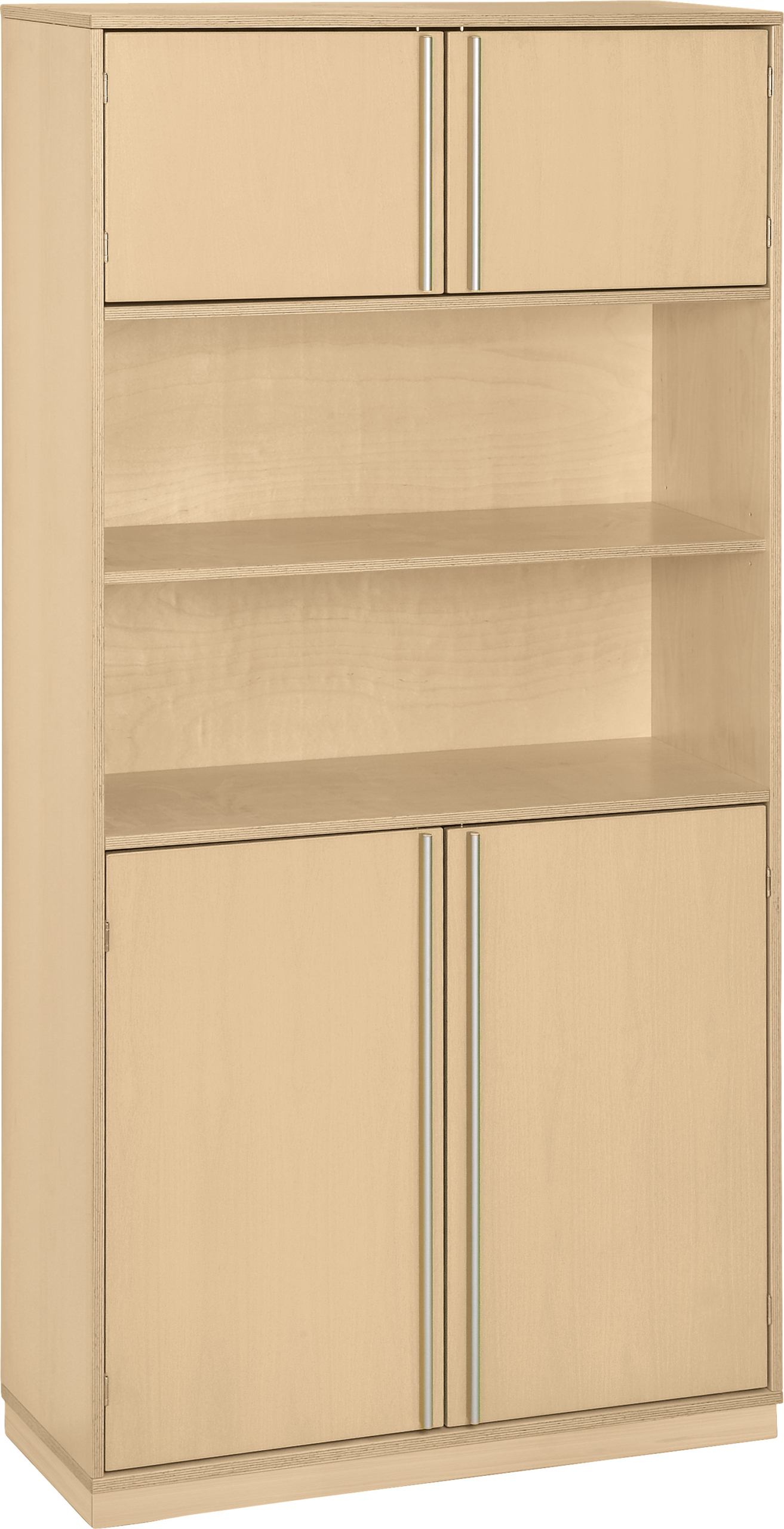 Achter de vier deuren en in de vakken van de hoge kast vinden speelgoed, mappen en boeken hun plek. De 4 inlegplanken kunt u vrij in de kast plaatsen en zo de hoogte van de legplanken aanpassen aan uw behoeften. Achter de deuren passen geen materiaalbakken. De kast is gemaakt van berkenhout en is daardoor bijzonder robuust. De inlegplanken worden in de kast bevestigd met metalen plankdragers en zijn dus beschermd tegen uittrekken. Aanslagstoppers voorkomen dat de deuren hard dichtslaan. U kunt de hoge kast vrij combineren met alle andere kasten uit de Move.Upp serie. Ontwerp uw opslagruimte precies zoals u dat wilt.