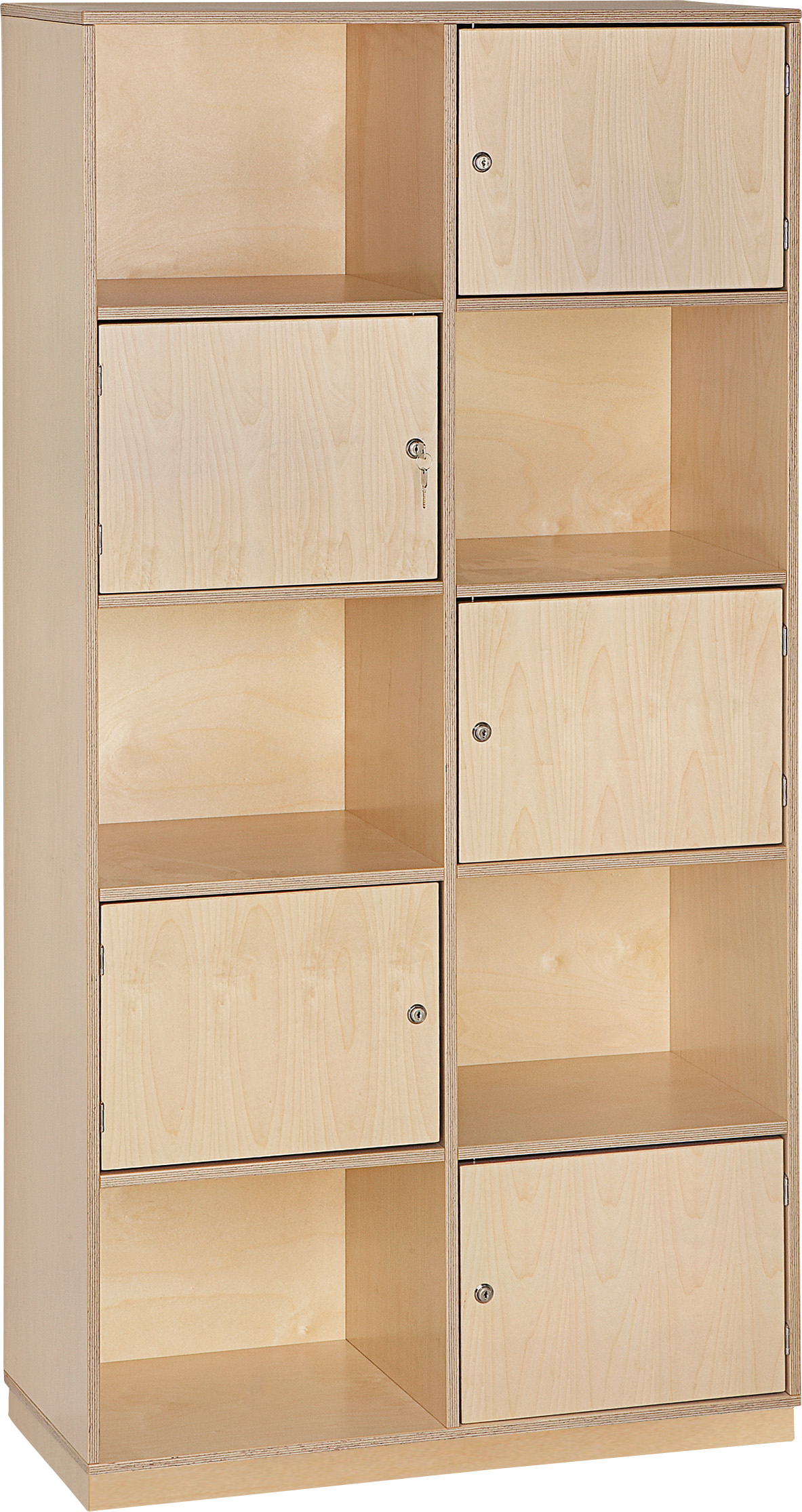 Met 5 afsluitbare eigendomsvakken en 5 open vakken biedt de kast ruimte voor diverse persoonlijke eigendommen. Achter de deuren passen geen materiaalbakken. De kast wordt alleen geleverd met een sokkel.