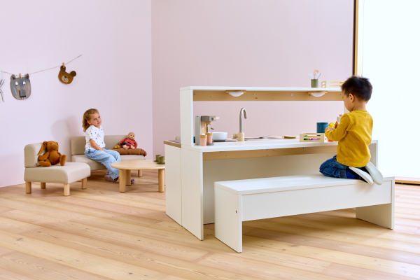 Een slimme aanvulling op het Nuka keukenblok is de Nuka balie met bank, waarmee veelzijdige rollenspellen plaats kan vinden. In combinatie met de lage keuken ontstaat een element dat aan beide zijden bespeelbaar is. De balie kunnen gebruiken in hun spel. Op het ene moment is het een restaurant en op een ander moment de wachtkamer bij de dokter.  Als los element kan de balie aan de muur worden gemonteerd. De balie heeft een slijtvaste en onderhoudsvriendelijke werkbladoppervlakte.