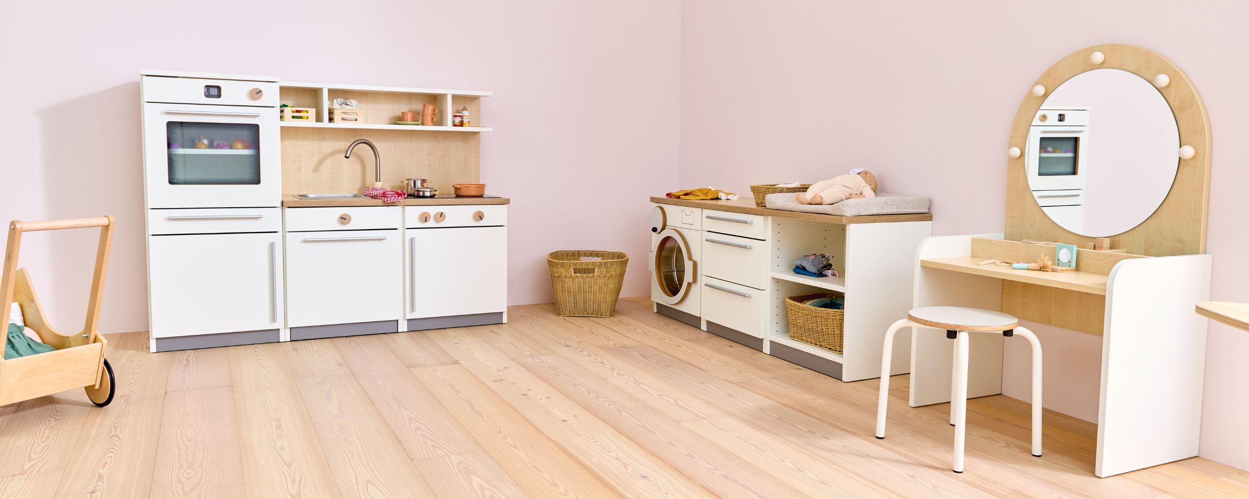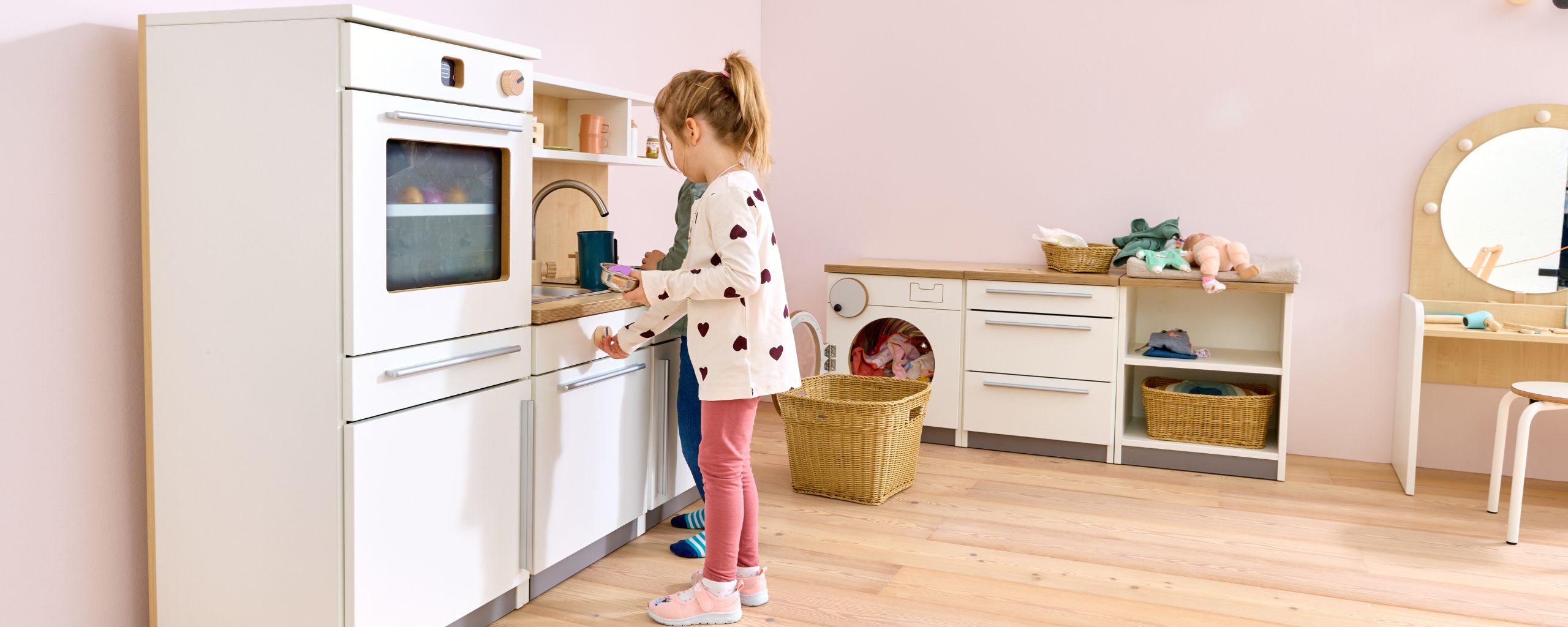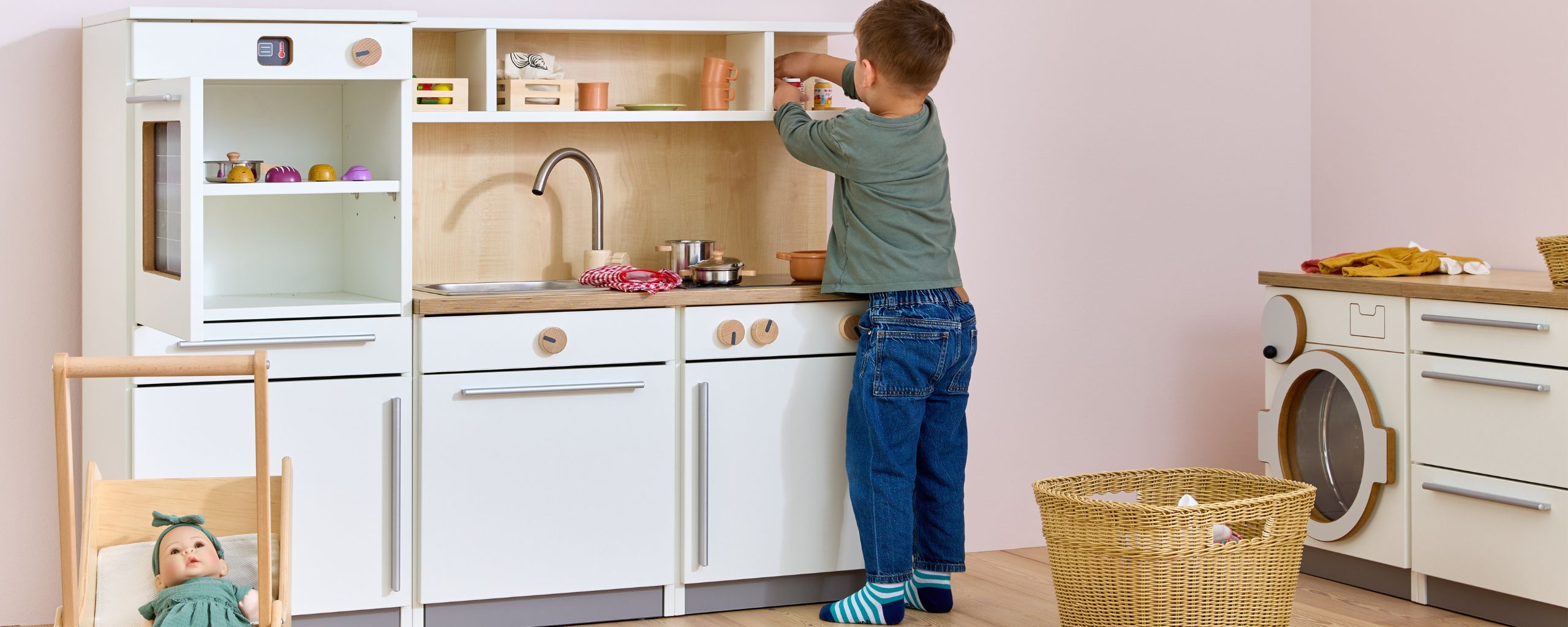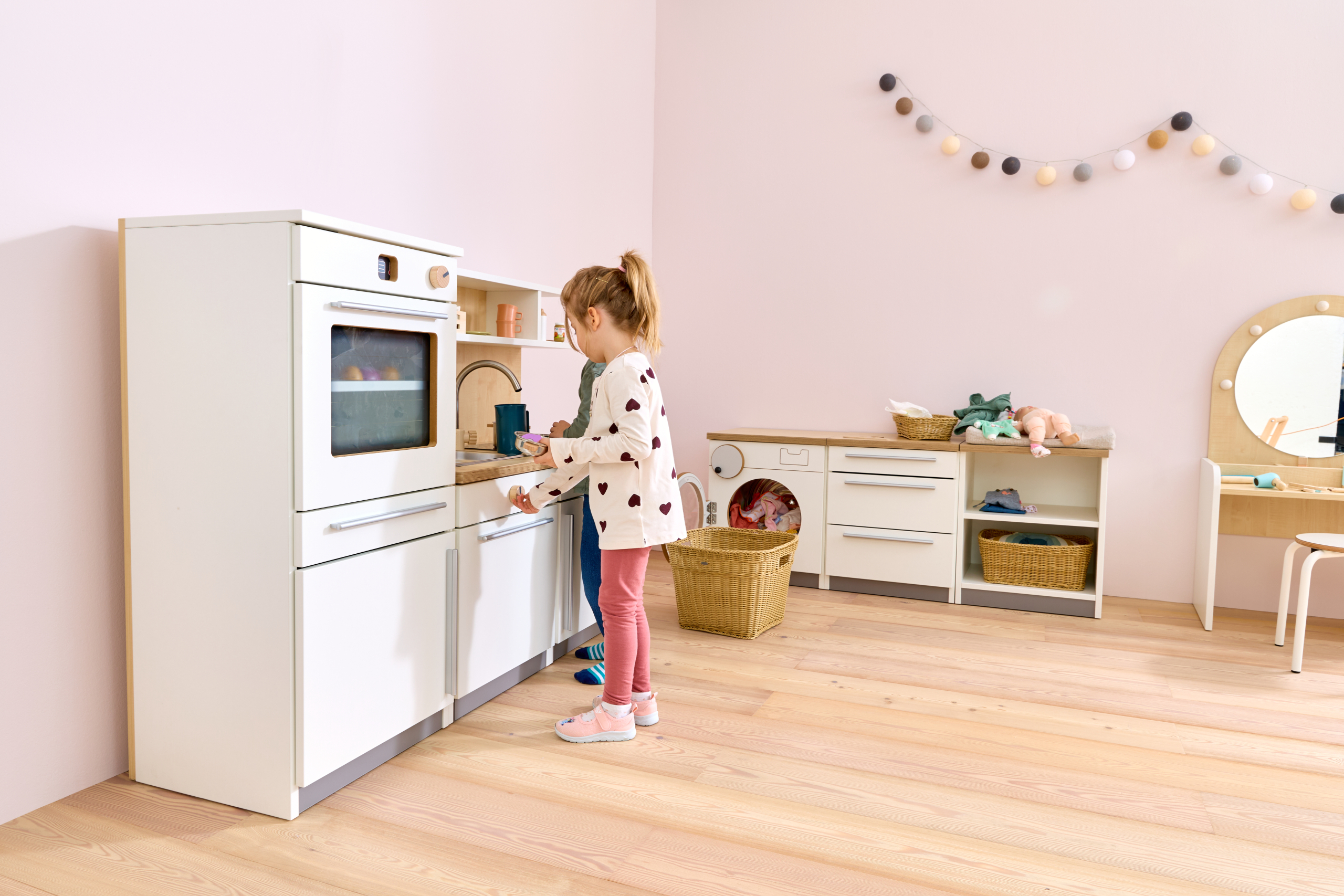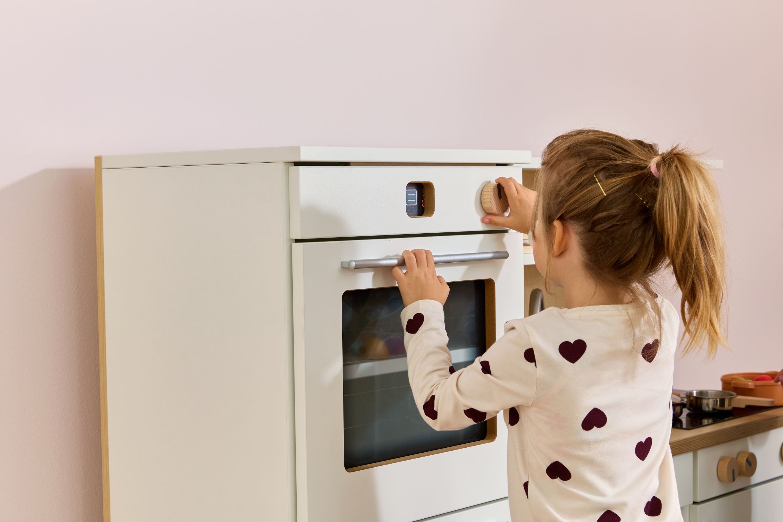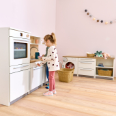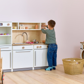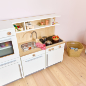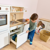 De Nuka speelkeuken nodigt kinderen vanaf 2 jaar uit tot rollenspellen rond koken en huishoudelijke activiteiten. De moderne kinderkeuken beschikt over een oven met draaiknoppen en een deur van acrylglas, een koelkast met transparante legplanken, een kookplaat met kleurveranderend kookveld, een spoelbak, een draaibare kraan en een uittrekbare vaatwasser. In een onderkast en in de planken boven het werkblad is ruimte voor accessoires zoals kinderservies of kookgerei. Liefdevolle details, zoals draaibare knoppen op oven, kookplaat en vaatwasser, zorgen voor een realistische speelervaring die de fantasie van kinderen stimuleert.