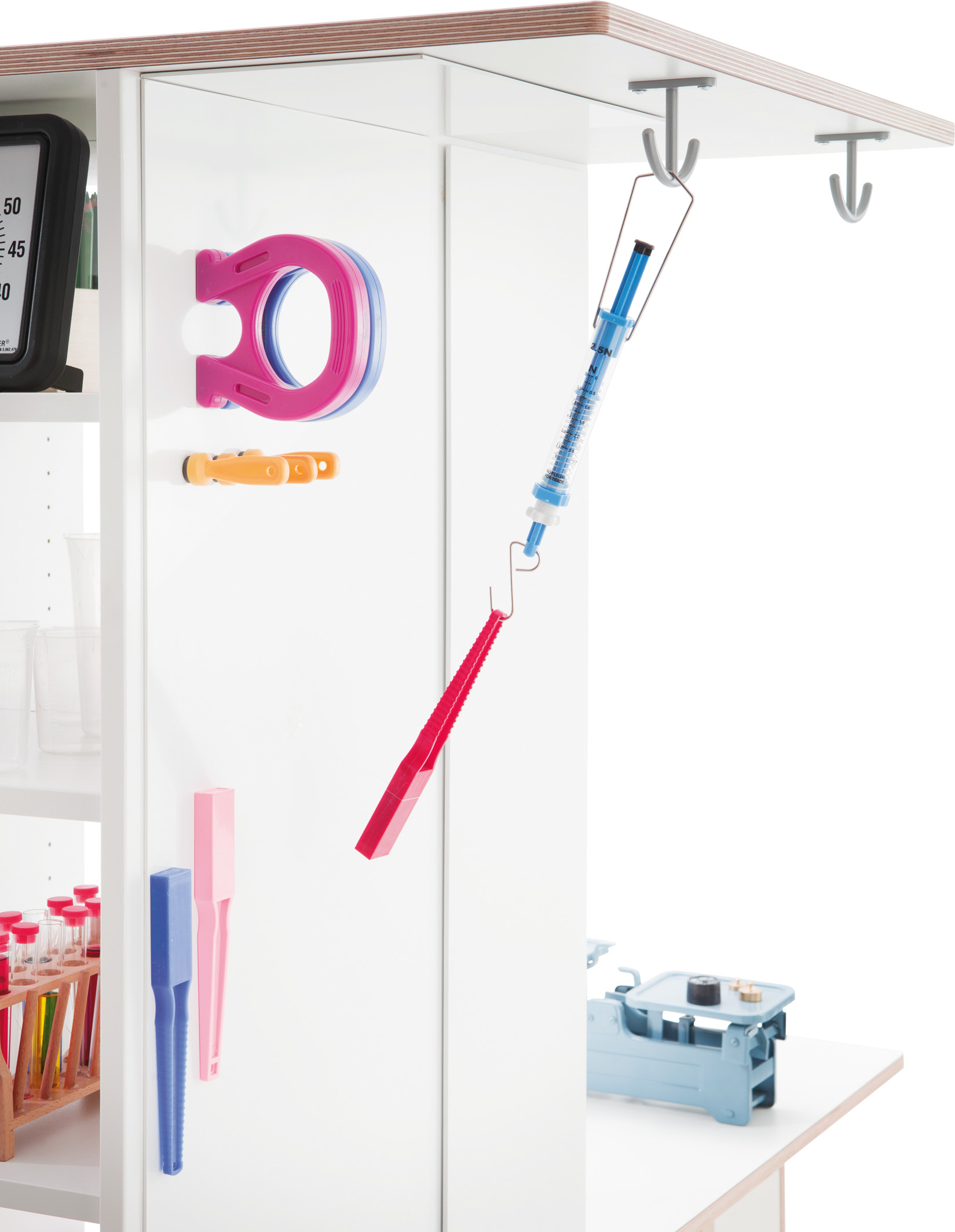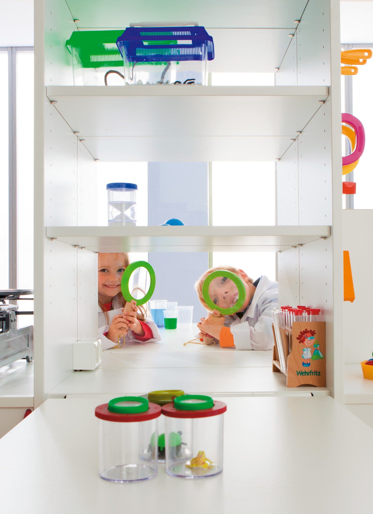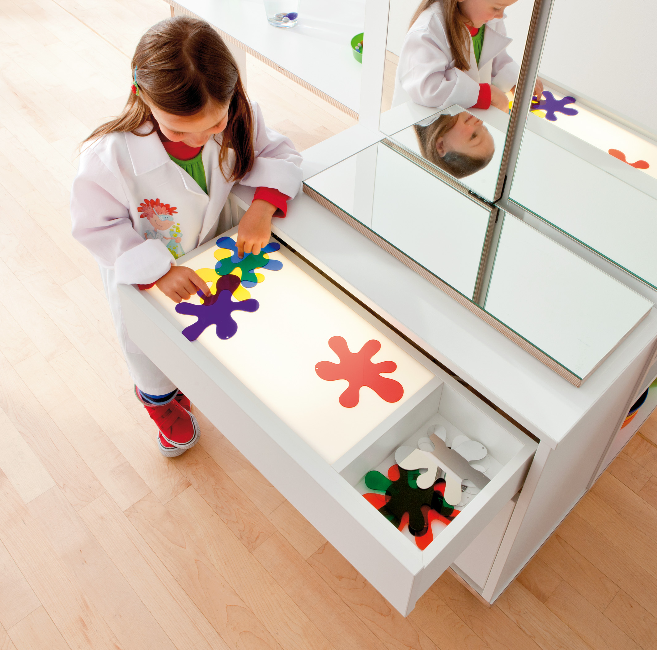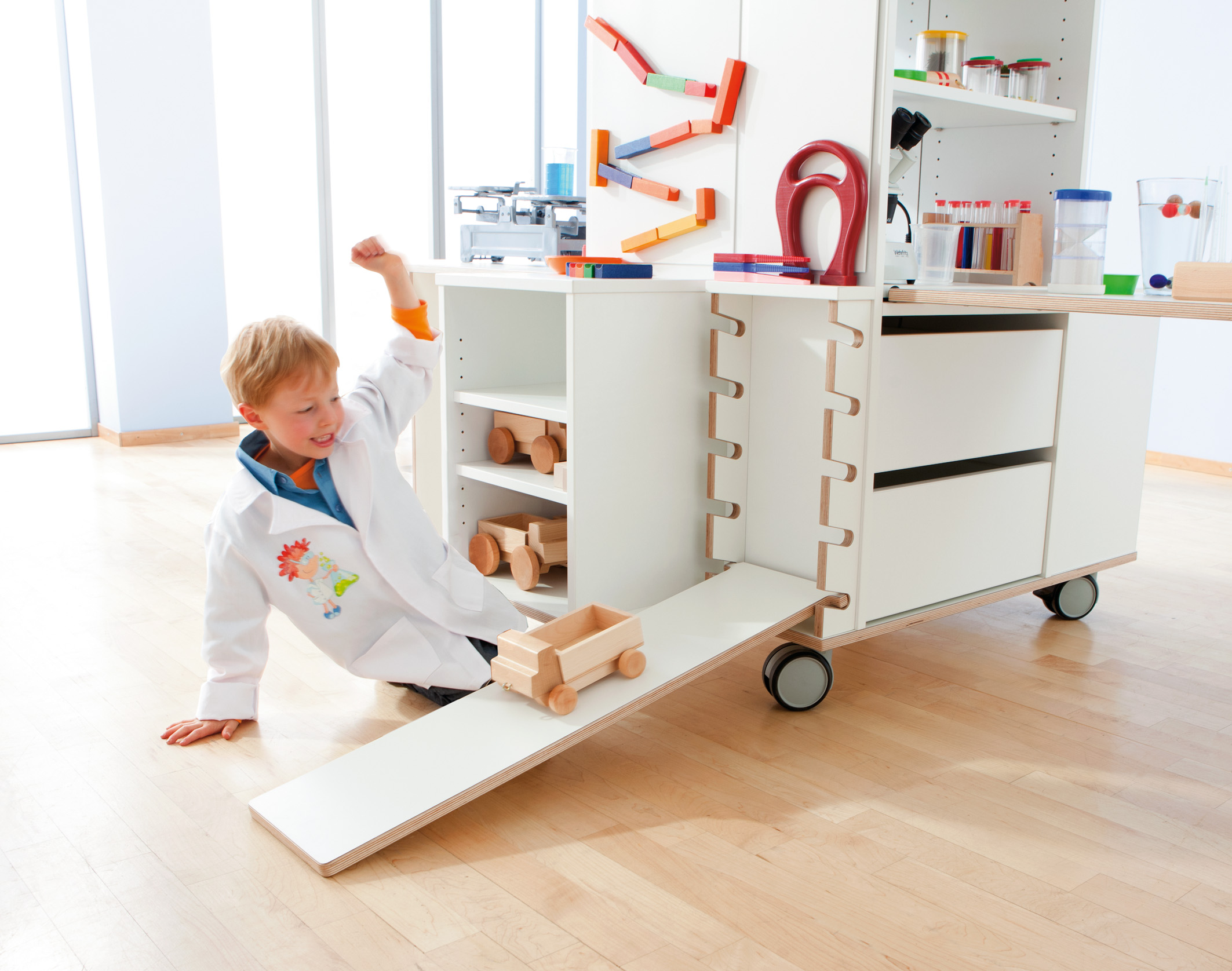 Volledig uitgeklapt biedt de Onderzoekstoren veel ruimte om te experimenteren. Als de tafels zijn ingeklapt, kan hij ruimtebesparend in de hoek worden geschoven. Hij heeft veel minder ruimte nodig dan elk ander onderzoekslaboratorium met vergelijkbare uitrusting. En hij past door elke deur, zodat een ruimtewissel altijd mogelijk is. Met zijn vele details wekt hij nieuwsgierigheid en enthousiasme voor ontdekking op. De Onderzoekstoren biedt bijna onbeperkte mogelijkheden voor boeiende natuurwetenschappelijke projecten. Twee uitklapbare tafels tegenover elkaar bieden plaats aan twee kinderen om tegelijkertijd te experimenteren. Dankzij een acrylplaat als tussenwand heeft u beide onderzoekers altijd in het oog en kunnen ze elkaar observeren tijdens het experimenteren. Aan de toren bevinden zich twee spiegeloppervlakken, waarvan er één kan worden uitgeklapt, evenals een draagbare spiegel (veilig opgeborgen in de onderste lade). Indien nodig kunnen de spiegels worden gecombineerd tot een vierzijdige spiegelkast. Een lichtbak nodigt uit tot fascinerende lichtexperimenten. De oppervlakken zijn gemakkelijk afwasbaar, wat het onderzoekslaboratorium zeer onderhoudsvriendelijk maakt. Alle werkbladen zijn op een hoogte van 67 cm afgestemd op kinderen in de kleuterklas.