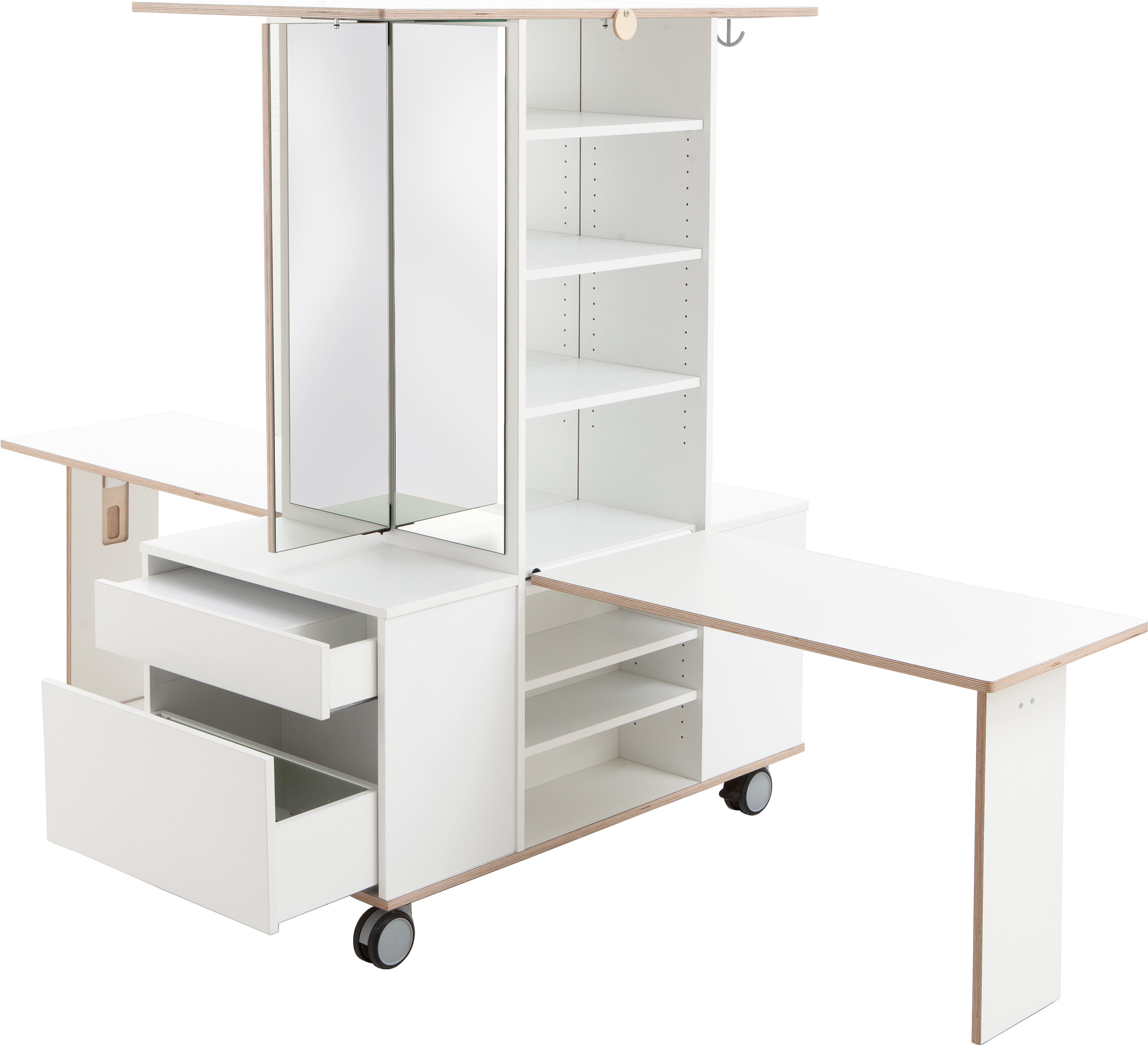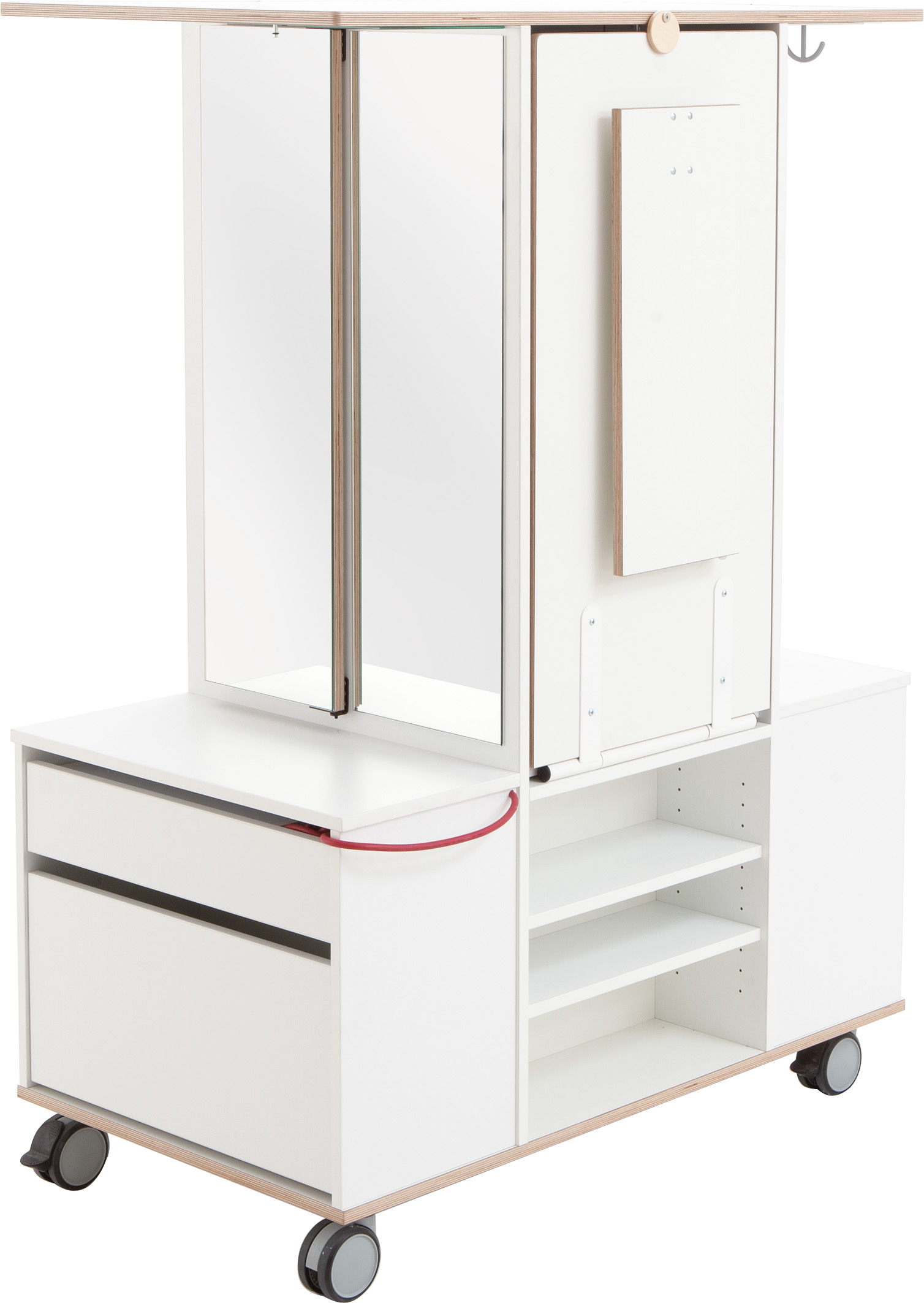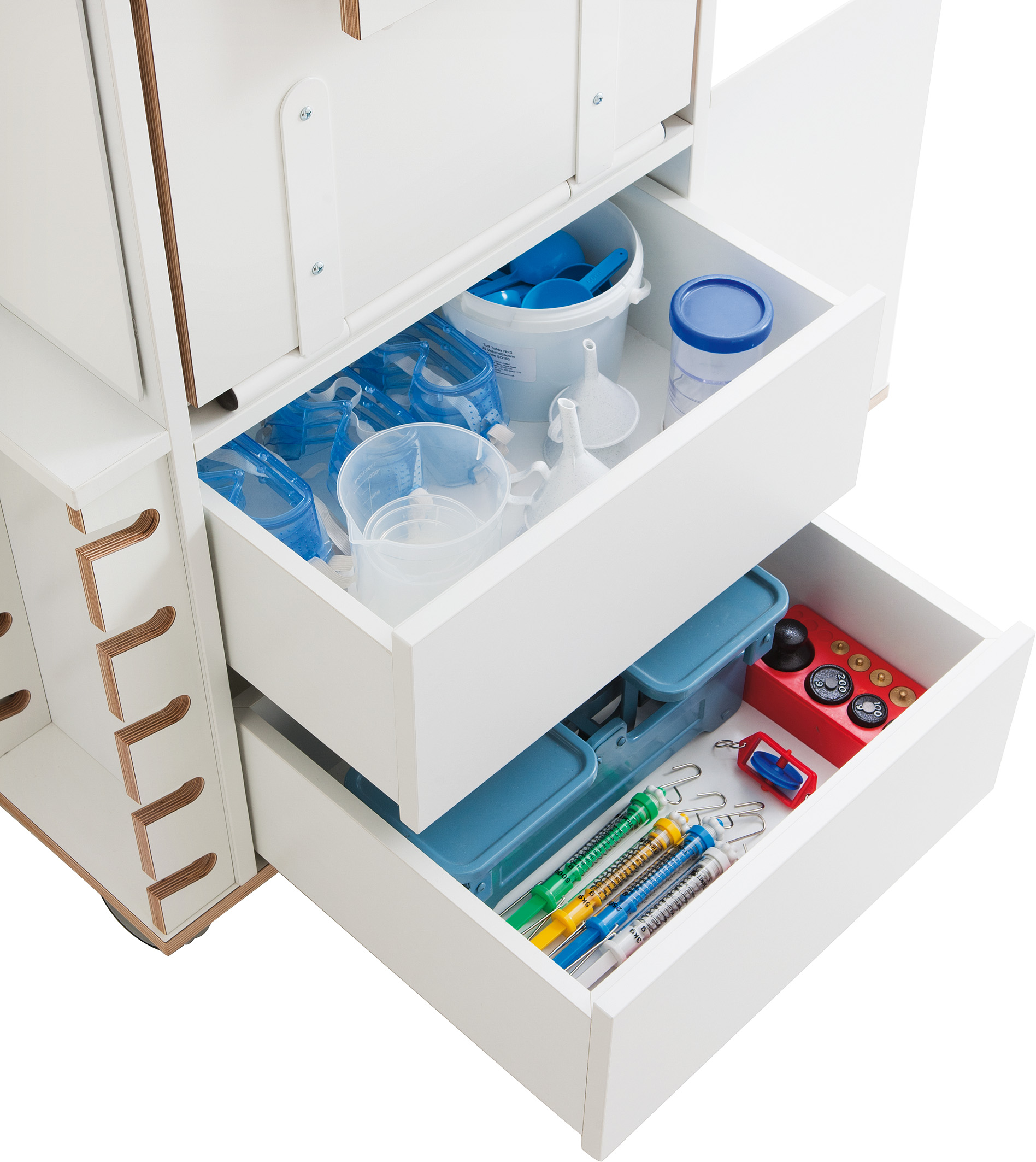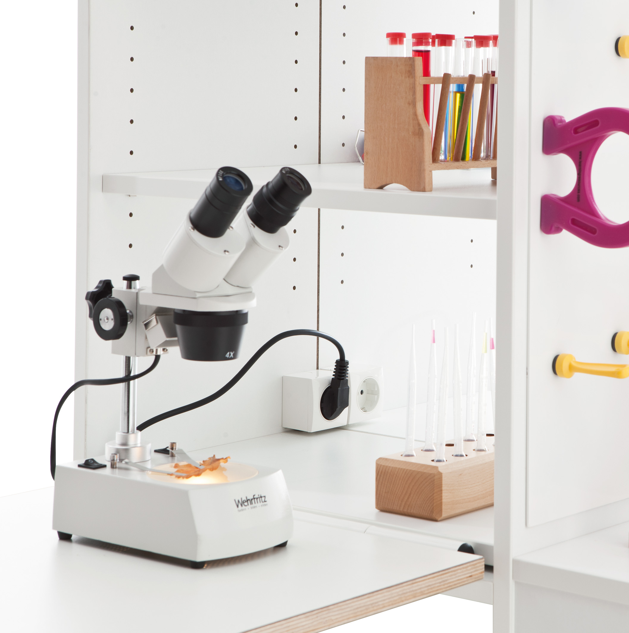 Volledig uitgeklapt biedt de Onderzoekstoren veel ruimte om te experimenteren. Als de tafels zijn ingeklapt, kan hij ruimtebesparend in de hoek worden geschoven. Hij heeft veel minder ruimte nodig dan elk ander onderzoekslaboratorium met vergelijkbare uitrusting. En hij past door elke deur, zodat een ruimtewissel altijd mogelijk is. Met zijn vele details wekt hij nieuwsgierigheid en enthousiasme voor ontdekking op. De Onderzoekstoren biedt bijna onbeperkte mogelijkheden voor boeiende natuurwetenschappelijke projecten. Twee uitklapbare tafels tegenover elkaar bieden plaats aan twee kinderen om tegelijkertijd te experimenteren. Dankzij een acrylplaat als tussenwand heeft u beide onderzoekers altijd in het oog en kunnen ze elkaar observeren tijdens het experimenteren. Aan de toren bevinden zich twee spiegeloppervlakken, waarvan er één kan worden uitgeklapt, evenals een draagbare spiegel (veilig opgeborgen in de onderste lade). Indien nodig kunnen de spiegels worden gecombineerd tot een vierzijdige spiegelkast. Een lichtbak nodigt uit tot fascinerende lichtexperimenten. De oppervlakken zijn gemakkelijk afwasbaar, wat het onderzoekslaboratorium zeer onderhoudsvriendelijk maakt. Alle werkbladen zijn op een hoogte van 67 cm afgestemd op kinderen in de kleuterklas.