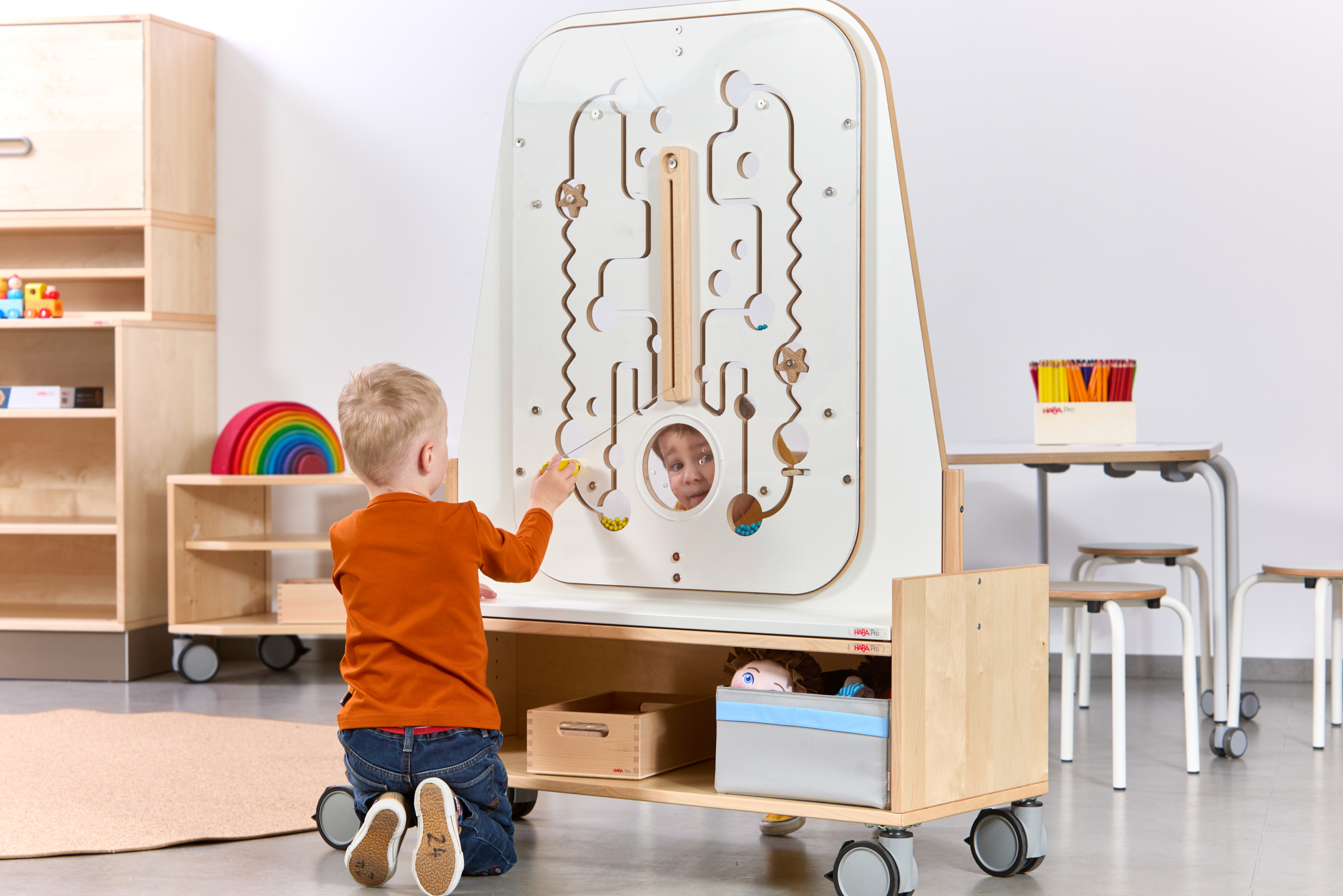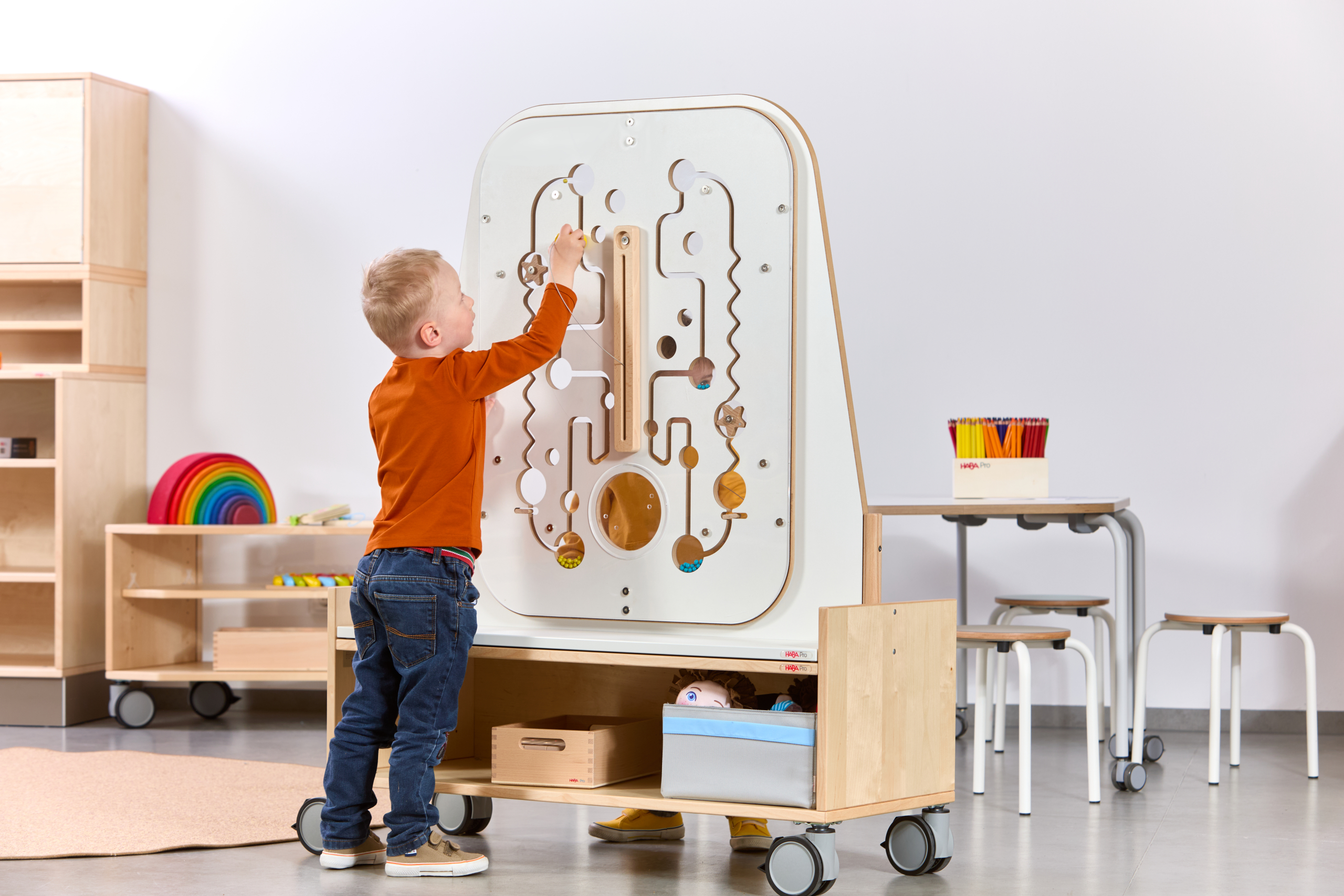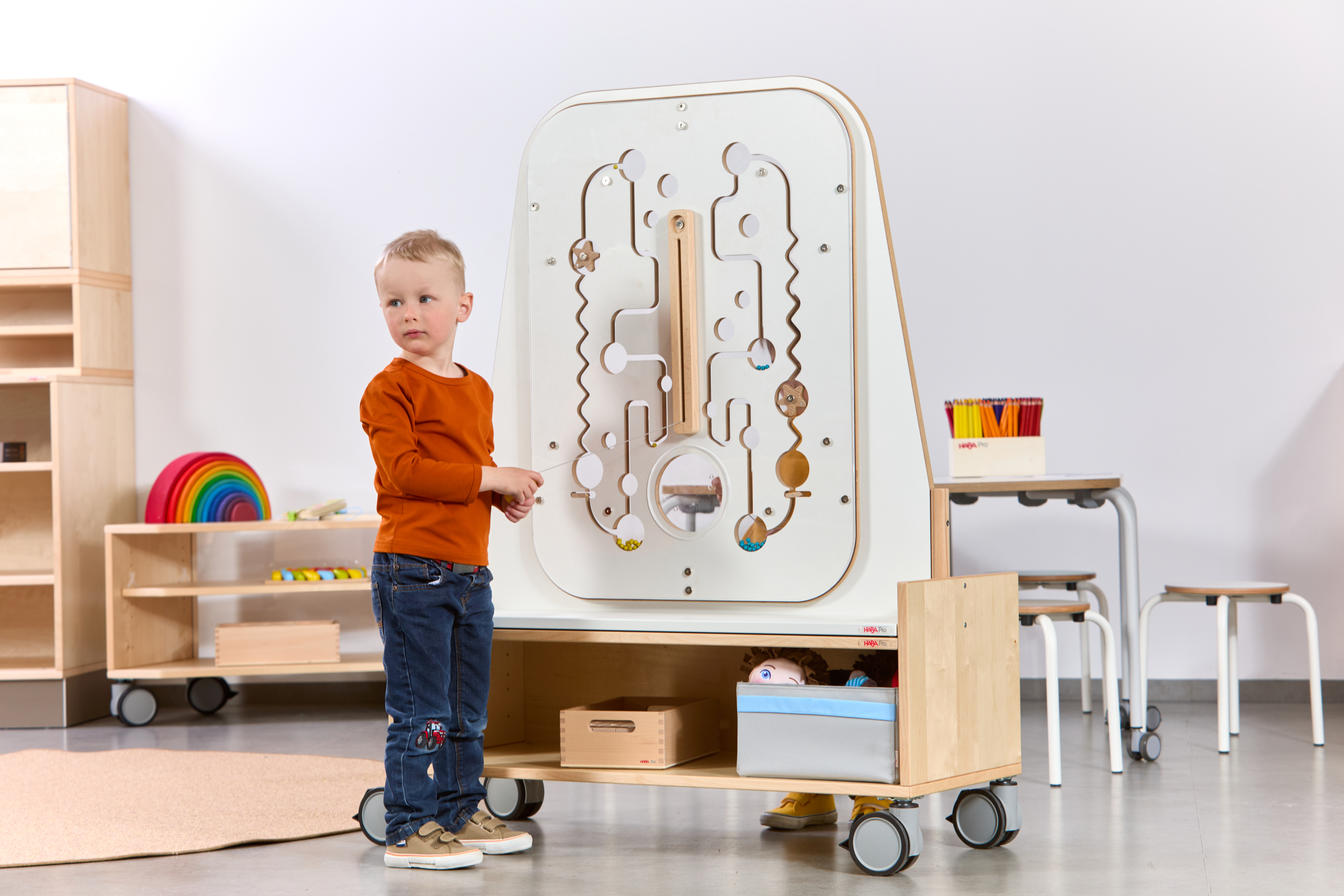 Met deze houder kunnen de Luminoo wandspeelplaten ook vrijstaand in de ruimte worden gebruikt. Wanneer de Luminoo wandspeelplaat op het element wordt gemonteerd, kunnen meerdere kinderen aan beide zijden spelen. Geschikt voor de Luminoo-wandspeelplaten 2011310, 2011311, 2011312 of 2011313. Materiaal: spaanplaat met decor. Afmetingen (zonder sokkel): B 95,7 x H 92,3 x D 42 cm. Materiaal: massief hout, licht gefineerd.