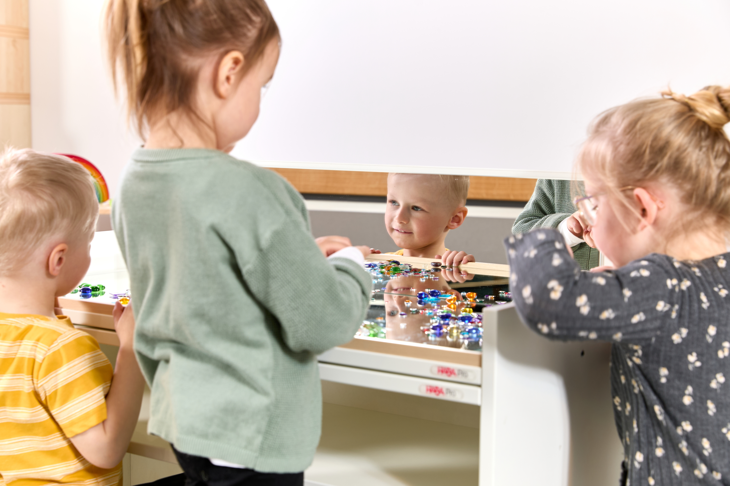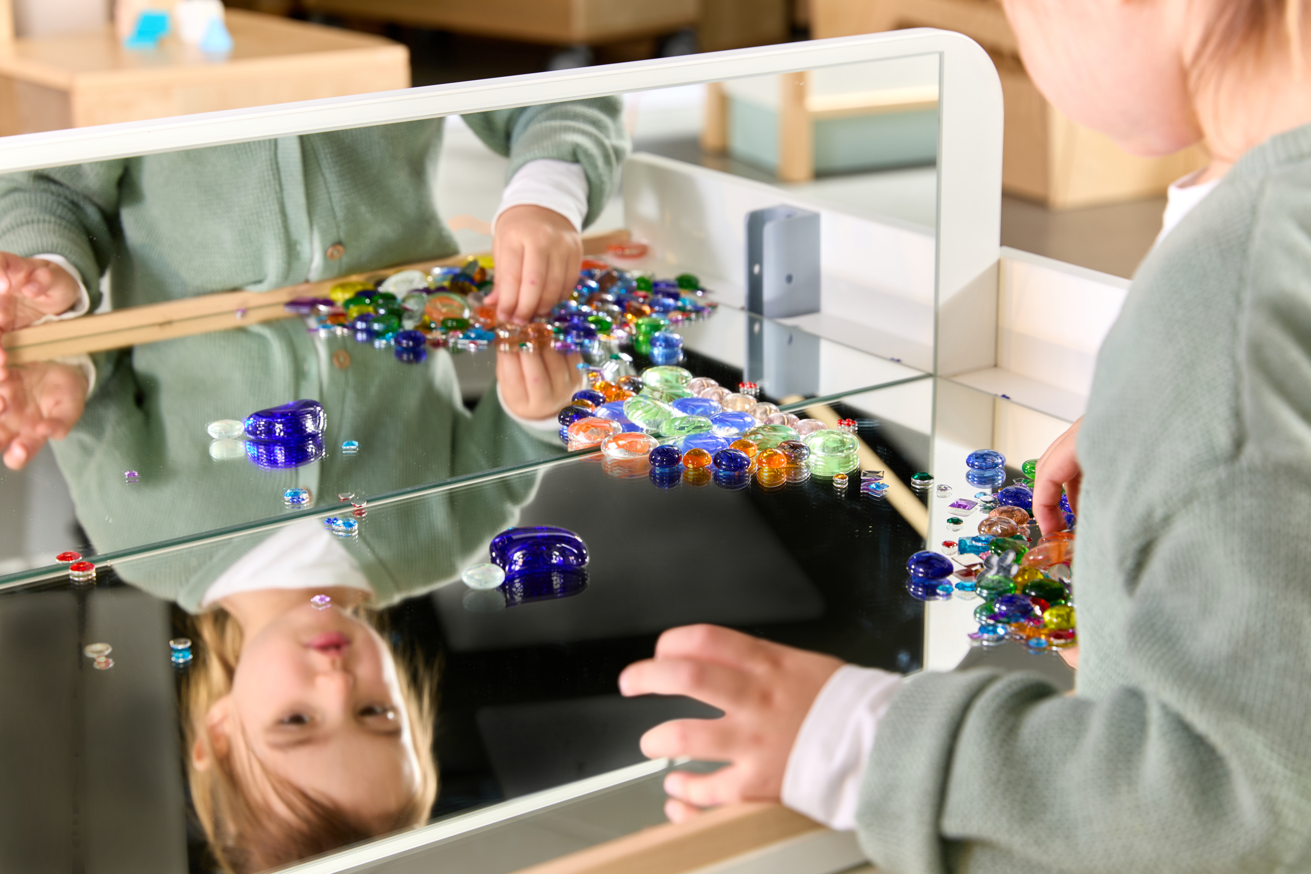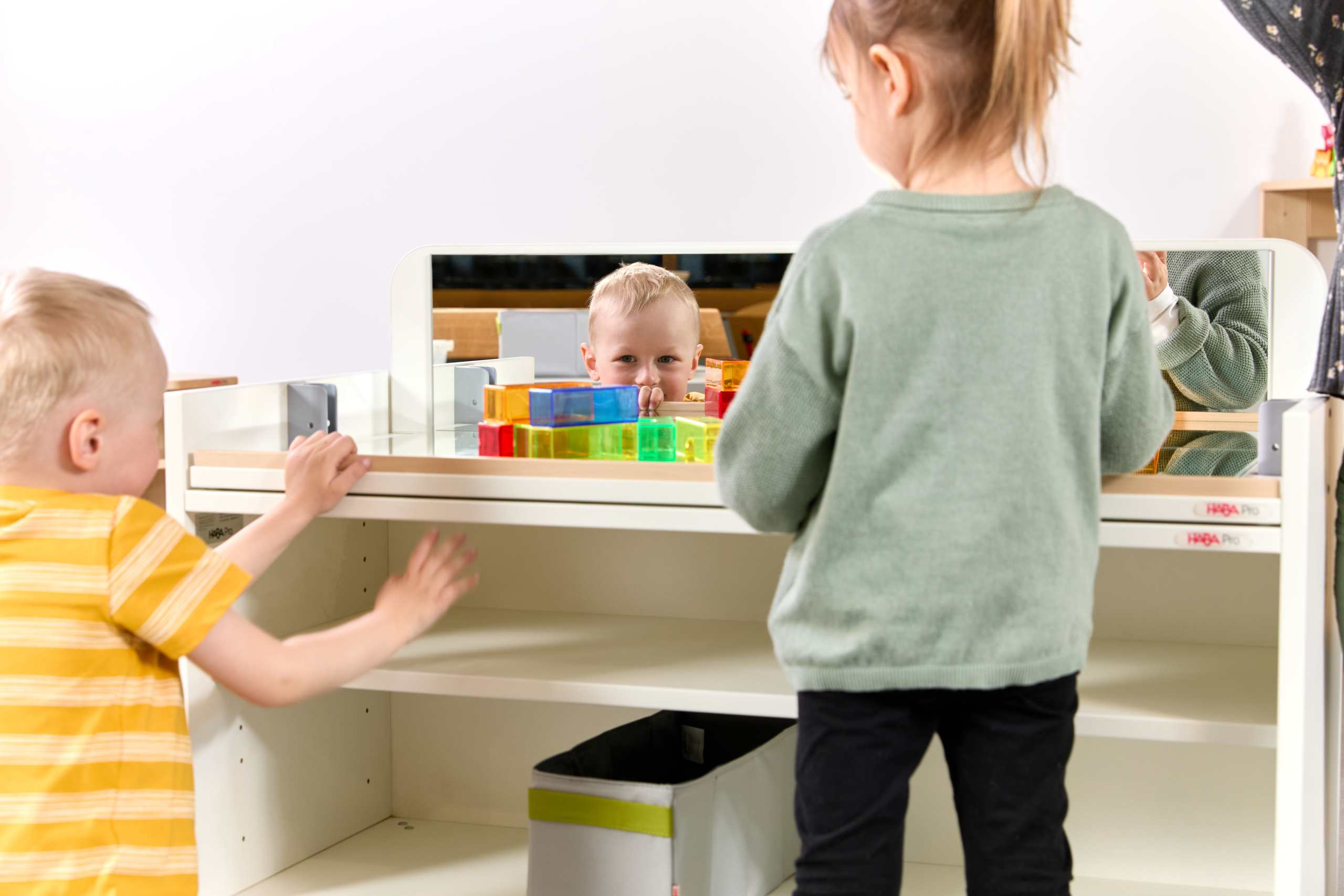 Spiegeltje, spiegeltje – welk vrolijk gezicht kijkt daar naar mij? Door het waarnemen van hun eigen spiegelbeeld en verschillende perspectieven van zichzelf en de ruimte, ontdekken kinderen steeds nieuwe, veranderende reflecties en versterken ze hun zelfperceptie. Materiaal: spaanplaat met decor. Afmetingen: B 95,7 x H 22,3 x D 42 cm.