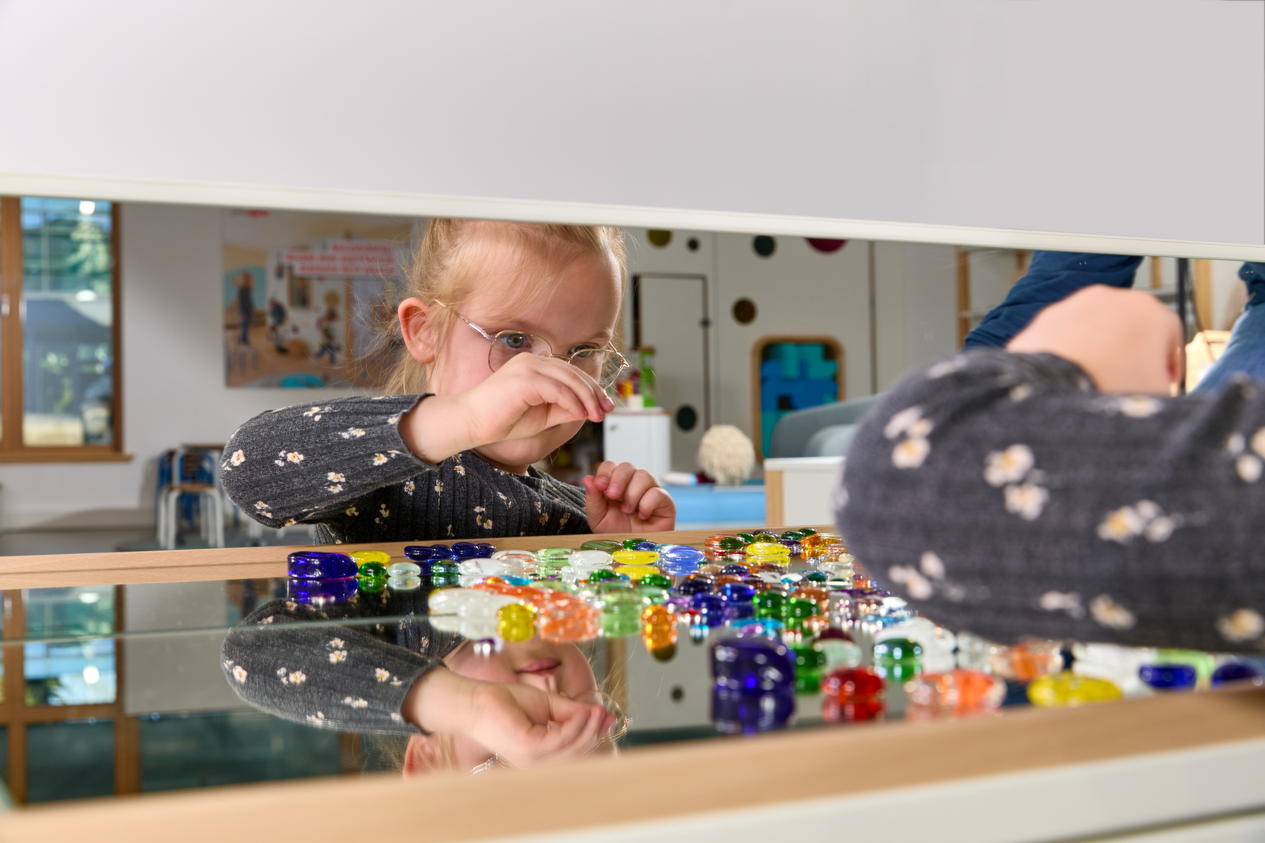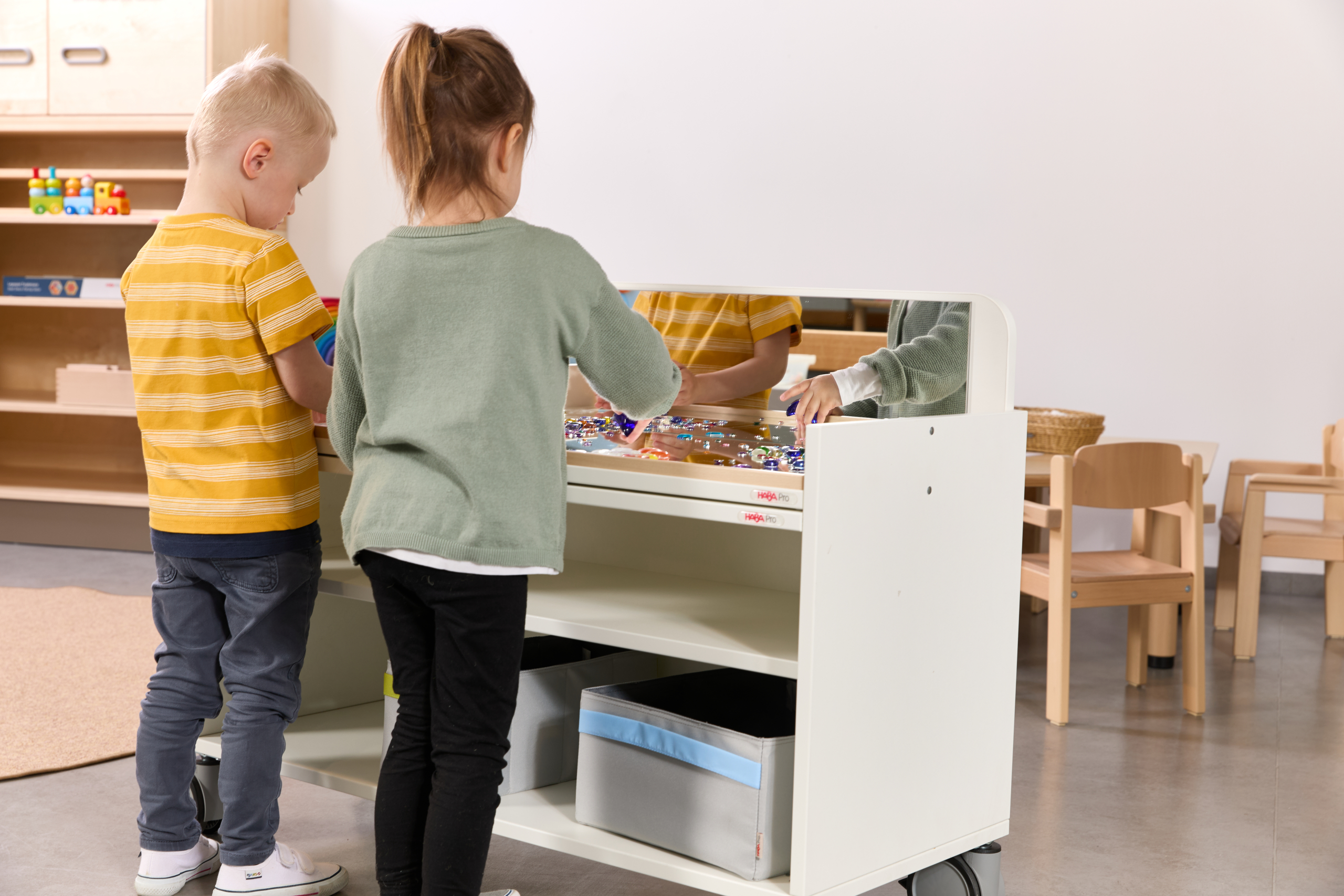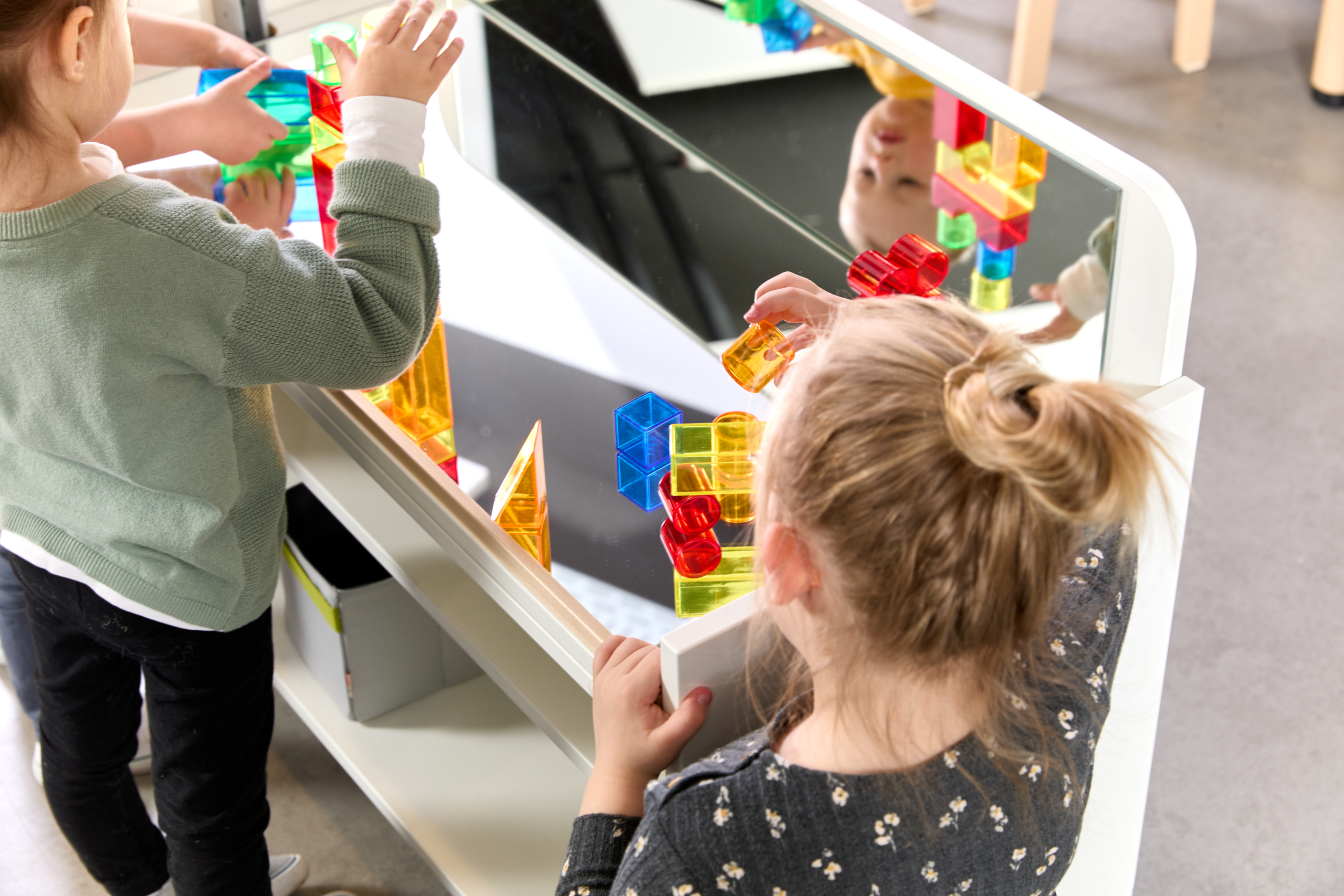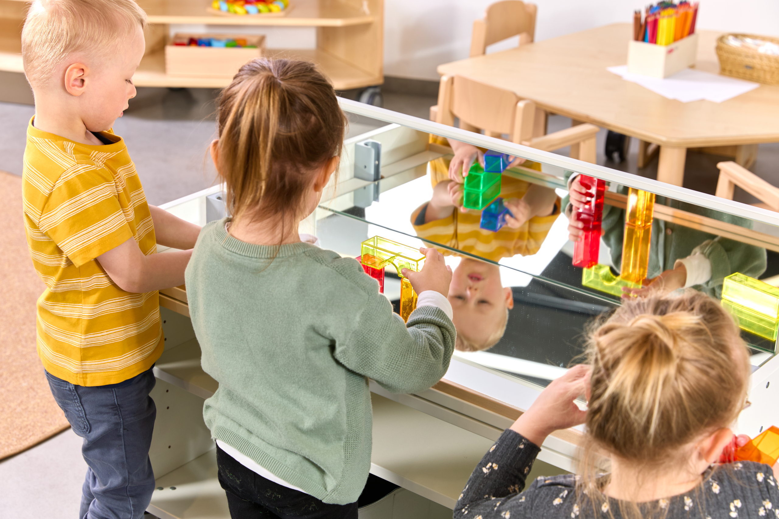 Spiegeltje, spiegeltje – welk vrolijk gezicht kijkt daar naar mij? Door het waarnemen van hun eigen spiegelbeeld en verschillende perspectieven van zichzelf en de ruimte, ontdekken kinderen steeds nieuwe, veranderende reflecties en versterken ze hun zelfperceptie. Materiaal: spaanplaat met decor. Afmetingen: B 95,7 x H 22,3 x D 42 cm.