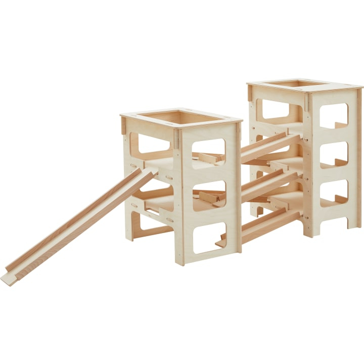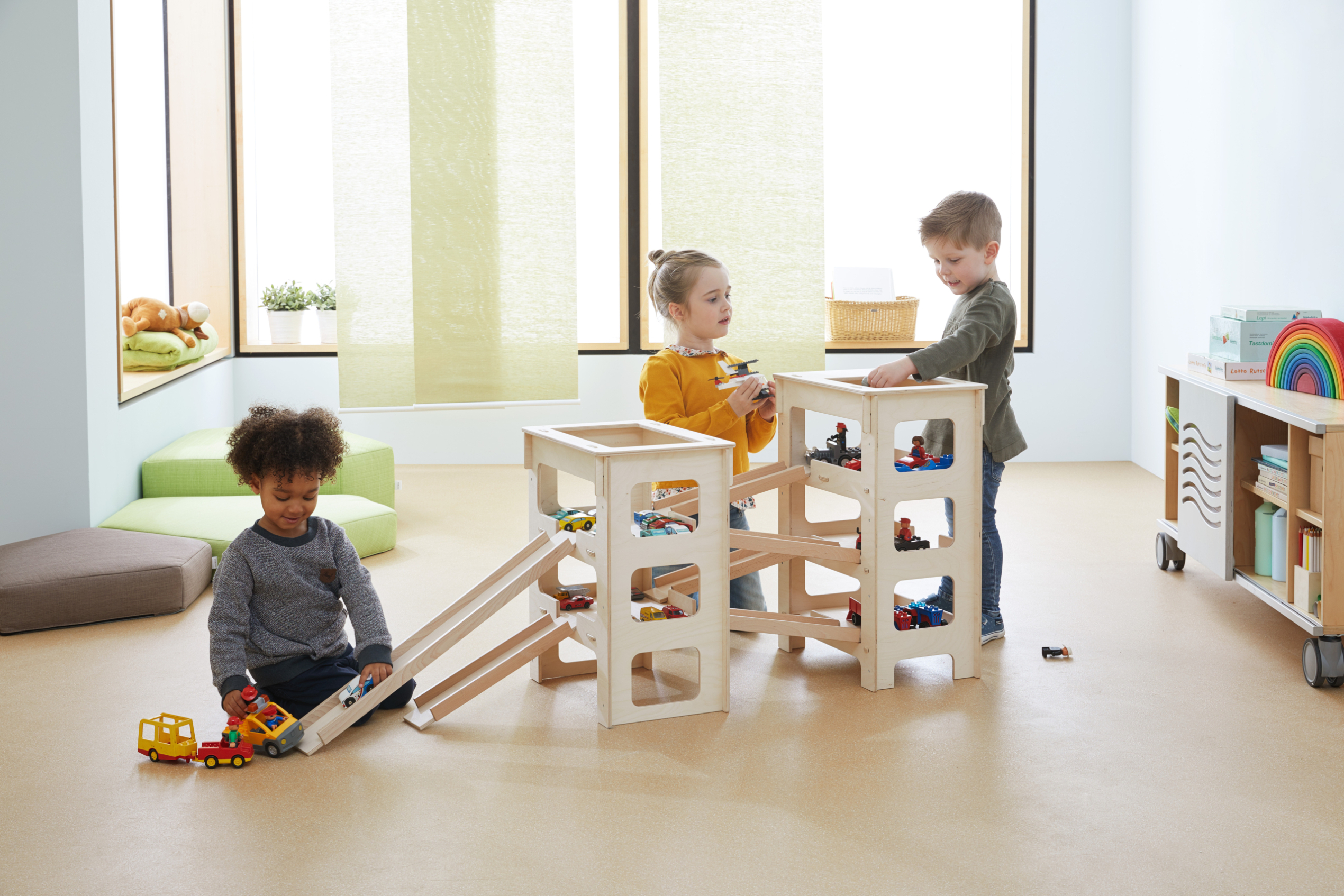 De parkeergarage stimuleert het spelen in een groep. Dankzij de grote openingen kunnen auto's makkelijk verplaats worden.