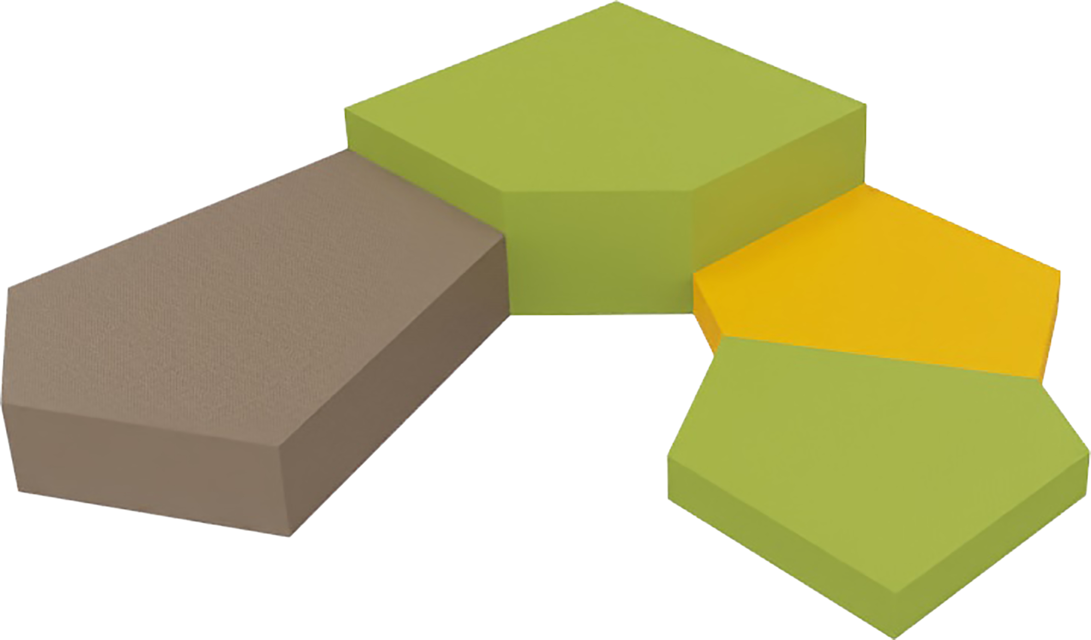 Bestaat uit Podium A, Art.-Nr. 1128571, in Nogabruin (CW30), Podium B, Art.-Nr. 1128577, in Jadegroen (CW50) en 2 x Podium C, Art.-Nr. 1128580, 1 x in Saffraangeel (CW10) en 1 x in Jadegroen (CW50). Materiaal: Schuimkern RG 28/70, bekleding: Stof CanvasBione Soft.
