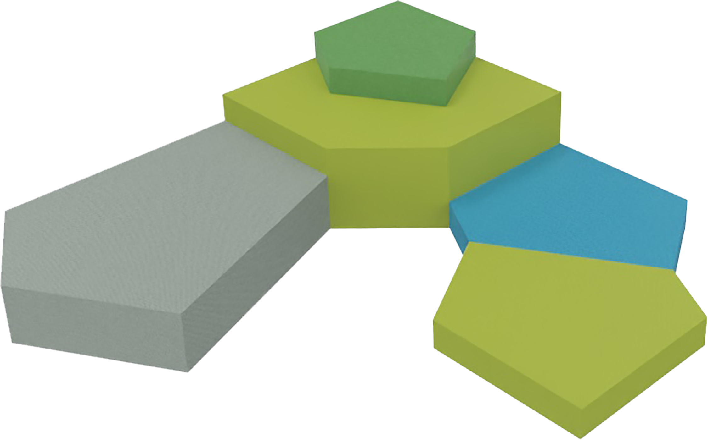 Bestaat uit Podium A, Art.-Nr. 1128571, in Wolkengrijs (CW20), Podium B, Art.-Nr. 1128577, in Jadegroen (CW50), Podium D, Art.-Nr. 1128585, in Avocado groen (CW51) en 2 x Podium C, Art.-Nr. 1128580, 1 x in Noors blauw (CW01) en 1 x in Jadegroen (CW50). Materiaal: Schuimkern RG 28/70, bekleding: Stof CanvasBione Soft.
