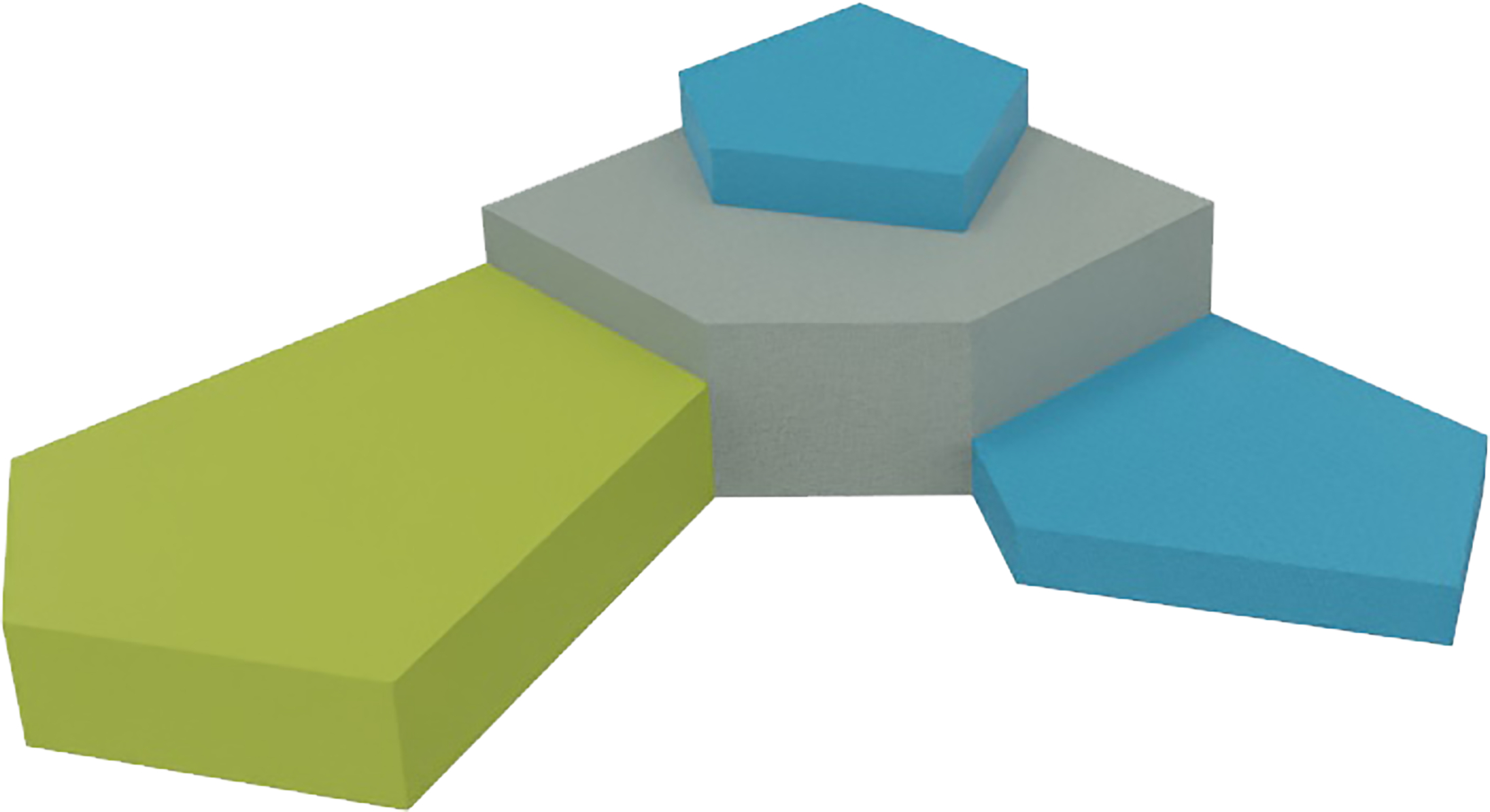 Bestaat uit Podium D, Art.-Nr. 1128585, in Noors blauw (CW01), Podium B, Art.-Nr. 1128577, in Wolkengrijs (CW20), 1 x Podium A, Art.-Nr. 1128571, in Jadegroen (CW50) en Podium C, Art.-Nr. 1128580, in Noors blauw (CW01). Materiaal: Schuimkern RG 28/70, bekleding: Stof CanvasBione Soft.