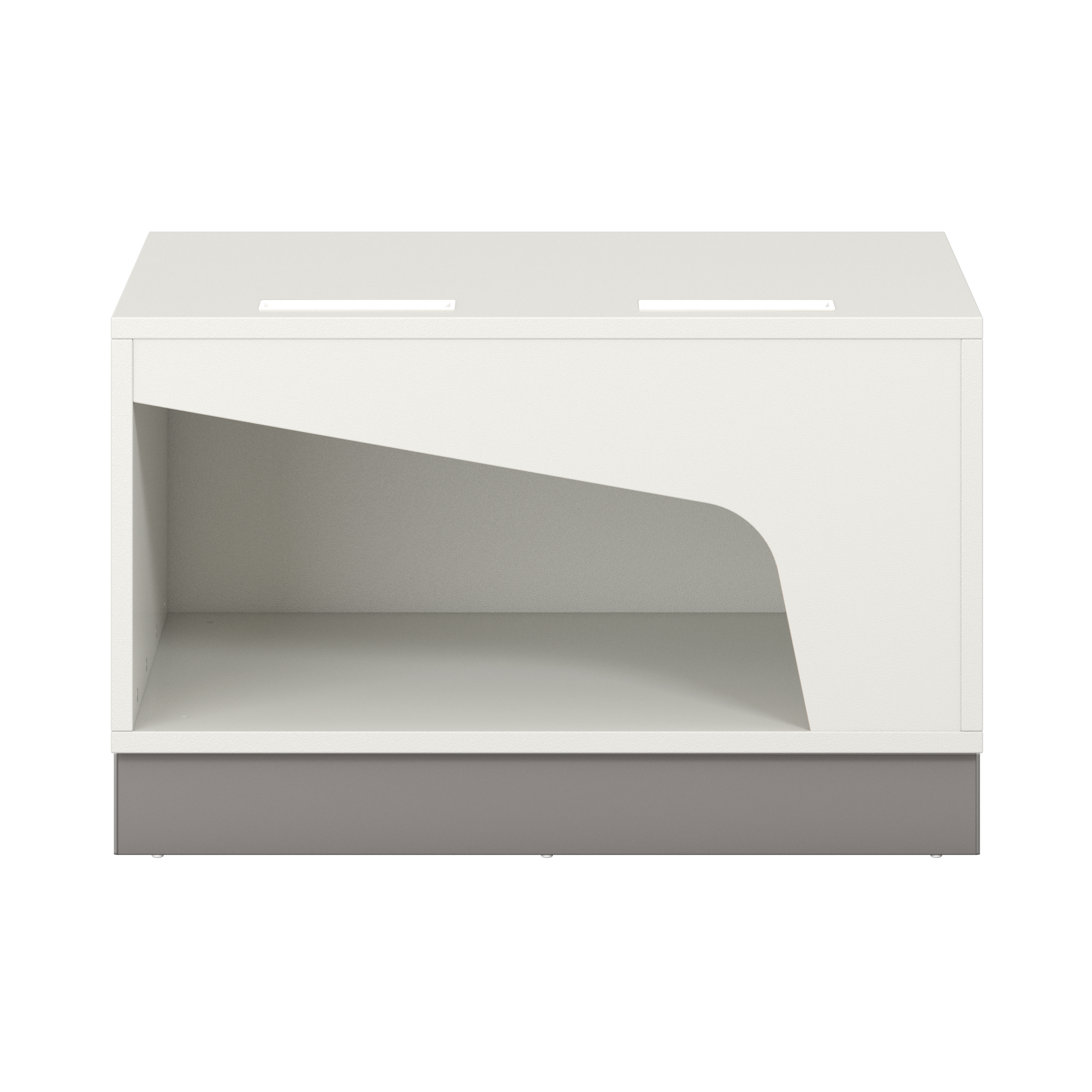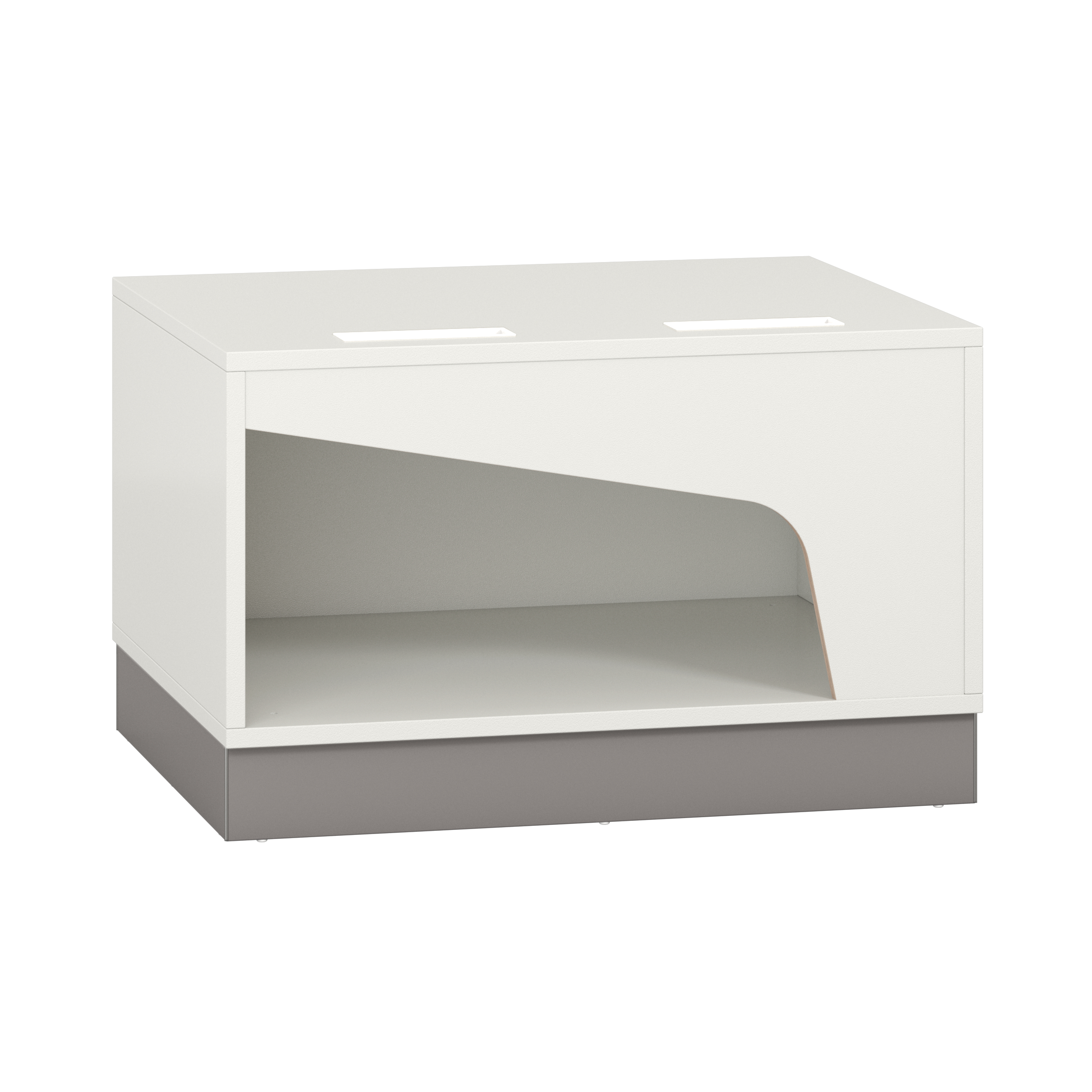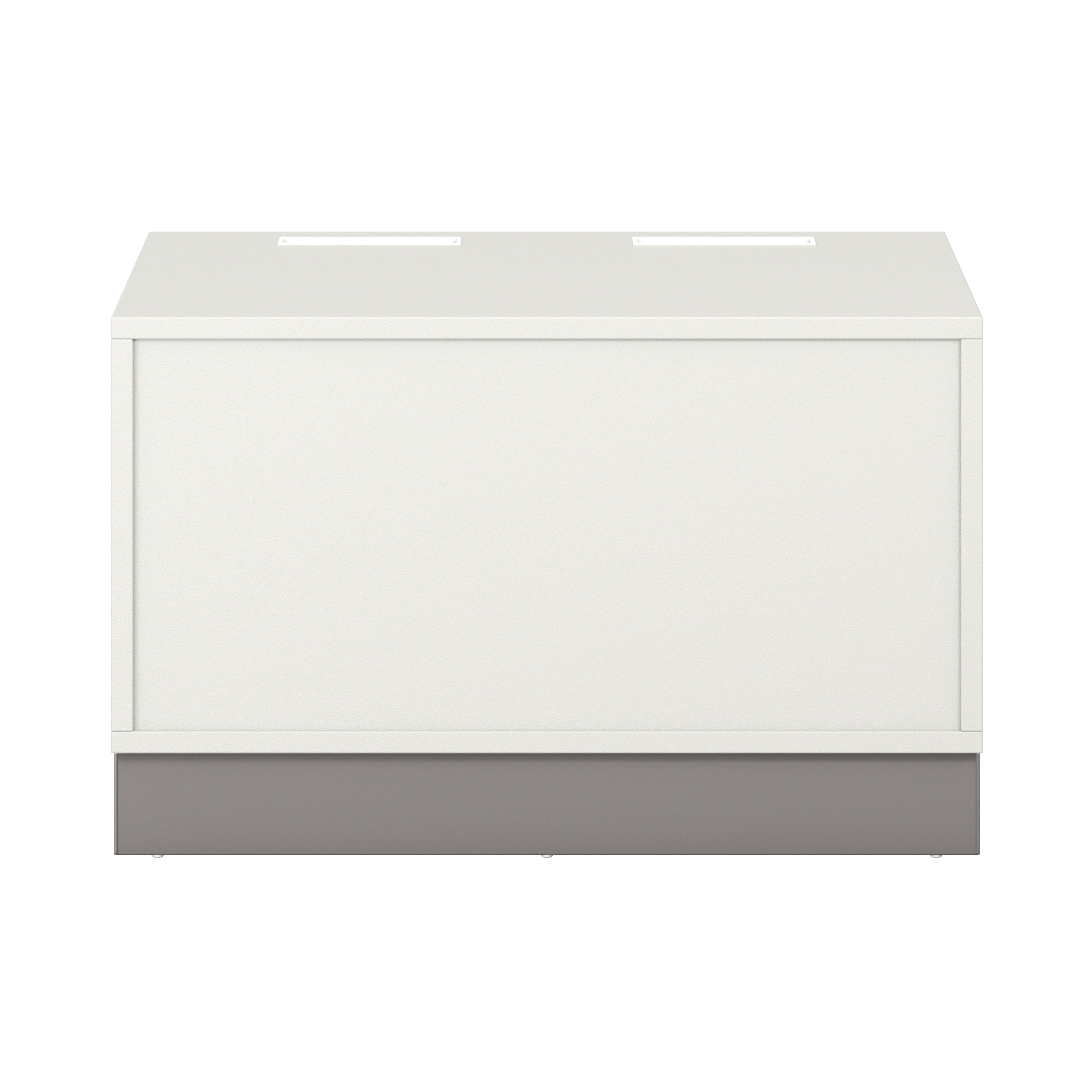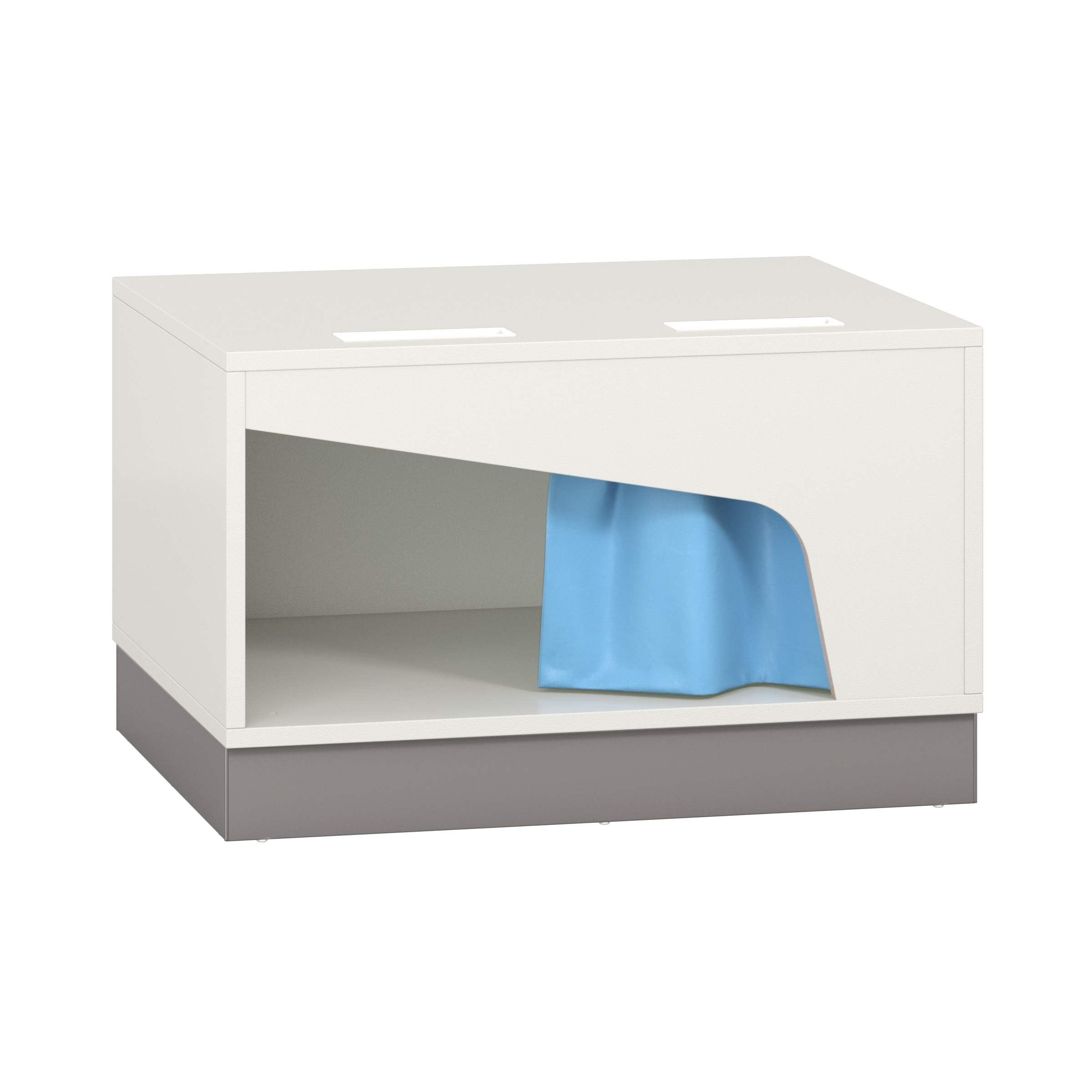 Kussens, tapijt of gordijnen graag apart bestellen. Opmerking: Alleen op de grond te plaatsen. Materiaal kast: 25 mm dikke decoratieve spaanplaat. Materiaal front: Duropal gecoat fineer multiplex. Afmetingen (zonder sokkel): B 100 x H 50 x D 80 cm.