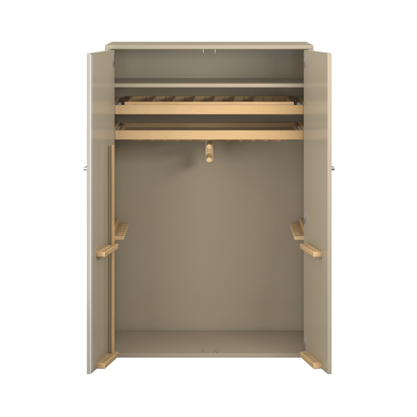 1 legplank, 1 uittrekbare rolbodem met verstelbare vakverdelers; 1 uittrekbare rolbodem met ondergeschroefde houder voor banden en springtouwen en 2 sleufrails voor het ophangen van maximaal 14 gymnastiekmolen. De deuren zijn voorzien van houders voor maximaal 12 gymnastiekstokken.