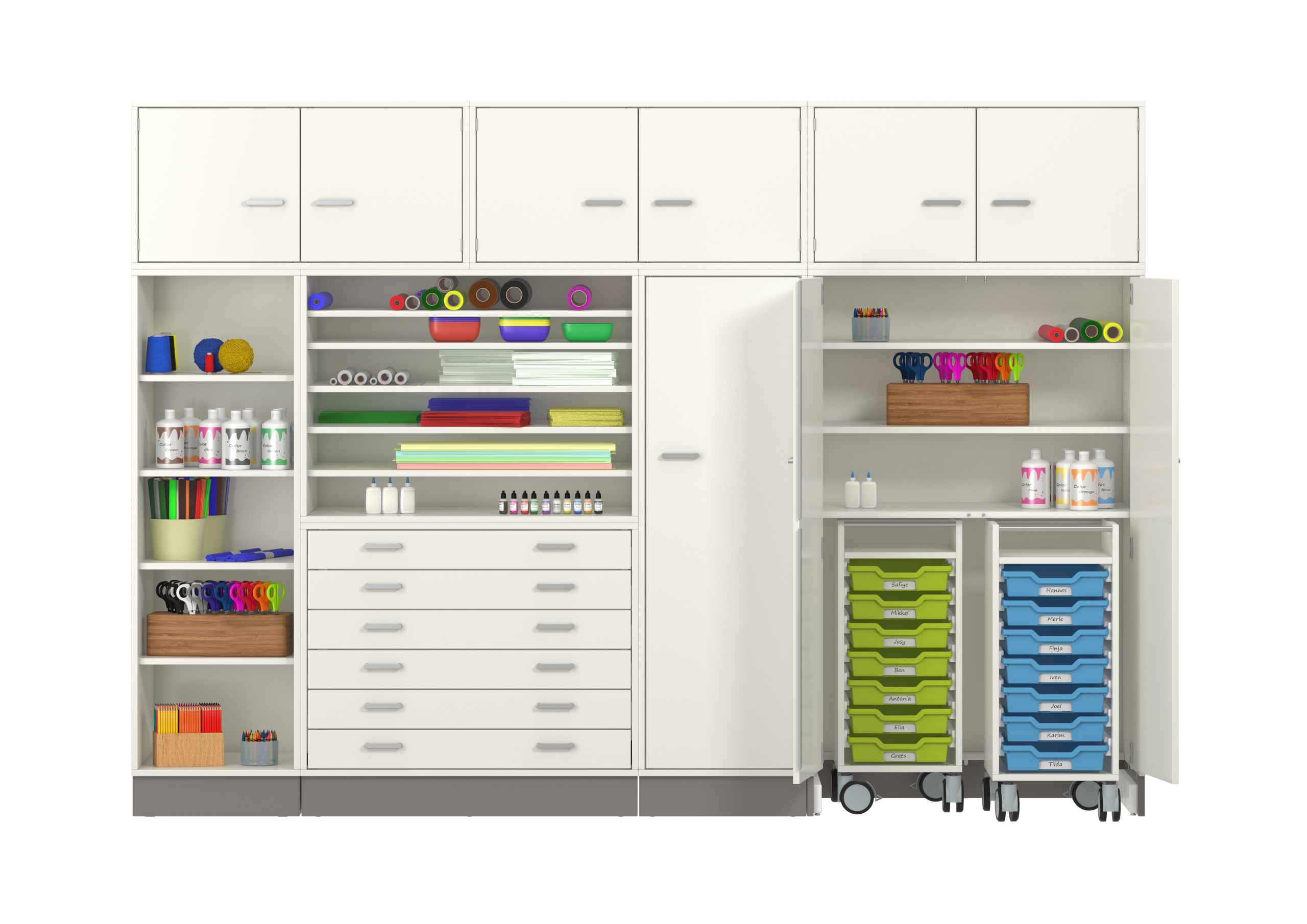 Of het nu scharen, lijm, papier of kleuren zijn... geen probleem. Het wandmeubel biedt veel opbergruimte voor allerlei schilder- en knutselspullen en houdt je creatieve ruimte georganiseerd. In de papierkast kun je het papier op kleur sorteren in de vakken. Er is veel ruimte voor verfflessen, pennen, kwasten enz. in de grote vakken van de hoge kasten. En je kunt de bovenkastjes bovenin het wandmeubel gebruiken om materialen in op te bergen die niet in kinderhanden zonder toezicht thuishoren. Het wandmeubel is gemaakt van echt berkenhout en kan dus veel aan, zelfs zware dingen! Bovendien creëert de natuurlijke nerf van het hout een warme en vriendelijke sfeer waarin kinderen hun fantasie en creativiteit kunnen uitleven. Natuurlijk kan het grote wandmeubel worden uitgebreid met andere Pureo kasten en planken. Zo kun je nog meer ruimte creëren. Opmerking: Bestel de materiaalbakken apart, decoratie niet inbegrepen. Materiaal: spaanplaat decor. Afmetingen: B 300 x H 212,5 x D 42 cm.
