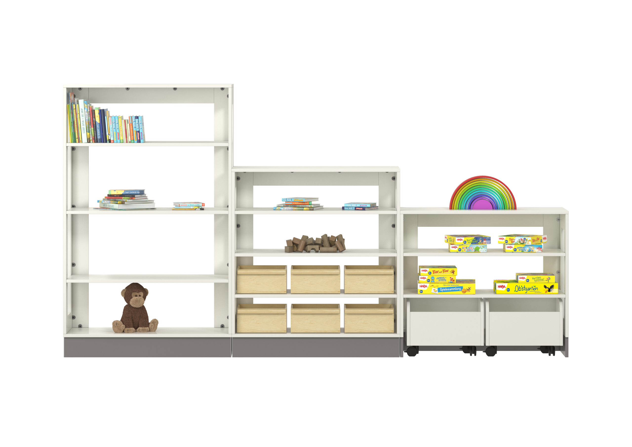 Deze kasten verdelen je groepsruimte handig in verschillende speel- en knutselruimtes. En omdat het planken zijn, kun je altijd zien wie waar staat. Opmerking: De kastcombinatie kan worden gebruikt als kamerscherm, maar moet aan één kant aan de muur worden bevestigd om omvallen te voorkomen. Decoratie niet inbegrepen. Materiaal: Spaanplaat decor wit. Afmetingen: B 300 x H 162,5 x D 42 cm.